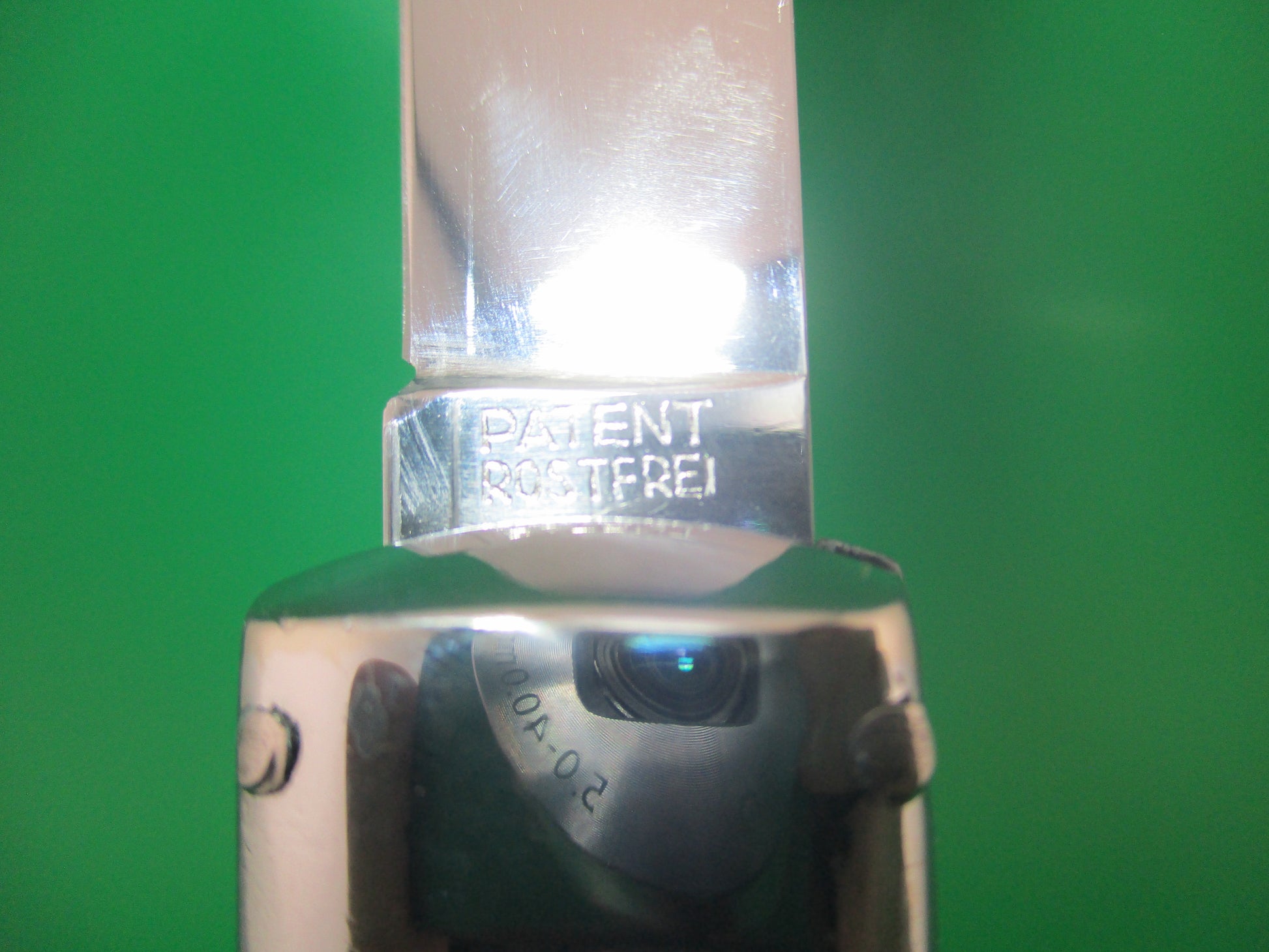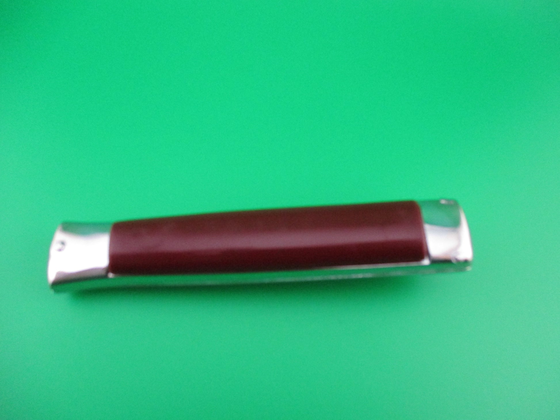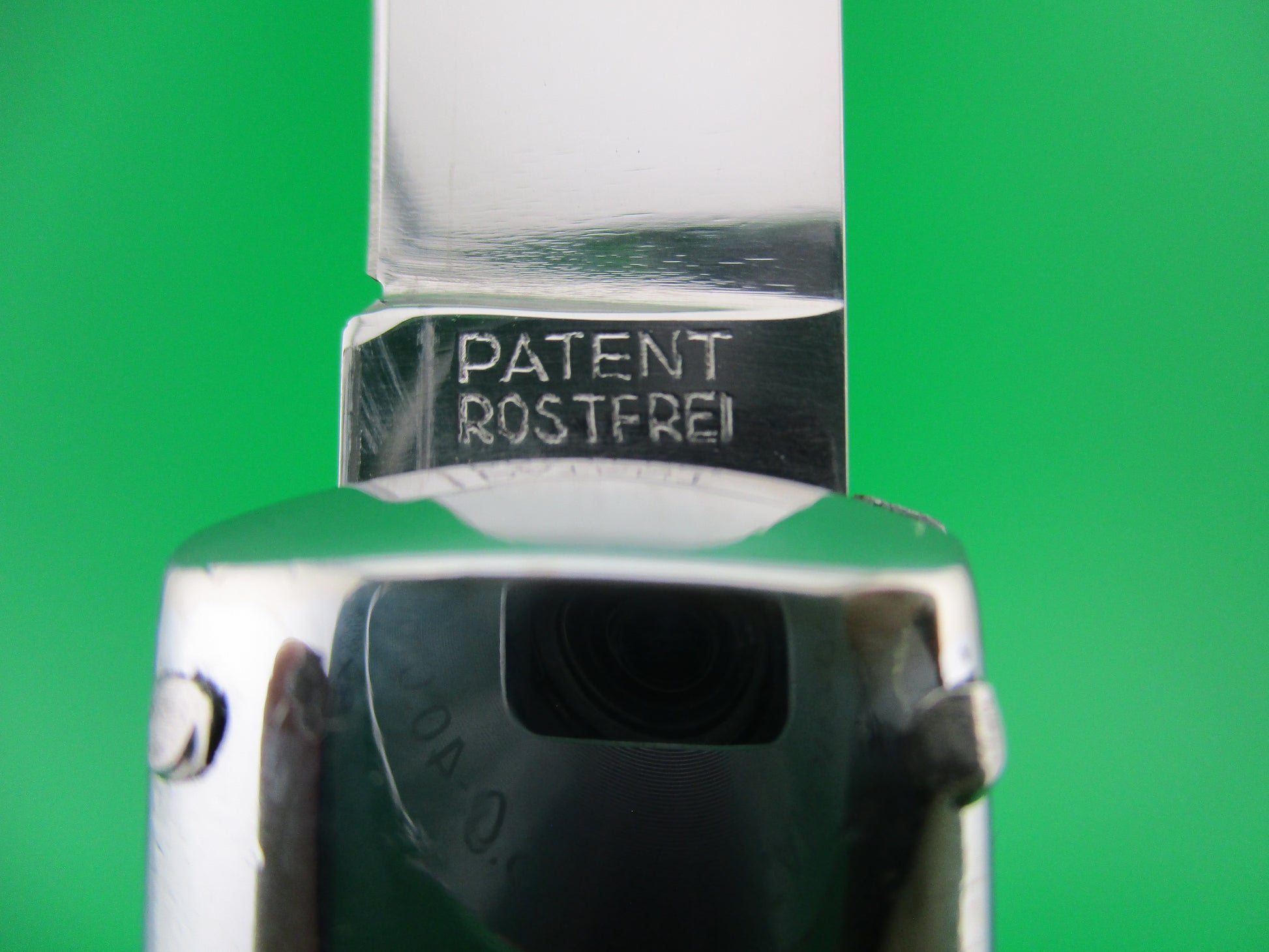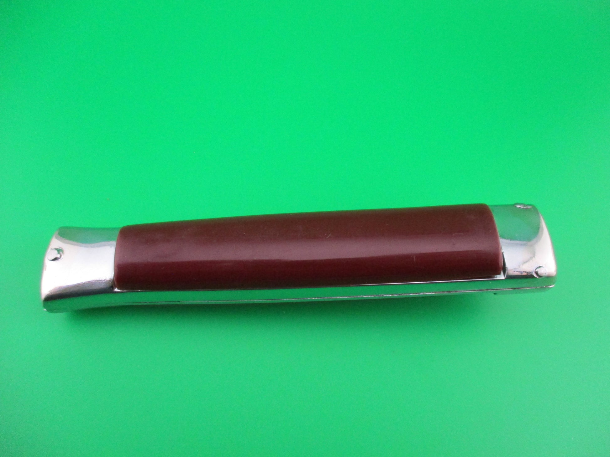 Vintage PATENT ROSTFREI 21cm Italian Rosa Uliana Primo OTF Burgundy switchblade knife. This DA Out the front automatic knife was made in Italy in the 1960s or 70s by Italian makers Rosa Uliana Primo. It measures just under 21cm (8 1/8 inches) open with non magnetic metal frame and burgundy colored synthetic scales (handles) and button. The knife is New Old Stock direct from Italy and works perfectly. The blade is 100% full with original finish and some light scratches from light use & opening. Blade flies open when the button is pushed forward and automatically retracts into the knife when button is pulled back. EX+ condition.