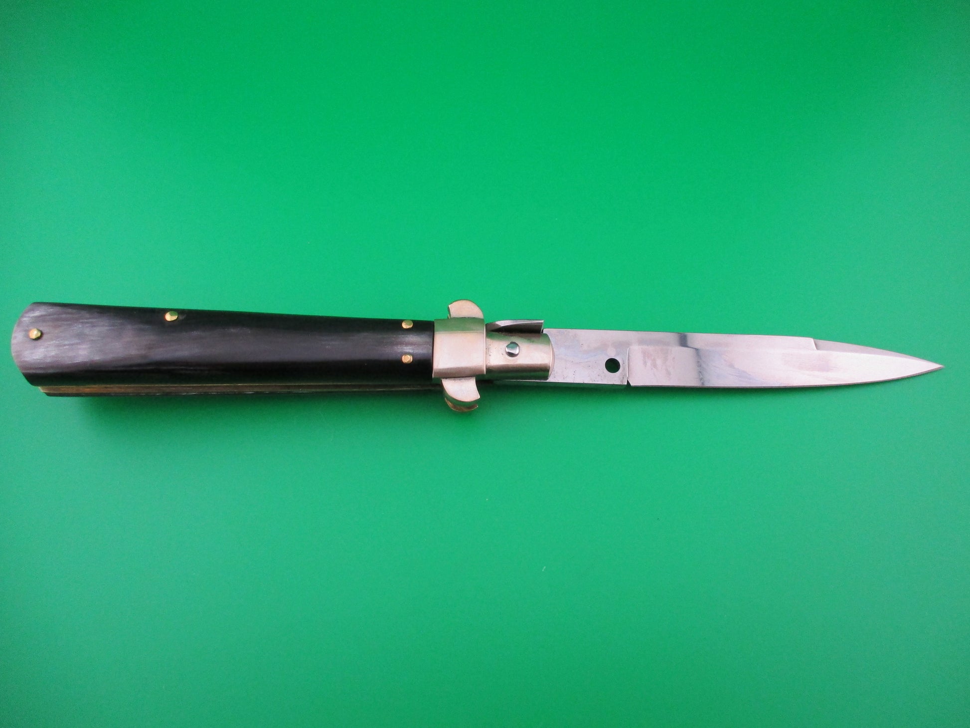 This knife was made by famed knife maker Renzo Pascotto of Italy. Renzo has been making switchblade knives for nearly 70 years and is a true craftsman. This knife was inspired by the switchblades made in Frosolone, Italy in the 1940s and 50s. It measures 10 inches (25cm) open and is a solid, well made knife. Genuine horn scales, German silver bolsters, button and safety cap. Thick, heavy knife that works perfectly. Blade tip seats deep, strong snap and tight lockup! Safety functions as it should.