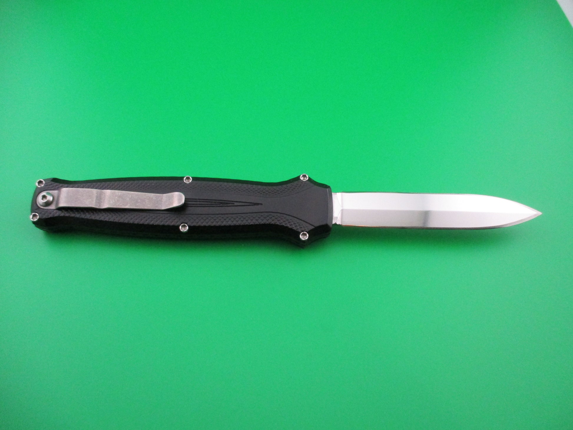 This is a modern Piranna OTF made in the USA. Not sure on the model number and it doesn't have a box, but appears to be brand new. The knife measures 4.75" closed and 8.25 inches open. The scales are black aluminum with a boot clip. Double action so the blade opens when you push forward and retracts automatically when you pull back on the thumb slide. The knife works GREAT.