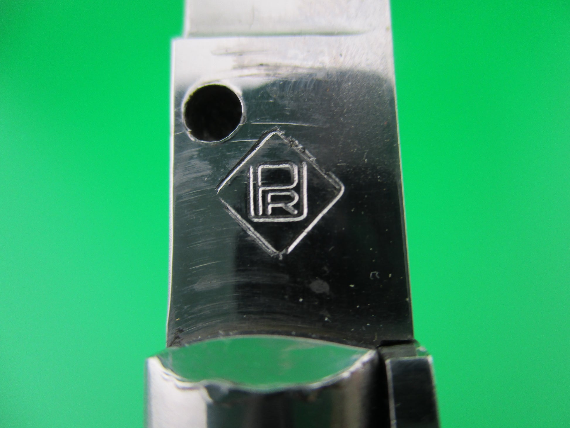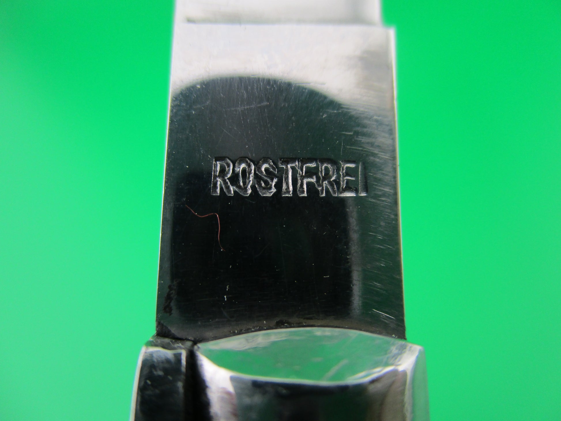This is a Beautiful vintage Rosa Uliana Primo marked Italian 8 inch swivel bolster knife. This knife is made to the standards of the older Italian stilettos with Gorgeous light green streaked horn. This knife is in like new condition. The blade is stamped with the P and R inside a U to show the maker and the backside is stamped ROSTFREI. Looks and works Great! Swivel bolster release.