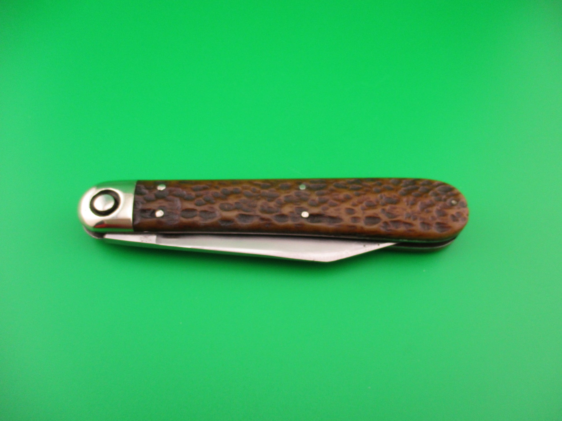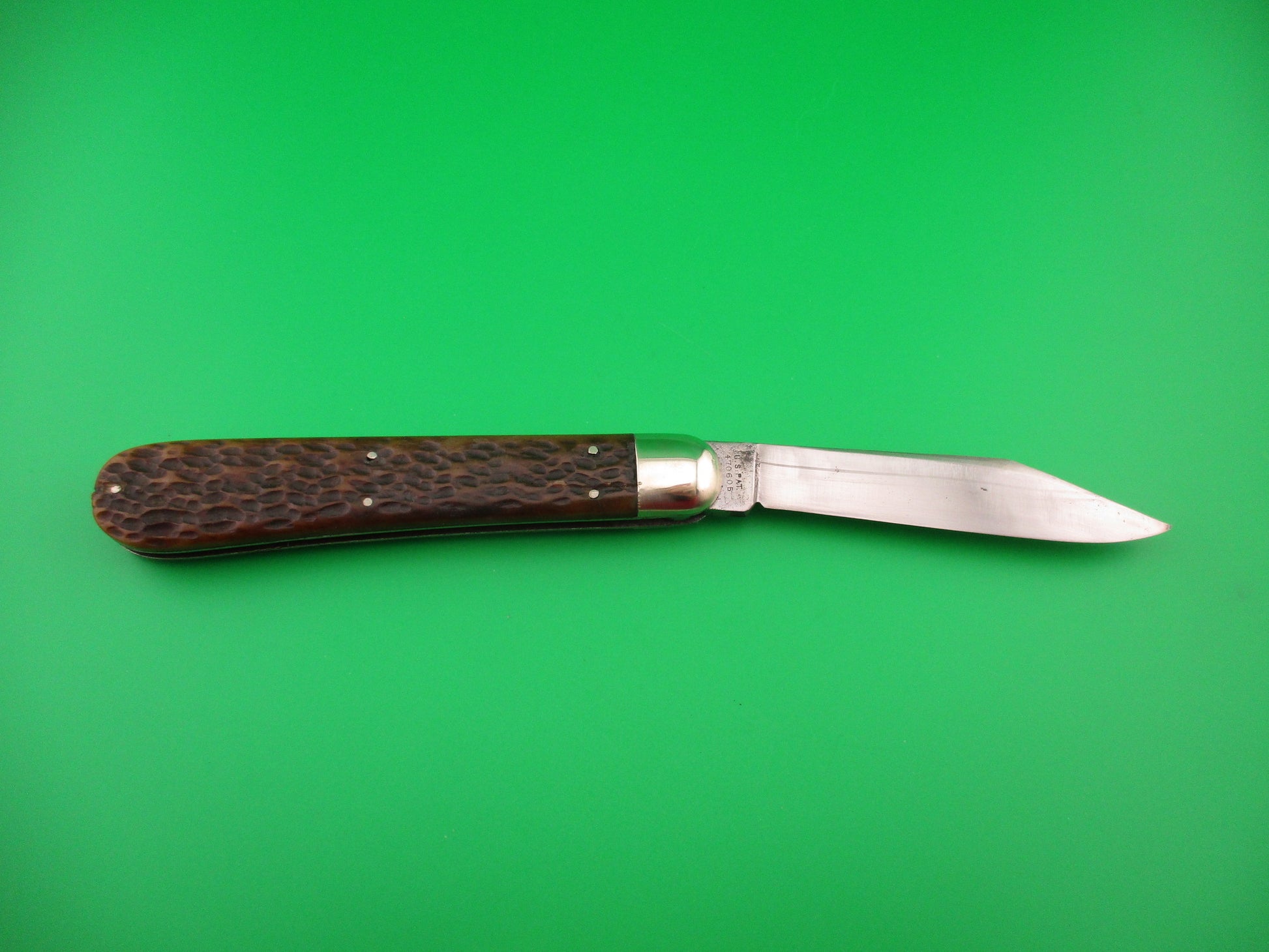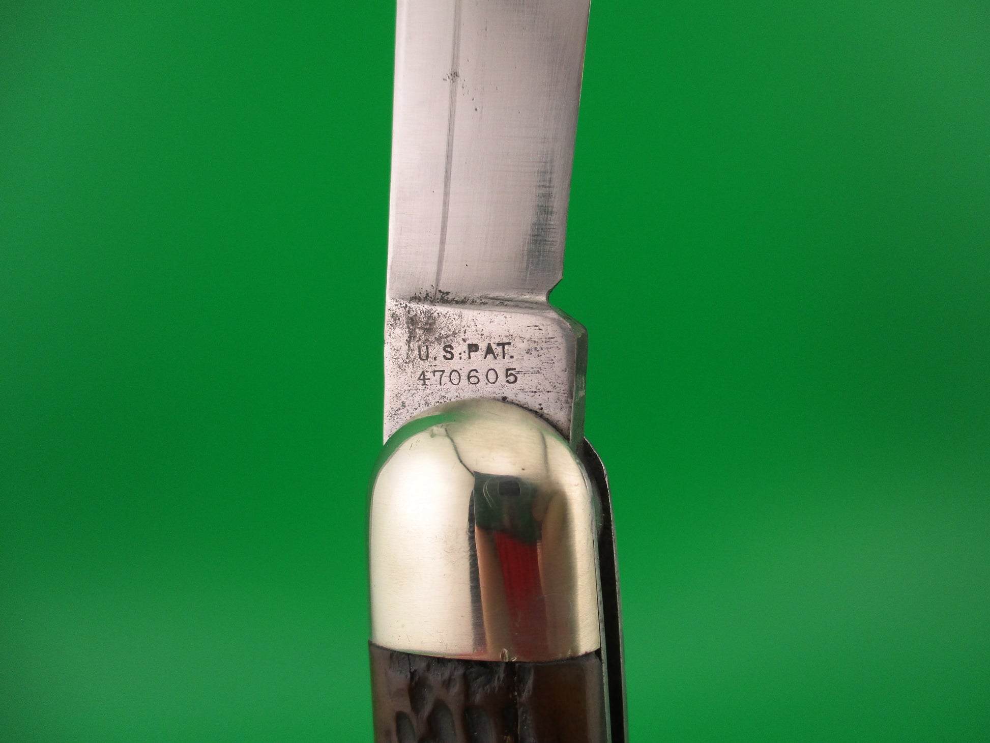 Vintage Press Button Knife Co #1000 INVINCIBLE model switchblade made in Walden, NY sometime between 1892 & 1914. The knife measures 4 7/8 inches closed and 8 1/2 inches open with steel liners and nickel silver bolsters & button. The clip blade is 1/4 inch short, but otherwise pretty full at about 95% and shiny with light scratches and marked PRESS BUTTON KNIFE CO WALDEN, NY on the tang though it's hard to read because of pitting and the backside is stamped US PAT 470605. The dyed jigged bone scales are in very good condition. The knife functions well with the blade tip deep in the well closed, opens strong when button pressed and good lockup with less than 1/16" movement up and down and 1/8 side to side at the tip. Does rattle if shaken when open as most of these 100+ year old switchblades do. VG+ condition.