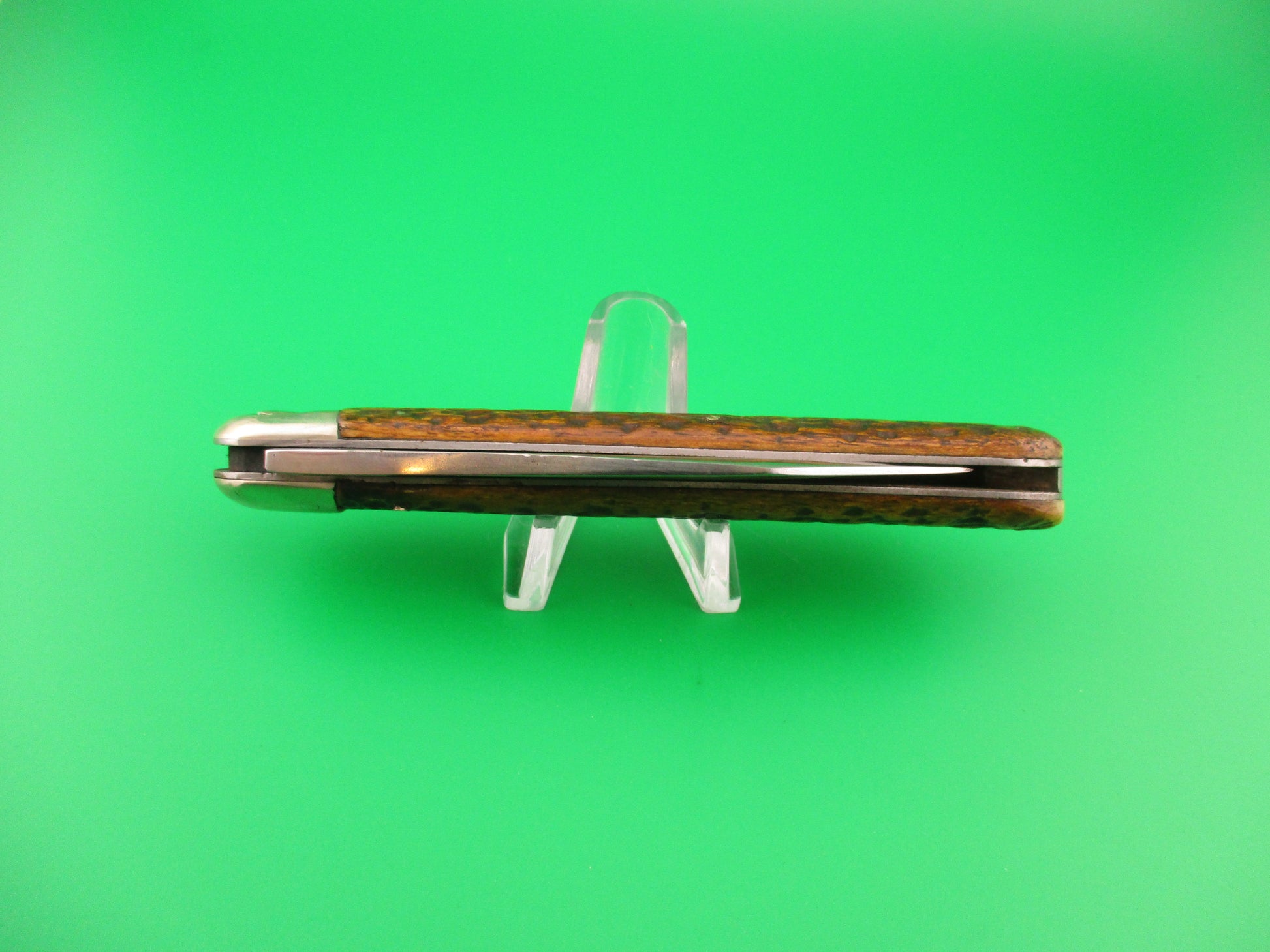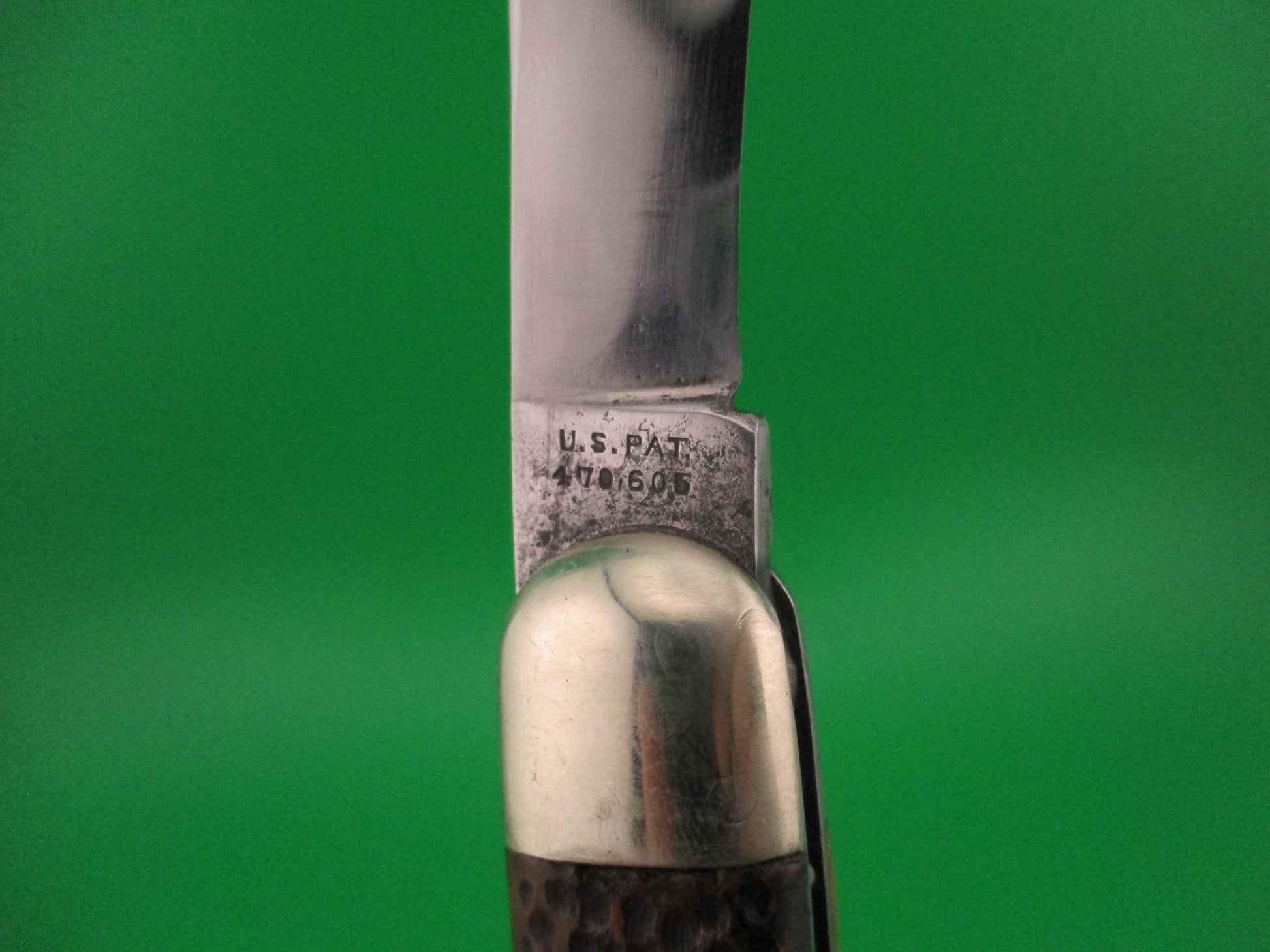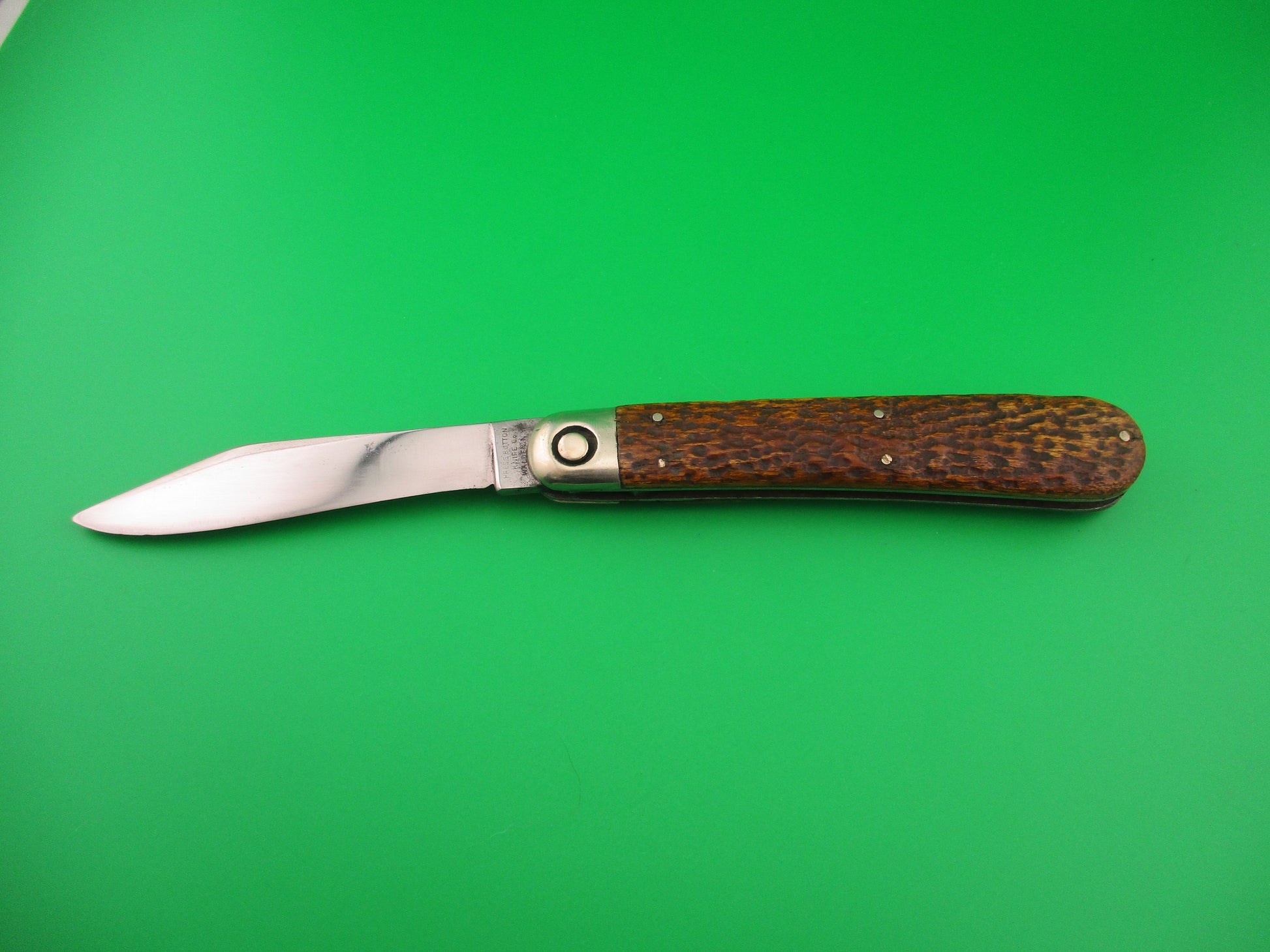 Vintage Press Button Knife Co #1000 INVINCIBLE model switchblade made in Walden, NY sometime between 1892 & 1914. The knife measures 4 7/8 inches closed and 8 7/16 inches open with steel liners and nickel silver bolsters, button & pins. The clip blade is 1/4 inch short, but otherwise pretty full at about 94% and shiny with light scratches and marked PRESS BUTTON KNIFE CO WALDEN, NY on the tang and backside is stamped US PAT 470605. The dyed picked bone scales are in very good condition. The knife functions well with the blade tip deep in the well closed, opens strong when button pressed and excellent lockup with less than 1/16" movement at the tip. No rattle if shaken when open. VG+ condition.
