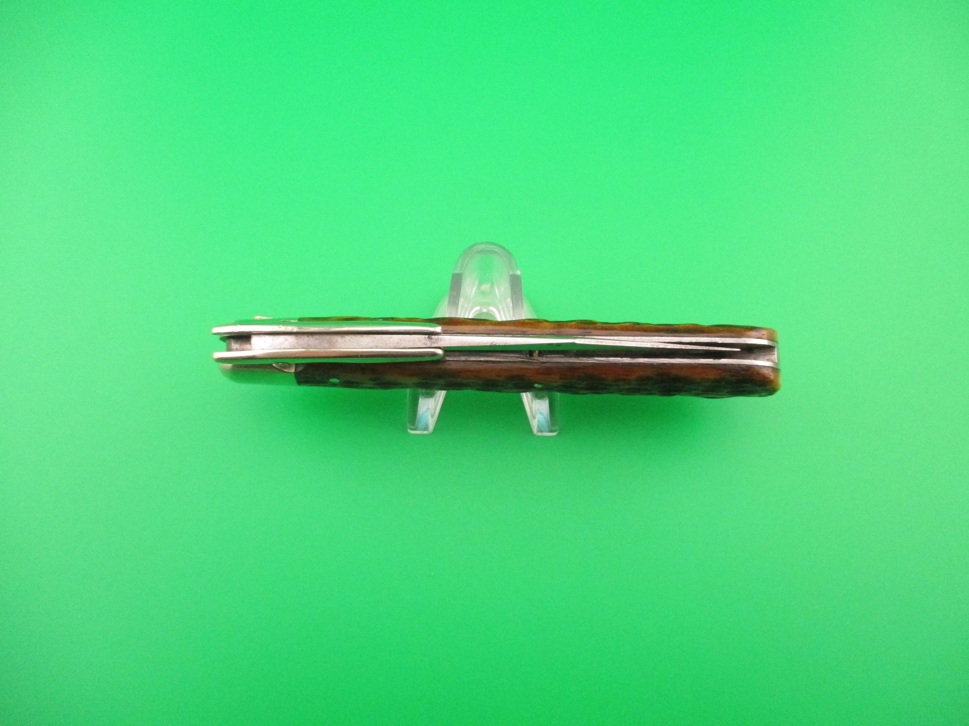 PRESS BUTTON KNIFE CO #1005 the VICTOR Antique switchblade knife made by the Press Button Knife Co a division of the Walden Knife Co of Walden, NY sometime before 1923. This model was called "The VICTOR" (originally etched on the face of the blade) and it's the largest model that they made. It's the same size as the more common Invincible model, but with folding guards and it measures 4 7/8 inches closed and 8 5/8 inches open with steel liners and nickel silver bolsters, button and folding guards. The clip blade is 98% full or better and shiny with some light scratches and is about 1/8 inch short and the tang is marked PRESS BUTTON KNIFE CO WALDEN NY on the front of the tang. The dyed jigged bone scales are very attractive and in excellent condition. The knife works great with blade tip well below the liners closed, Strong snap and average lockup with about 1/16" movement each way at the tip. Rattles if shaken with blade open as most of these 100 year old switchblades do. EX condition.