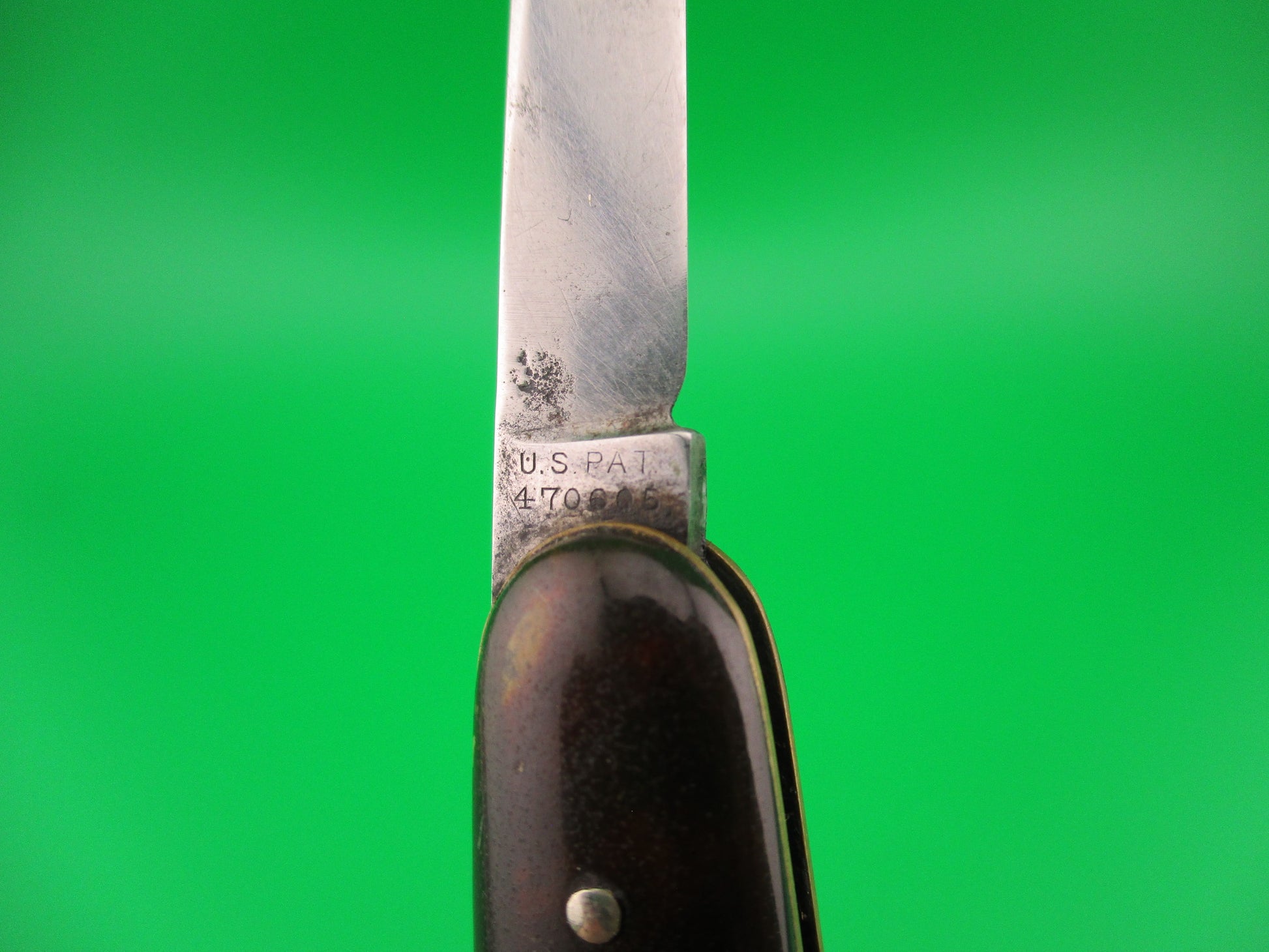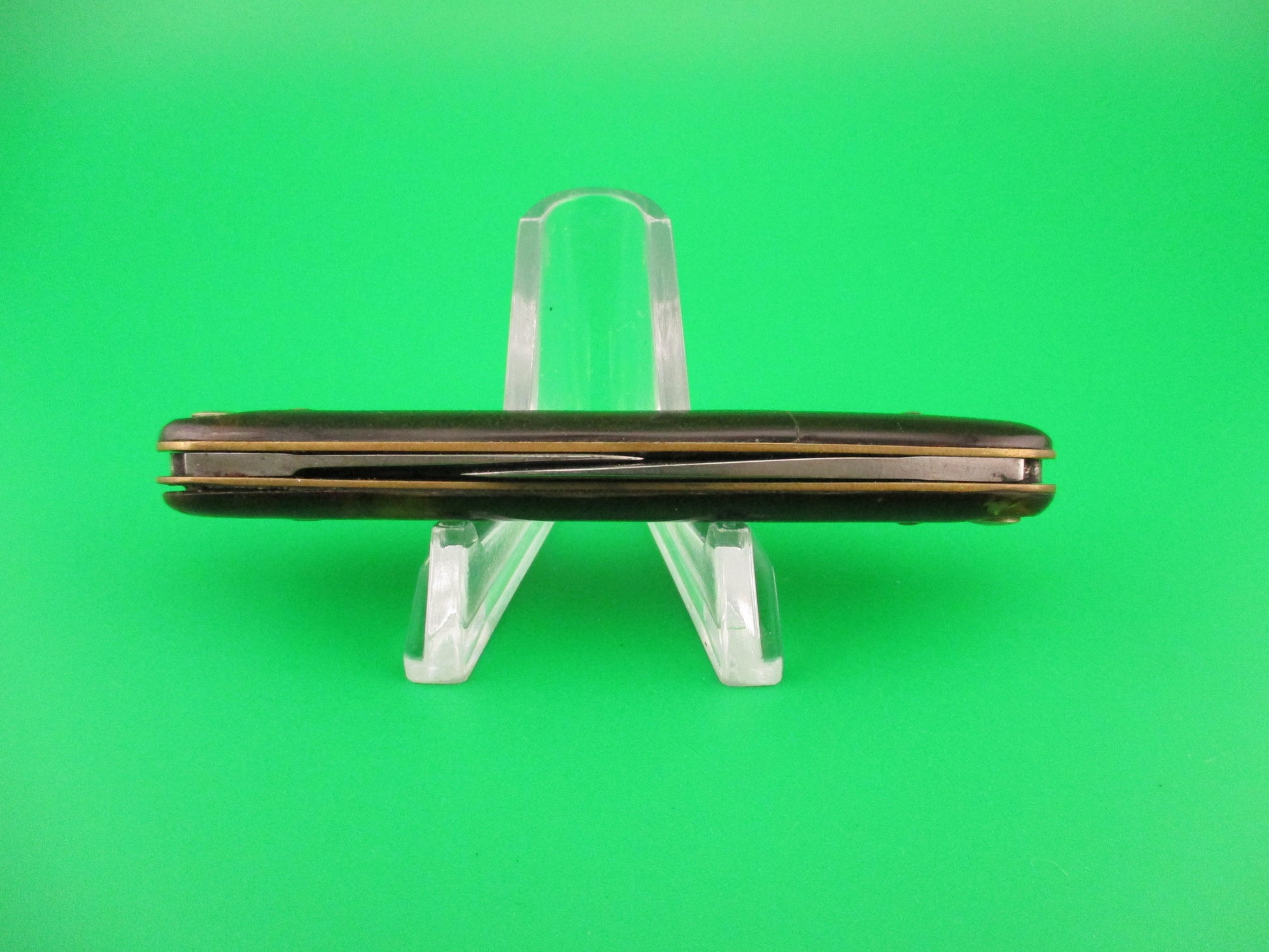 Antique Press Button Knife Co model #102 medium double switchblade knife with tortoise celluloid handles made in Walden, NY sometime between 1892 and 1923. It measures 3 3/8" closed and 6 9/16 inches with both blades open and has brass liners and nickel silver buttons. It is the middle one of three sizes of switchblade doubles made by the company. The blades are mostly full and sharpened with lots of light scratches and a couple of pepper spots. Both blades are marked PRESS BUTTON KNIFE CO WALDEN NY and both have US PAT 470605 on the back of the tangs. The tortoise celluloid scales are in very good condition with one straight crack across the back scale. The knife works well with both blade tips below the liners closed, good snap and very good lockup with less than 1/16" at the tips. Both blades have some kickback because the spring is strong. Barely rattles if shaken with blades open. EX- condition.