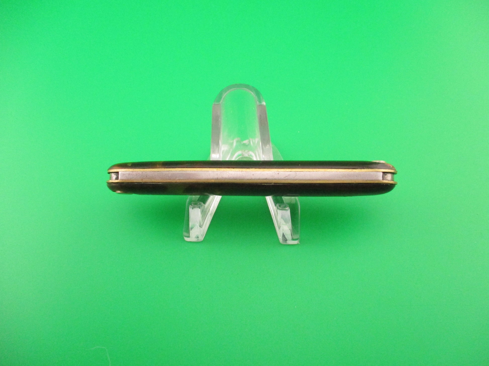 Antique Press Button Knife Co model #102 medium double switchblade knife with tortoise celluloid handles made in Walden, NY sometime between 1892 and 1923. It is the middle one of three sizes of switchblade doubles made by the company. It measures 3 3/8" closed and 6.75 inches with both blades open and has brass liners and nickel silver buttons. Spear/pen blade combo with spear blade around 90% and the pen blade 95% full with light scratches, patina and some light spotting. Both blades are marked PRESS BUTTON KNIFE CO WALDEN NY on the front and the small blade has US PAT 470605 on the back, but the large blade has PATENT APPLIED FOR on the back. I believe the patent this is referring to is for a safety that PBKC experimented with briefly around 1906 that was not successful so they used up the leftover blades on other knives. The tortoise celluloid scales are in very good condition with minor scuffs from handling. The knife works well with both blade tips below the liners closed, good snap and tight lockup on the small blade and with less than 1/8" at the tip of he large blade. Very little kickback. Rattles if shaken with blades open as most of these do. VG+ condition.