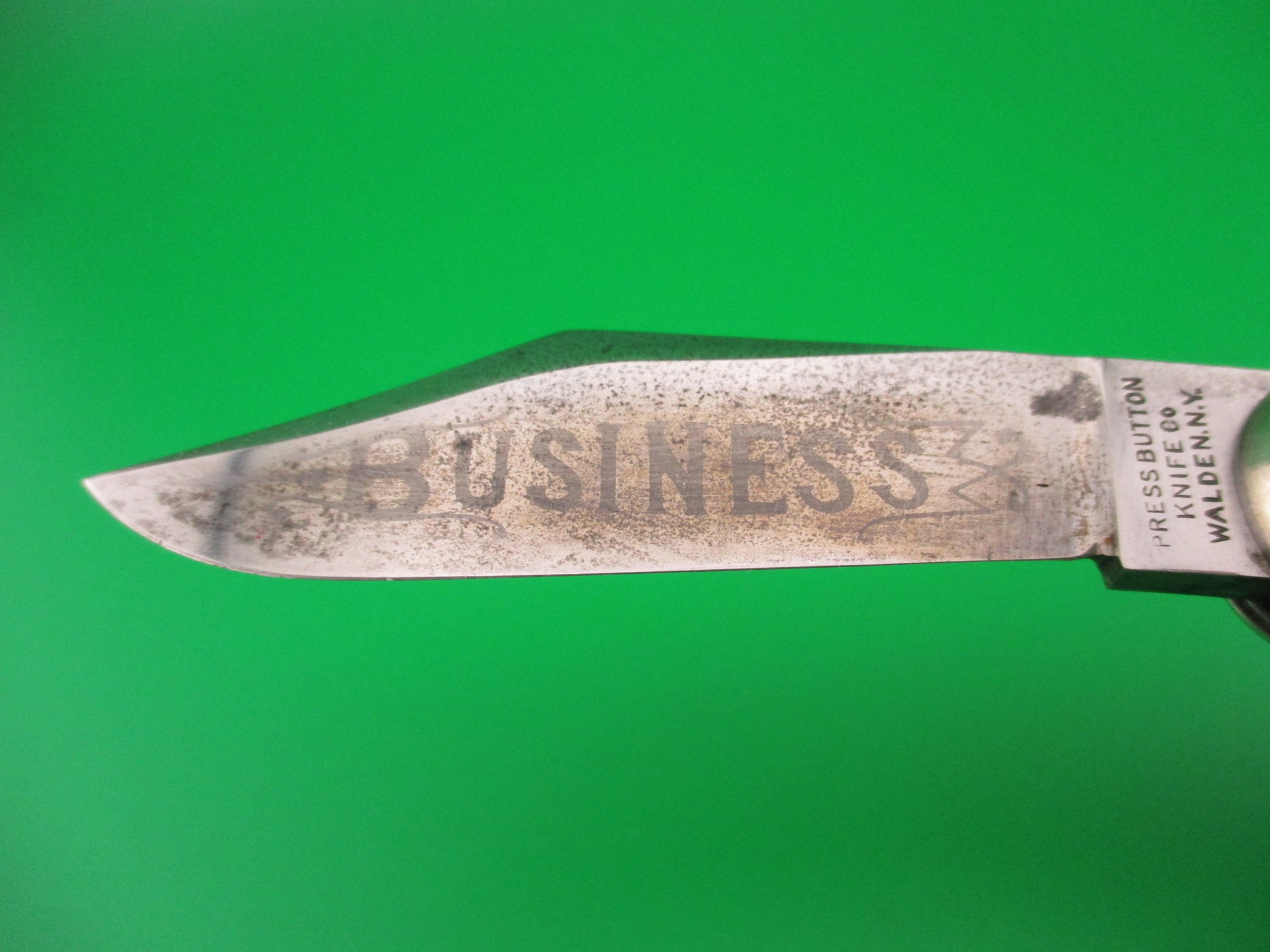 Antique Press Button Knife Co Business model automatic knife with Nice ETCH made in Walden, NY sometime between 1892 and 1923. It measures 3 15/16 inches closed and 6 3/4 inches open with steel liners and nickel silver bolsters & button & pins. The clip blade is 99% full with original finish and strong BUSINESS etch on the face of the blade under a light patina with some light scratches and light spotting. The tang is clearly stamped PRESS BUTTON KNIFE CO WALDEN, NY. The jigged bone scales are in wonderful condition with no cracks, or chips. The knife works great with blade tip deep and centered closed, opens nicely and very good lockup with less than 1/16" up and down at the tip. Barely rattles if shaken with blade open. Added extra pics to show the etch & blade condition. EX+ condition.