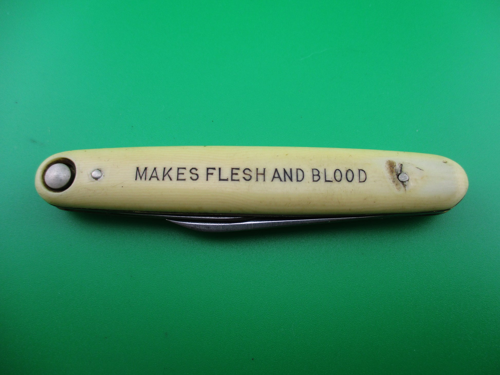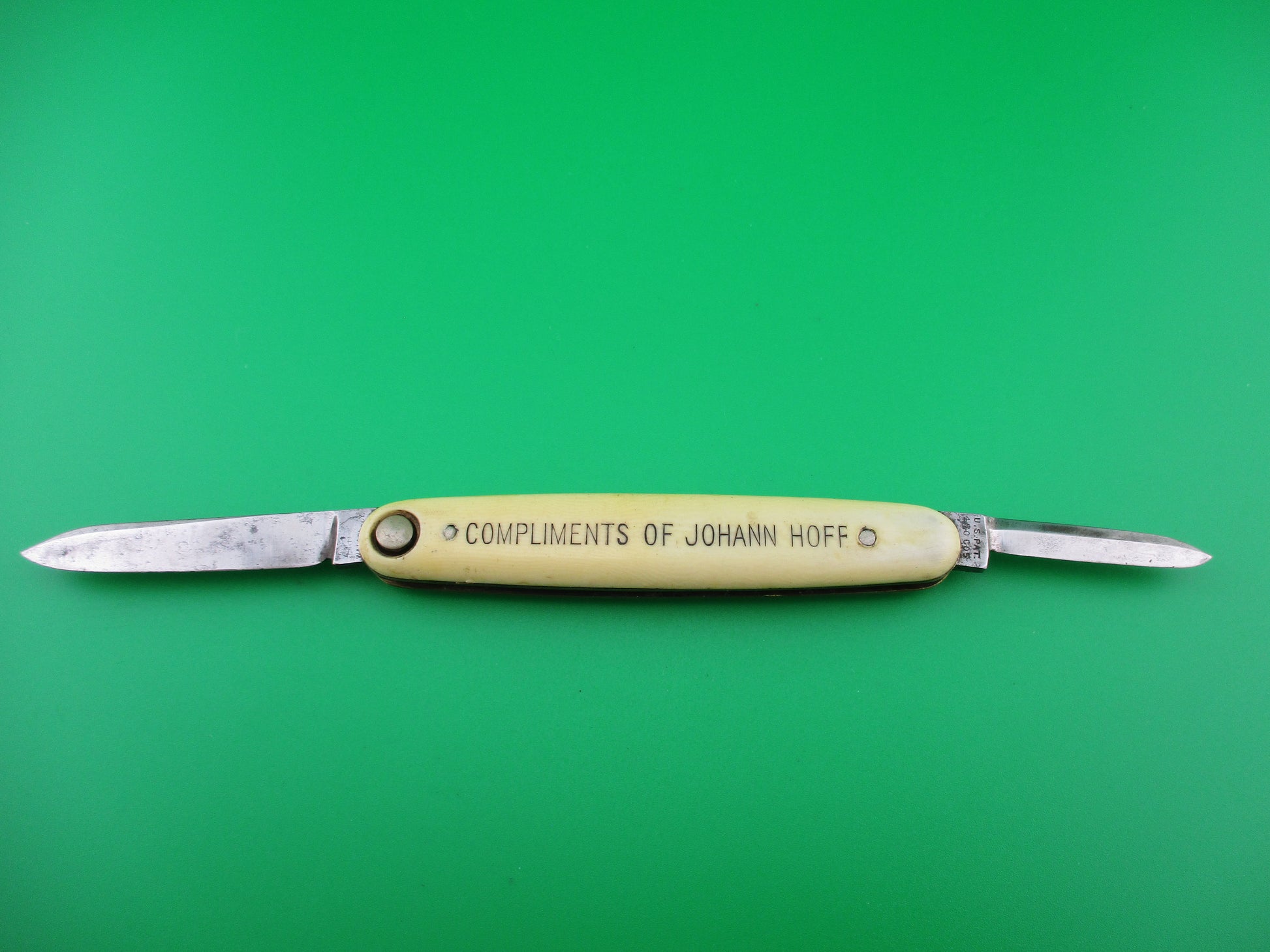Antique Press Button Knife Co medium double with Ivory celluloid handles (scales). The knife was made in Walden, NY sometime between 1892 and 1923. It was designated the model #107 and measures 3 3/8" closed and 6 13/16 inches with both blades open and has brass liners. It is the middle one of three sizes of switchblade doubles made by the company. The blades are both mostly full with light patina and some spotting. Both blades are marked PRESS BUTTON KNIFE CO WALDEN NY on the fronts and on the back of the tangs US PAT 470605. The smooth ivory cell scales are in good condition with one small crack and scuff by one of the back nickel silver scale pins. The scales have advertising of COMPLIMENTS OF JOHANN HOFF on the front and MAKES FLESH AND BLOOD on the rear. The knife works great with both blade tips below the liners closed, good snap and very good lockup with just a hint of movement on each blade open. Kickback on small blade, but often bounces back into the locked open position. VG+ condition.