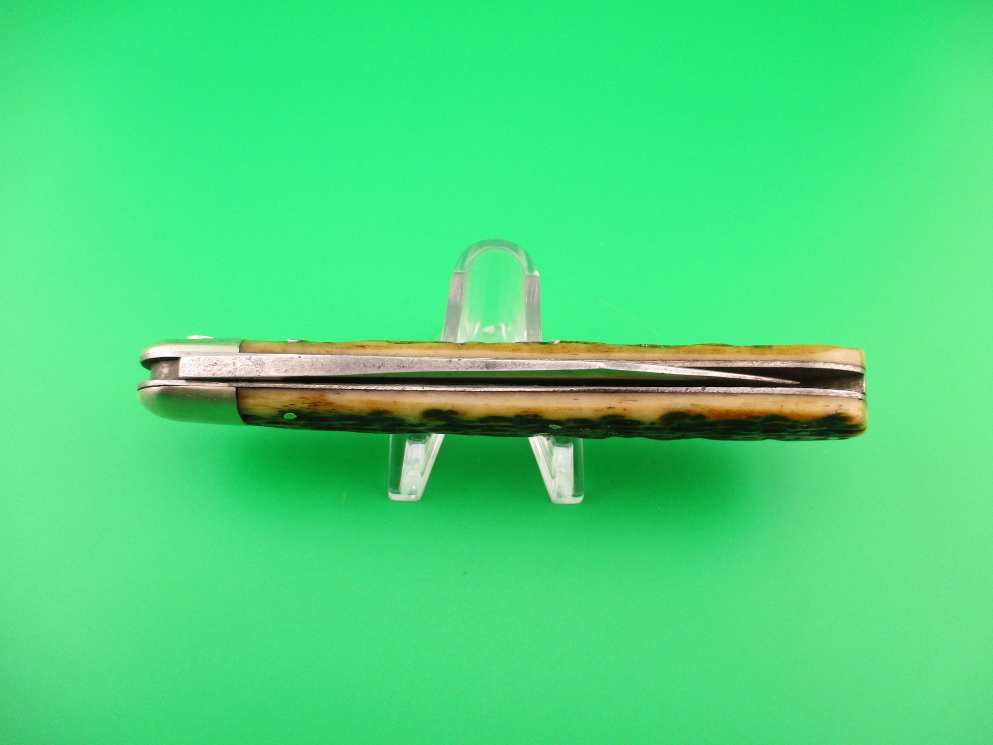 Vintage Press Button Knife Co INVINCIBLE model switchblade made in Walden, NY sometime between 1912 and 1923. The knife measures 4 7/8 inches closed and 8 1/2 inches open with steel liners and nickel silver bolsters & button. The clip blade is about 1/4 inch short and 92% full, or better with some light scratches and the tang is stamped PRESS BUTTON KNIFE CO WALDEN, NY and the backside is blank. The jigged bone scales are in very good condition with no cracks. The knife functions well with the blade tip well below the liners closed, opens strong when button pressed and locks open with about 1/8" up and down and little side to side. It does rattle if shaken with the blade open as most of these do. This is a nice working example of a 100+ year old American made switchblade. VG+ condition.