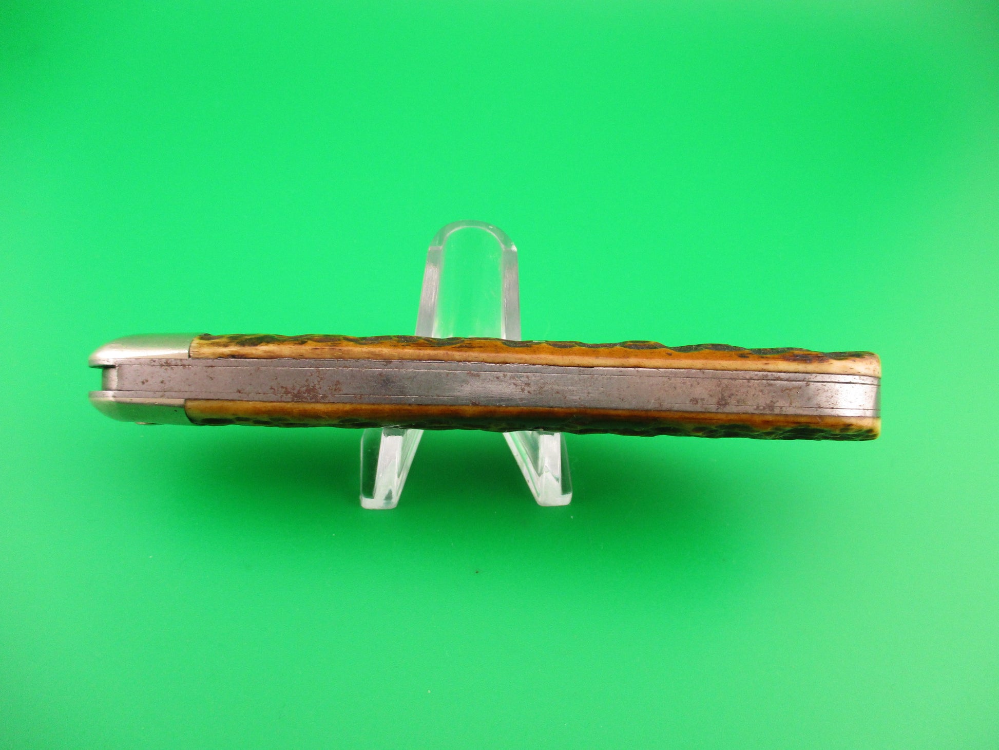 Vintage Press Button Knife Co INVINCIBLE model switchblade made in Walden, NY sometime between 1912 and 1923. The knife measures 4 7/8 inches closed and 8 5/8 inches open with steel liners. The blade is marked PRESS BUTTON KNIFE CO WALDEN, NY on the tang and the backside is blank. The blade is mostly full at about 97% with patina, light scratches, light pitting and spotting and you can still make out part of the original acid blade etch! You can easily see "BLE" and the fancy design on the ends of the etch and if you look really close and turn the blade to the light you can make out the "C" & "I" and bits and pieces of the "INVIN". Hard to find these with any of the original etch intact because they were so fragile. The picked bone scales are in very good condition with no cracks. The knife functions well with the blade tip below the liners closed, opens strong when button pressed and locks open with about 1/8" up and down and little side to side. It does rattle if shaken with the blade open as most of these do. This is a nice working example of a 100+ year old American made switchblade with some etch! VG+ condition.