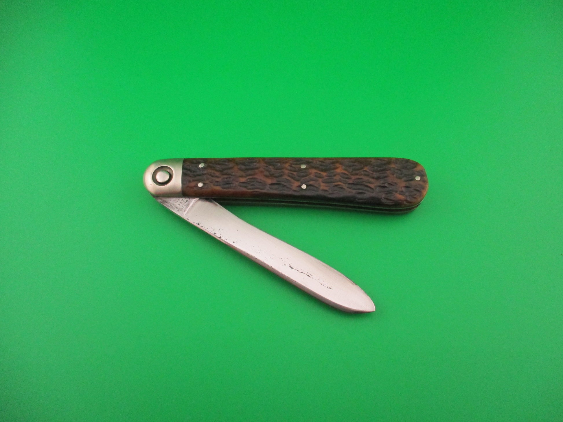 Antique Press Button Knife Co Invincible picked bone model #1000 switchblade knife with less common spear point blade made in Walden, NY sometime between 1892 and 1923. The knife measures 4 7/8" closed and 8 5/8 inches open with steel liners and nickel silver bolsters , button & pins. The spear point blade has some loss from sharpening and is about 92% full with light scratches and scattered pitting and the tang is stamped PRESS BUTTON KNIFE CO WALDEN, NY and the reverse is blank. The blade was originally acid etched INVINCIBLE, but the etches were fragile and easily worn off with use. The picked bone scales are in very nice condition. The knife works well with the blade tip deep & centered closed, opens fully and locks with less than 1/16" up and down and slightly more side to side at the tip open. It rattles if shaken with the blade open as most do after 100 years. VG condition.