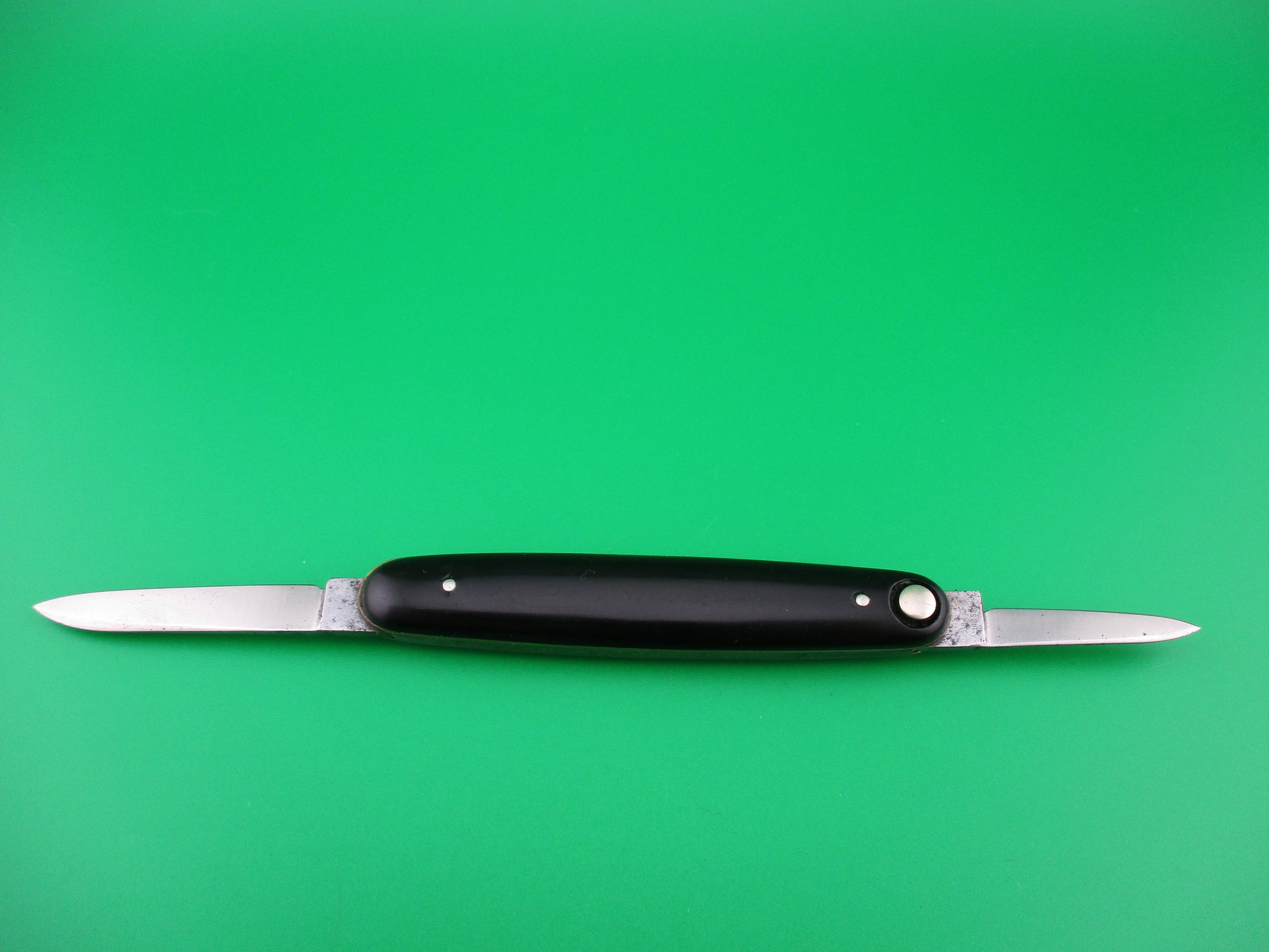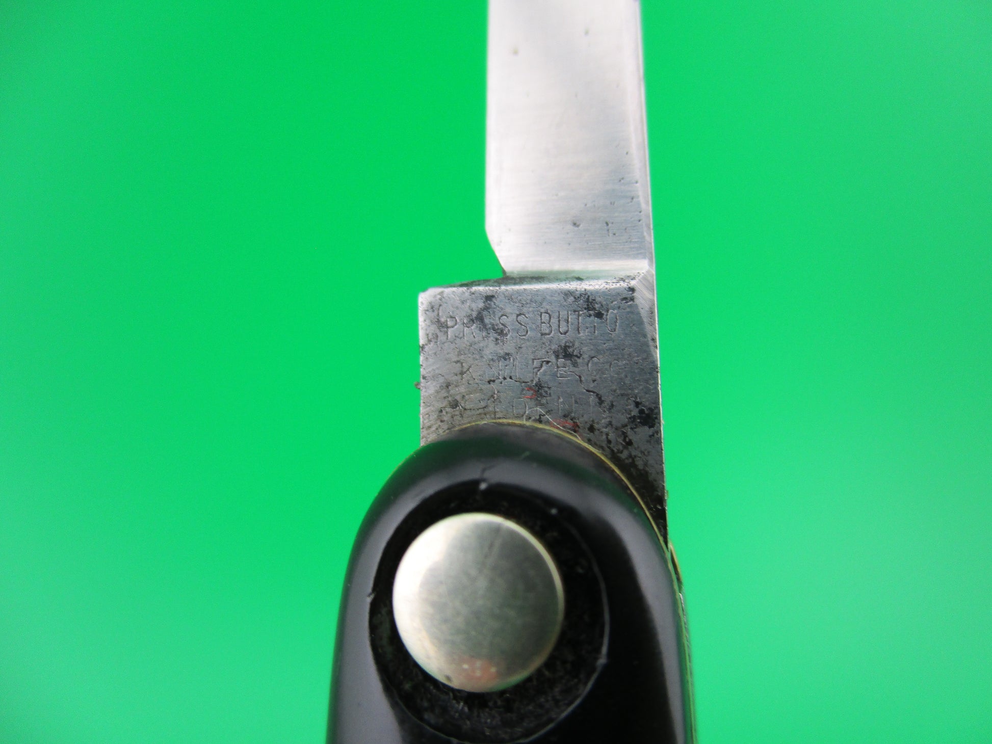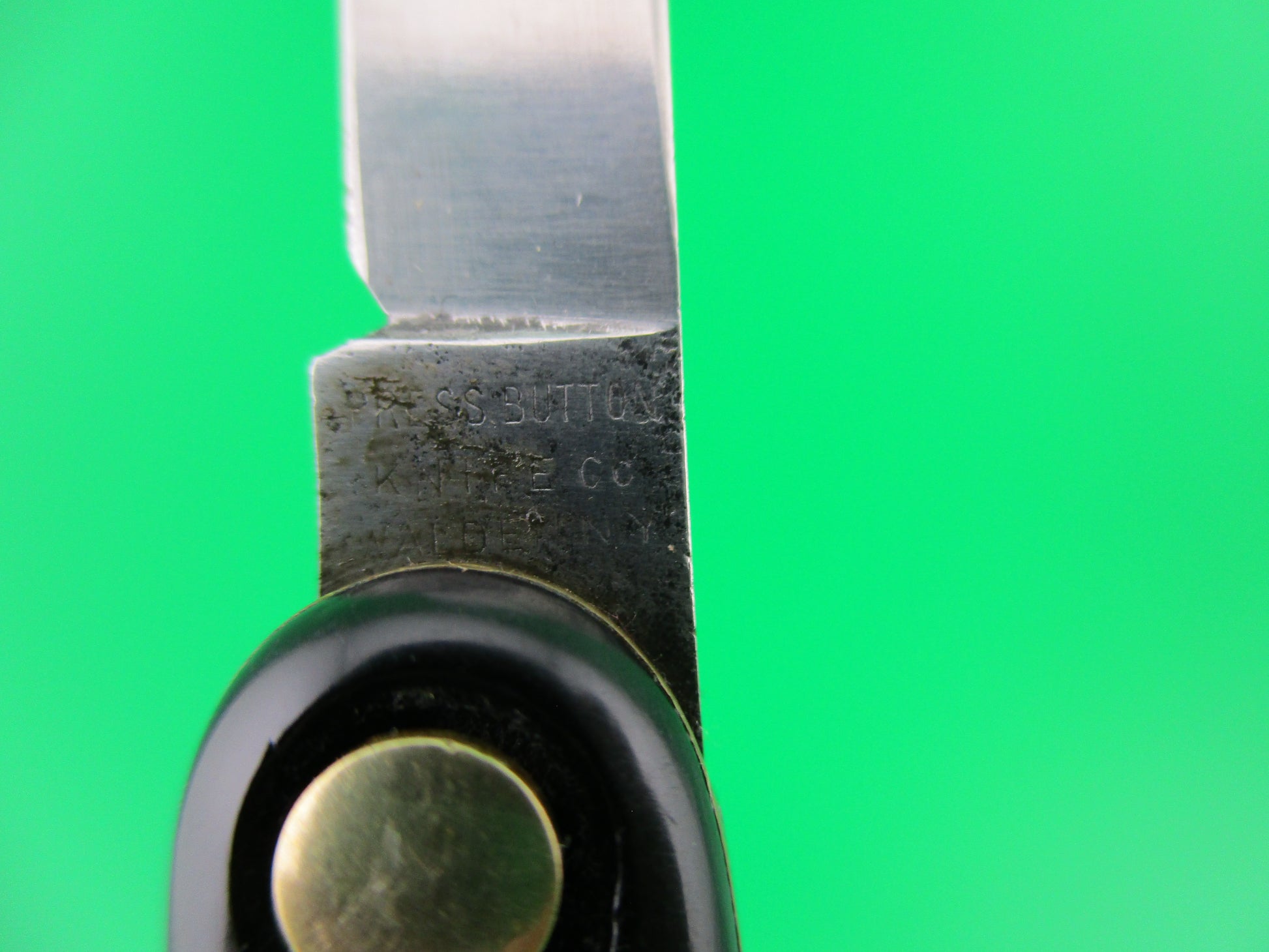Antique Press Button Knife Co medium double with black synthetic handles (scales) a less common color for this knife. The knife was made in Walden, NY sometime between 1892 and 1923. It was designated the model #107 and measures 3 3/8" closed and 6.75 inches with both blades open and has brass liners and nickel silver buttons. It is the middle one of three sizes of switchblade doubles made by the company. The blades are both mostly full and shiny. Both blades are marked PRESS BUTTON KNIFE CO WALDEN NY on the front tangs. There are no patent numbers which means it was likely made between 1913 and 1923. The smooth black scales are in good condition with no cracks, but some handling marks. The knife works great with both blade tips below the liners closed, good snap and fair lockup with kickback on large blade. Main blade has about 3/16" up and down at the tip. VG condition.