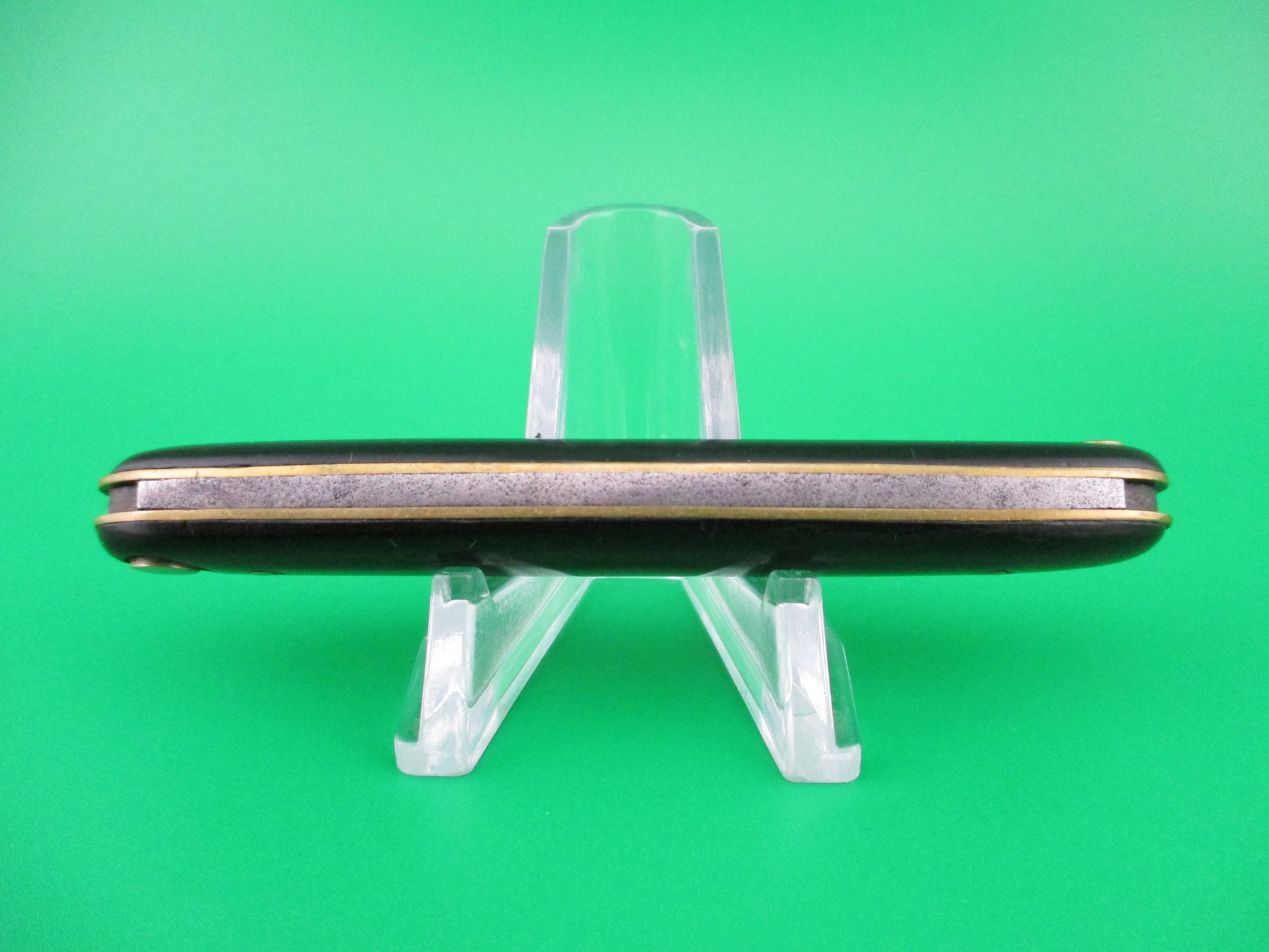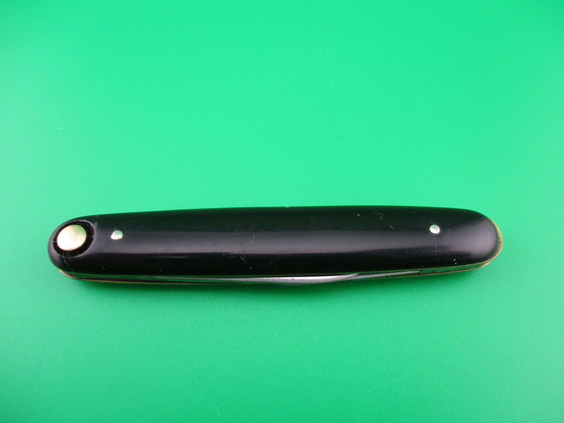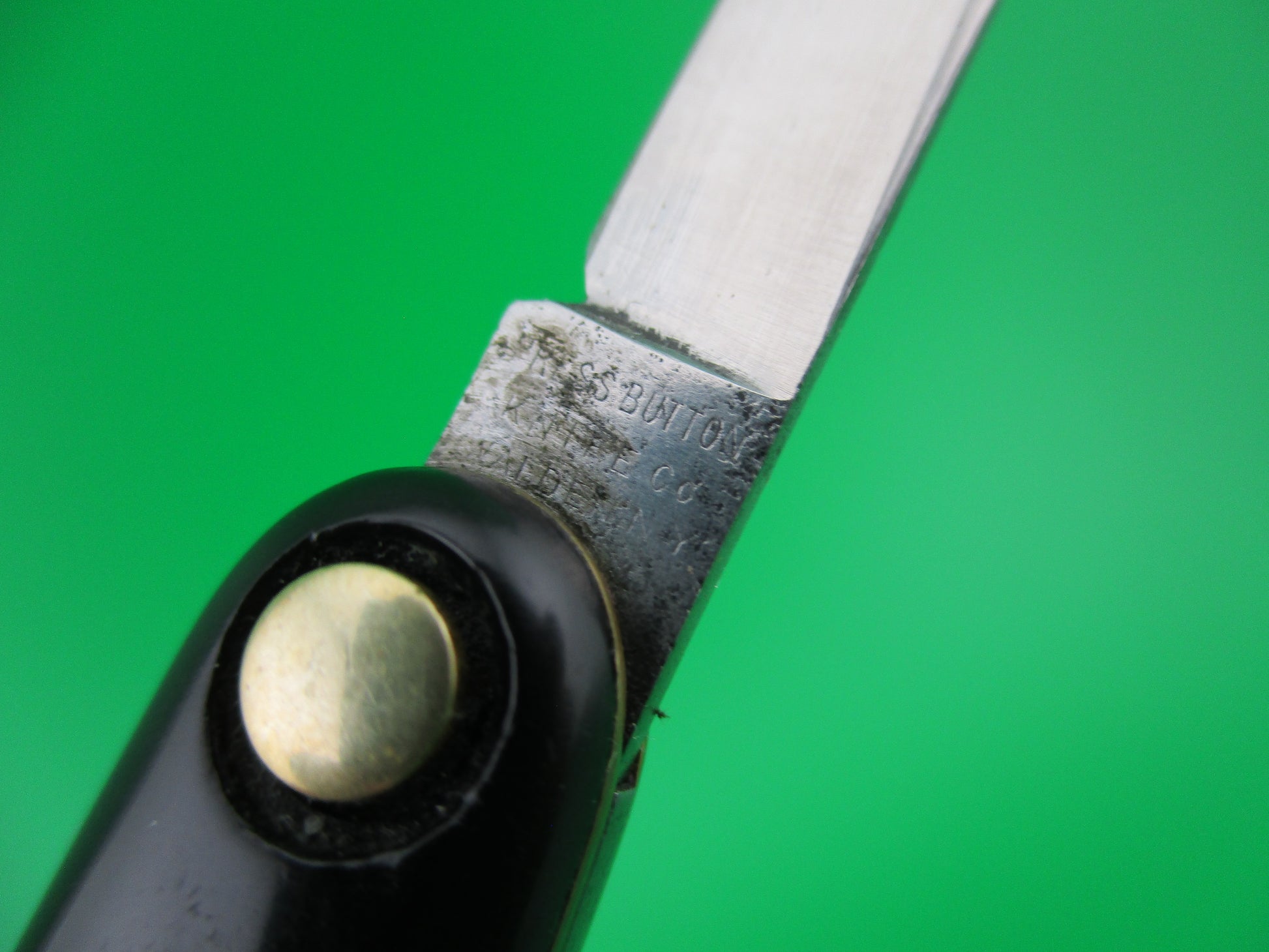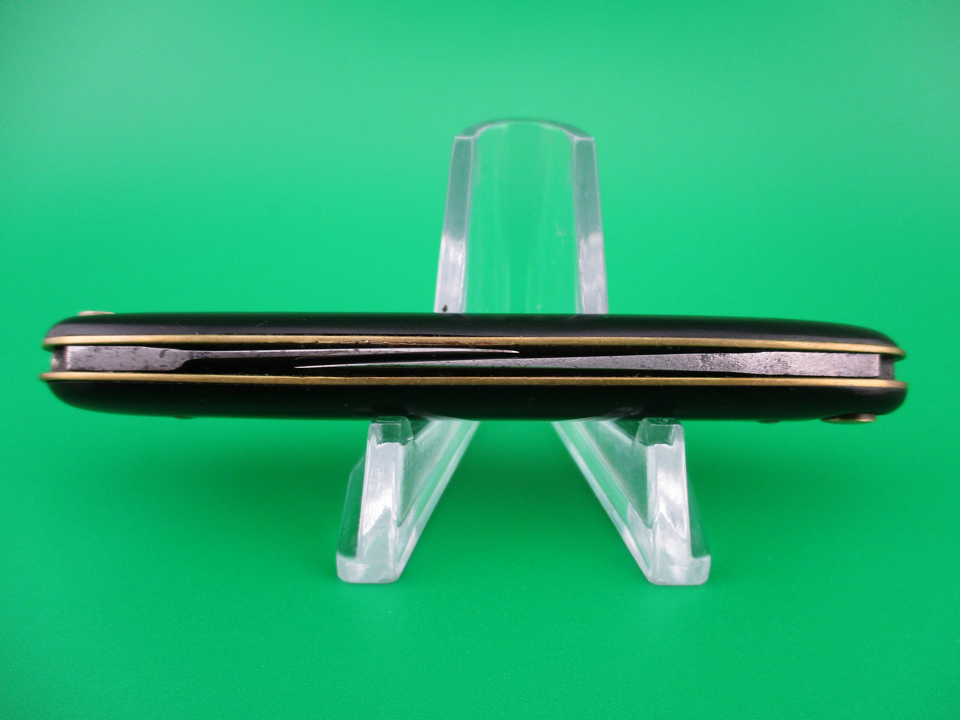 Antique Press Button Knife Co medium double with black synthetic handles (scales) a less common color for this knife. The knife was made in Walden, NY sometime between 1892 and 1923. It was designated the model #107 and measures 3 3/8" closed and 6.75 inches with both blades open and has brass liners and nickel silver buttons. It is the middle one of three sizes of switchblade doubles made by the company. The blades are both mostly full and shiny. Both blades are marked PRESS BUTTON KNIFE CO WALDEN NY on the front tangs. There are no patent numbers which means it was likely made between 1913 and 1923. The smooth black scales are in good condition with no cracks, but some handling marks. The knife works great with both blade tips below the liners closed, good snap and fair lockup with kickback on large blade. Main blade has about 3/16" up and down at the tip. VG condition.