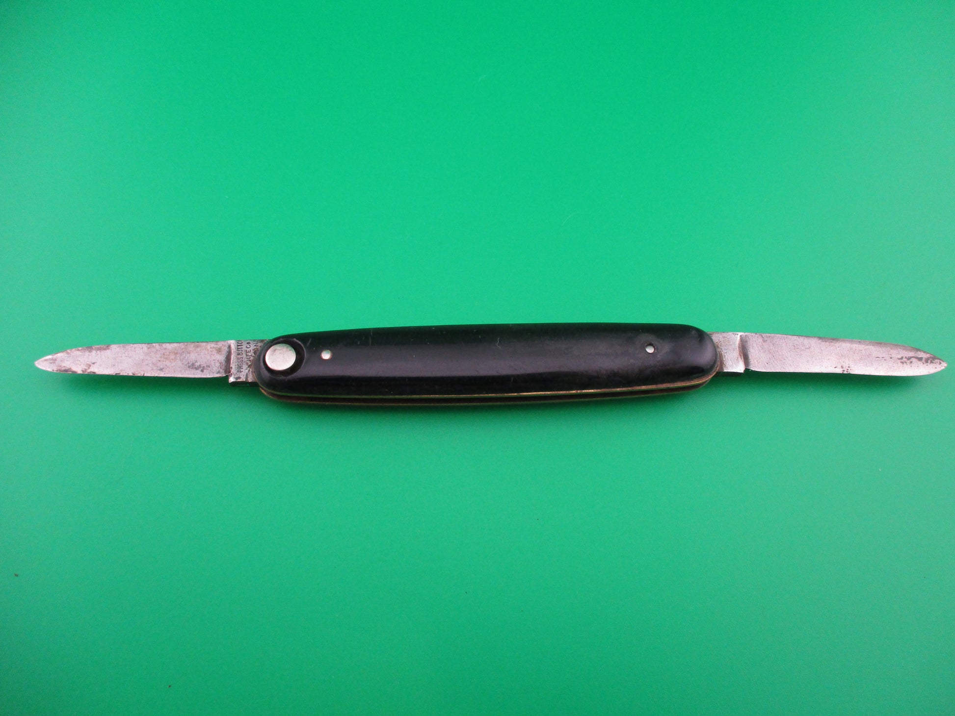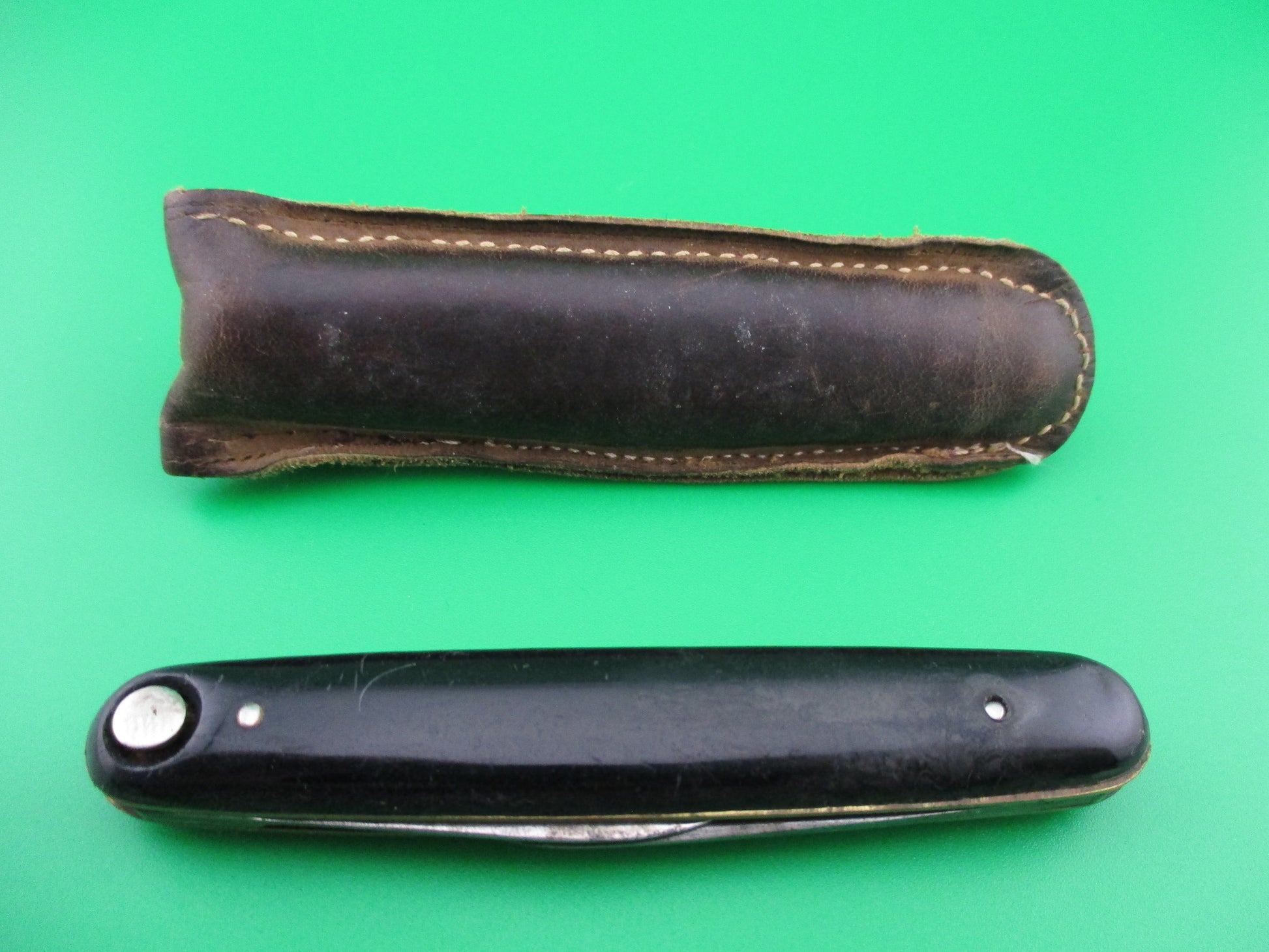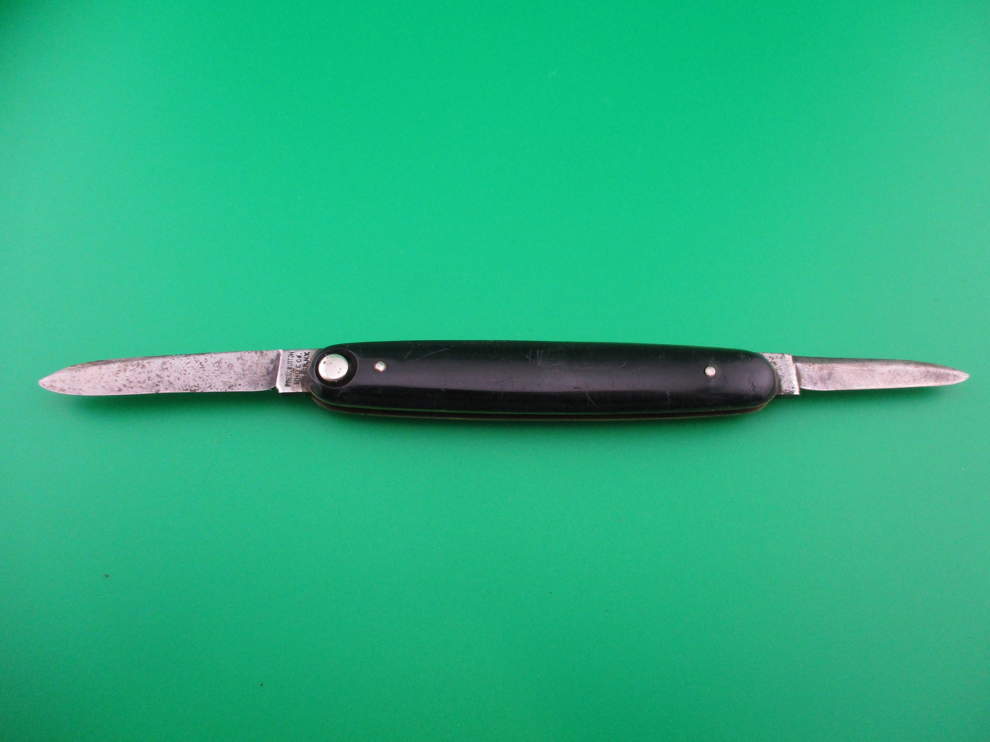 This is a Press Button Knife Co medium double with black synthetic handles (scales). Black is one of the less common scale colors for this knife. The knife was made in Walden, NY sometime between 1892 and 1923. It was designated the model #107 and measures 3 3/8" closed and 6 13/16 inches with both blades open. It is the middle one of three sizes of switchblade doubles made by the company. The blades are both mostly full with patina and some spotting. Both blades are marked PRESS BUTTON KNIFE CO WALDEN NY. There are no patent numbers which means it was likely made between 1913 and 1923. The smooth black scales are in good condition with no cracks, but show a lot of handling marks from 100 years of use. The knife works great with both blade tips below the liners closed, good snap and fair lockup with some wiggle on each. Kickback on large blade. Good overall condition. The leather purse looks to be original to the knife and though they didn't usually come with a purse, they were often purchased at the same time. Nice old PBKC double with a leather purse.