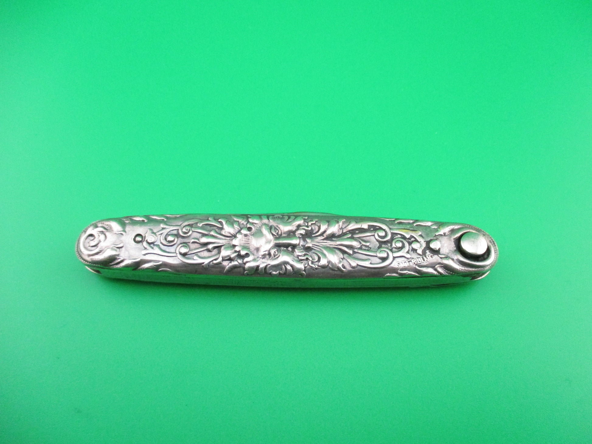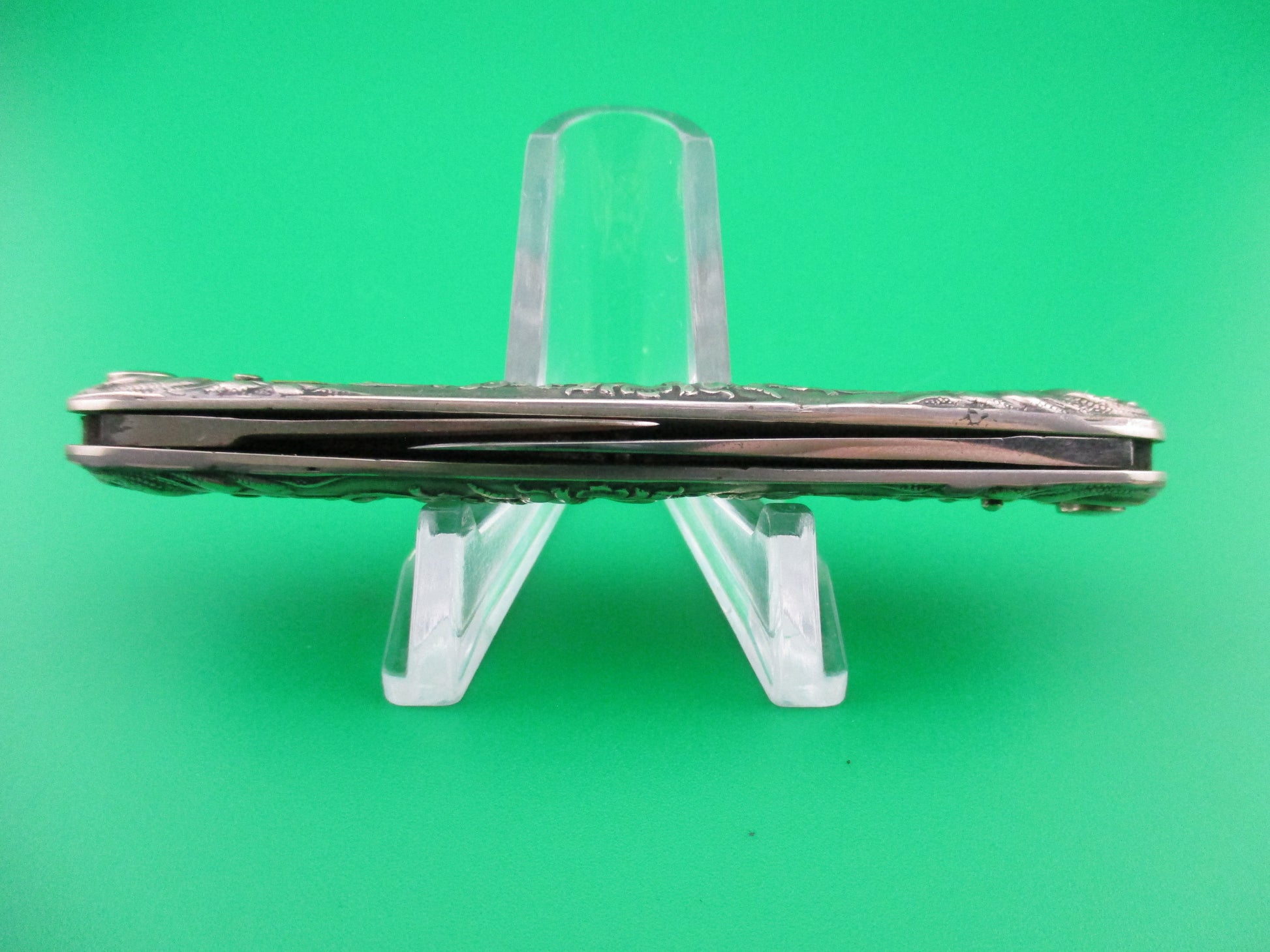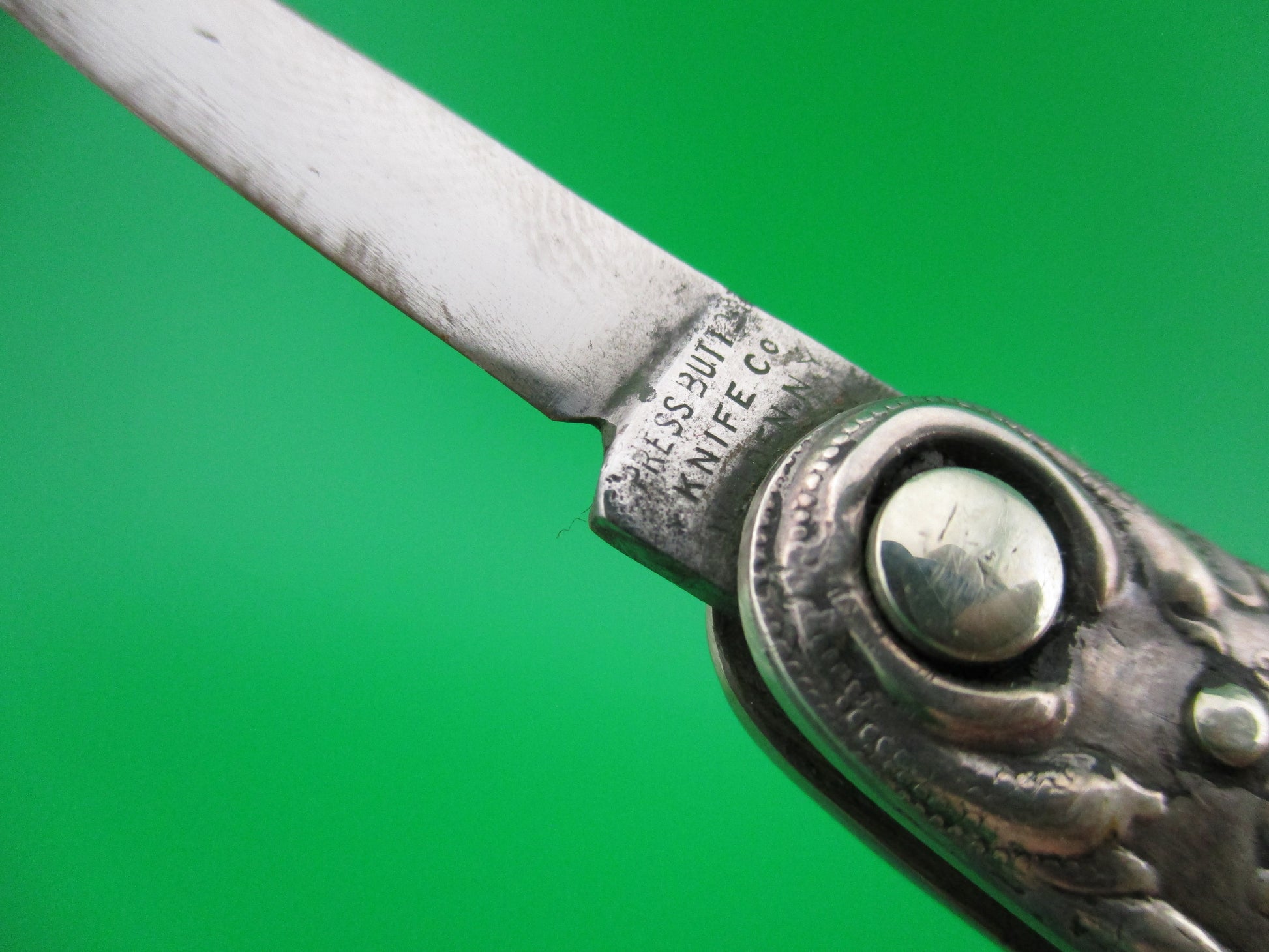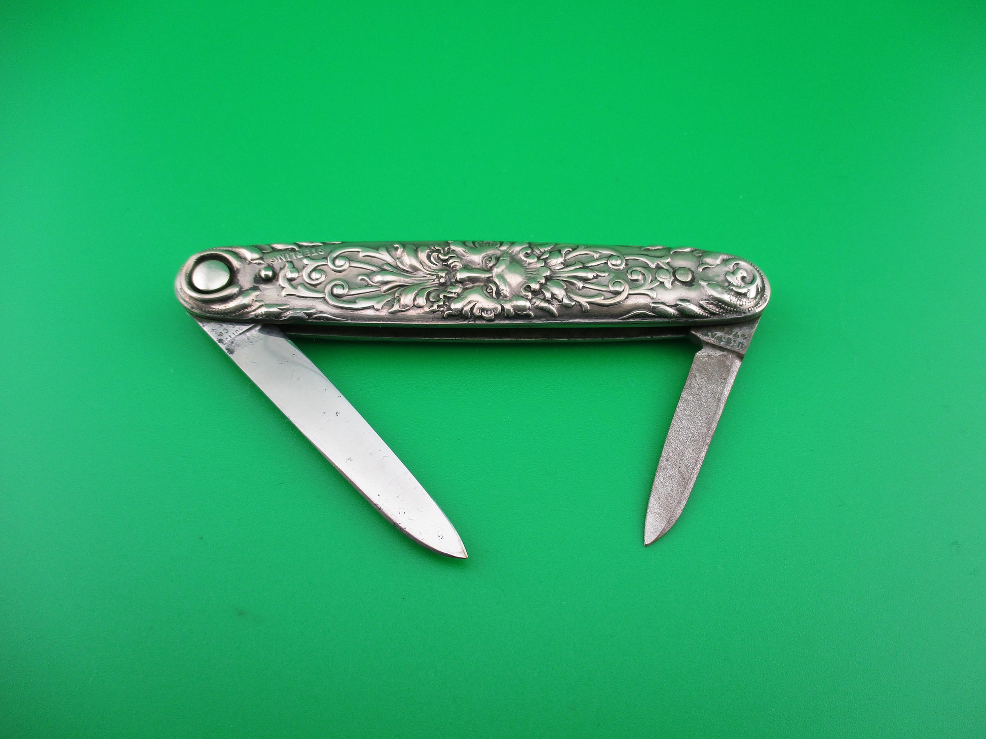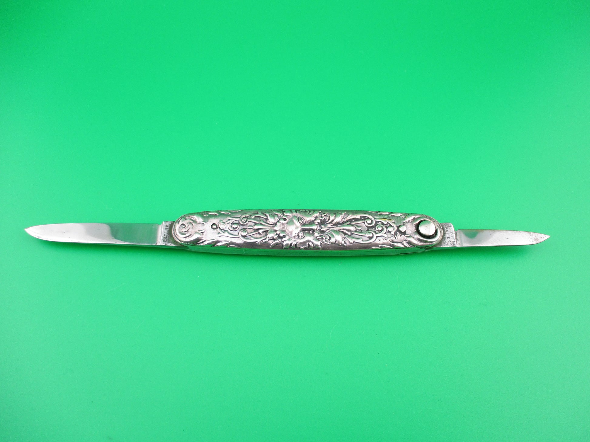 Press Button Knife Co Medium double Sterling Silver Satyr switchblade. Made by the Press Button Knife Co of Walden, NY sometime between 1892 and 1923 it was designated pattern number 110SS. Measures 3 3/8" closed and 6.7 inches open with nickel silver liners. The blades are mostly full and shiny with main blade stamped PRESS BUTTON KNIFE CO NY and the backside stamped PATENT APPLIED FOR. Small blade same front stamp and backside US PAT 470605. This knife was likely made around 1910 based on the blade markings, around the time that they were experimenting with sliding safeties. The scales are Sterling Silver with a SATYR, often called Old Man Winter by collectors and are in beautiful condition. The knife works well with both blade tips below liners closed, open fully and lock open, but both have kickback, or bounceback which means the spring is a little strong so the blades don't have a chance to catch and lock the first time and they bounce back, but both lock up well when in the open position. EX- condition.