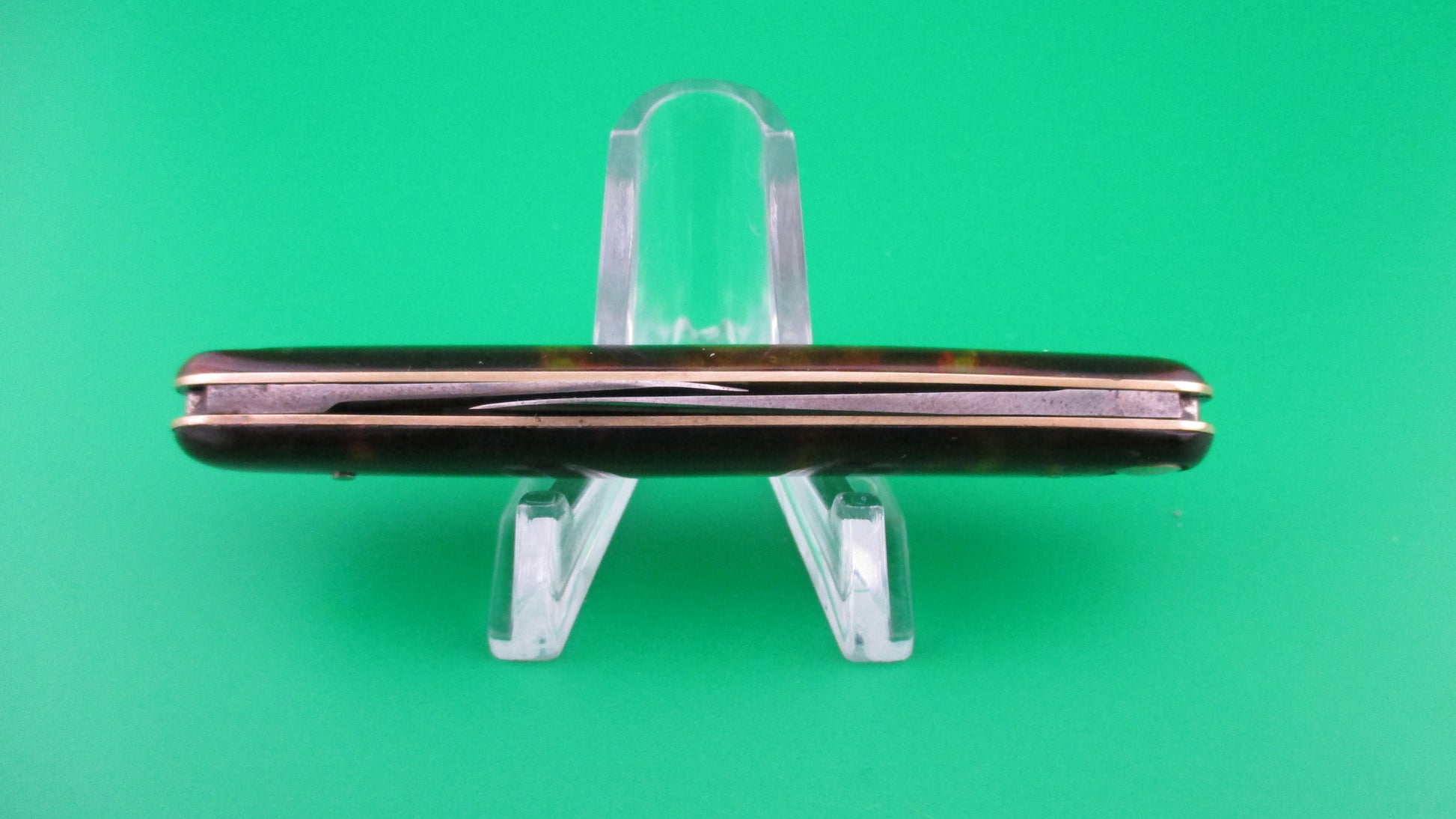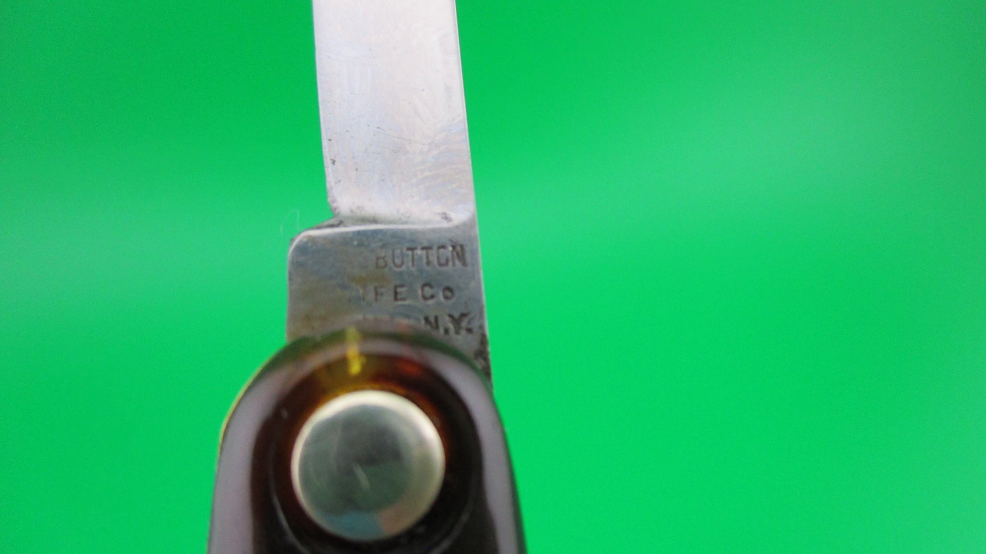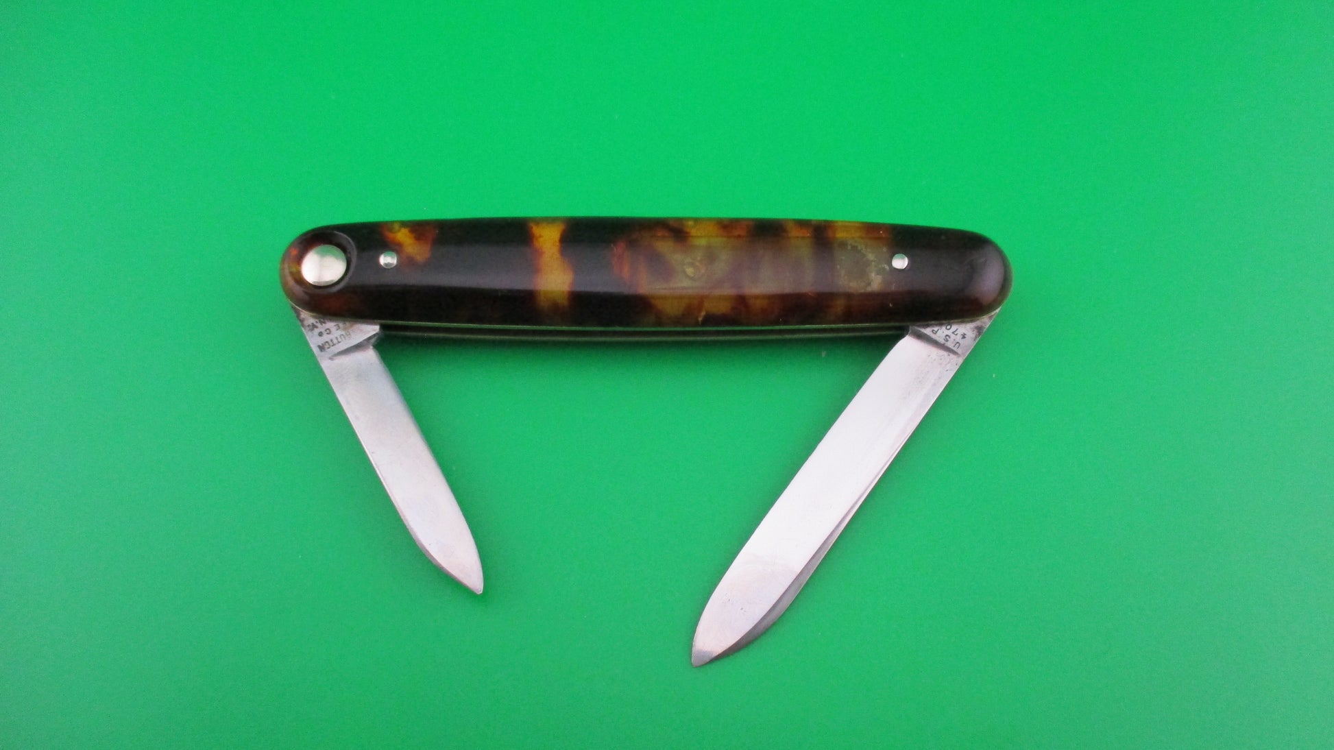 Antique Press Button Knife Co medium double with tortoise celluloid handles (scales) made in Walden, NY sometime between 1892 and 1923. It was designated the model #102 and measures 3 3/8" closed and 6 13/16 inches with both blades open with brass liners and nickel silver buttons. It is the middle one of three sizes of switchblade doubles made by the company. The blades are both nearly full and shiny with most of the original finish still visible. Both blades are marked PRESS BUTTON KNIFE CO WALDEN NY and both are stamped US PAT 470605 on the back tangs. The large blade is etched STILETTO with a sword through the word, but lots of light scratches from sharpening make it a little hard to read. This is a cutlery trademark used by the Pacific Hardware Co in the early 1900s. The tortoise celluloid scales are in great condition with no cracks. The knife works great with both blade tips below the liners closed, good snap and great lockup and NO kickback. EX+ condition.