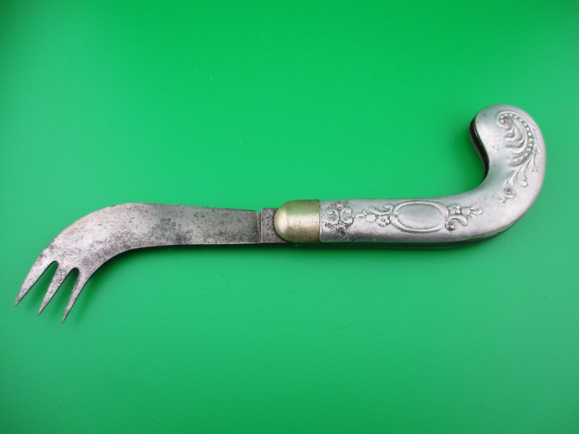 These are usually referred to as "One Arm Man" knives and were designed to help people with disabilities, specifically lost, or damaged arm or hand. It was designed to be used as both a cutting and eating utensil that could be opened and closed easily with one hand. This knife was made by the Press Button Knife Co of Walden, NY sometime between 1900 and 1923 and most, if not all, were made under contract for the AA Marks Artificial Limbs & Specialties Co of New York, as well as a few other switchblade models that they purchased. Most, if not all of these originally had an acid etch on the blade advertising the AA Marks company, but the etches were fragile and easily worn off with use.