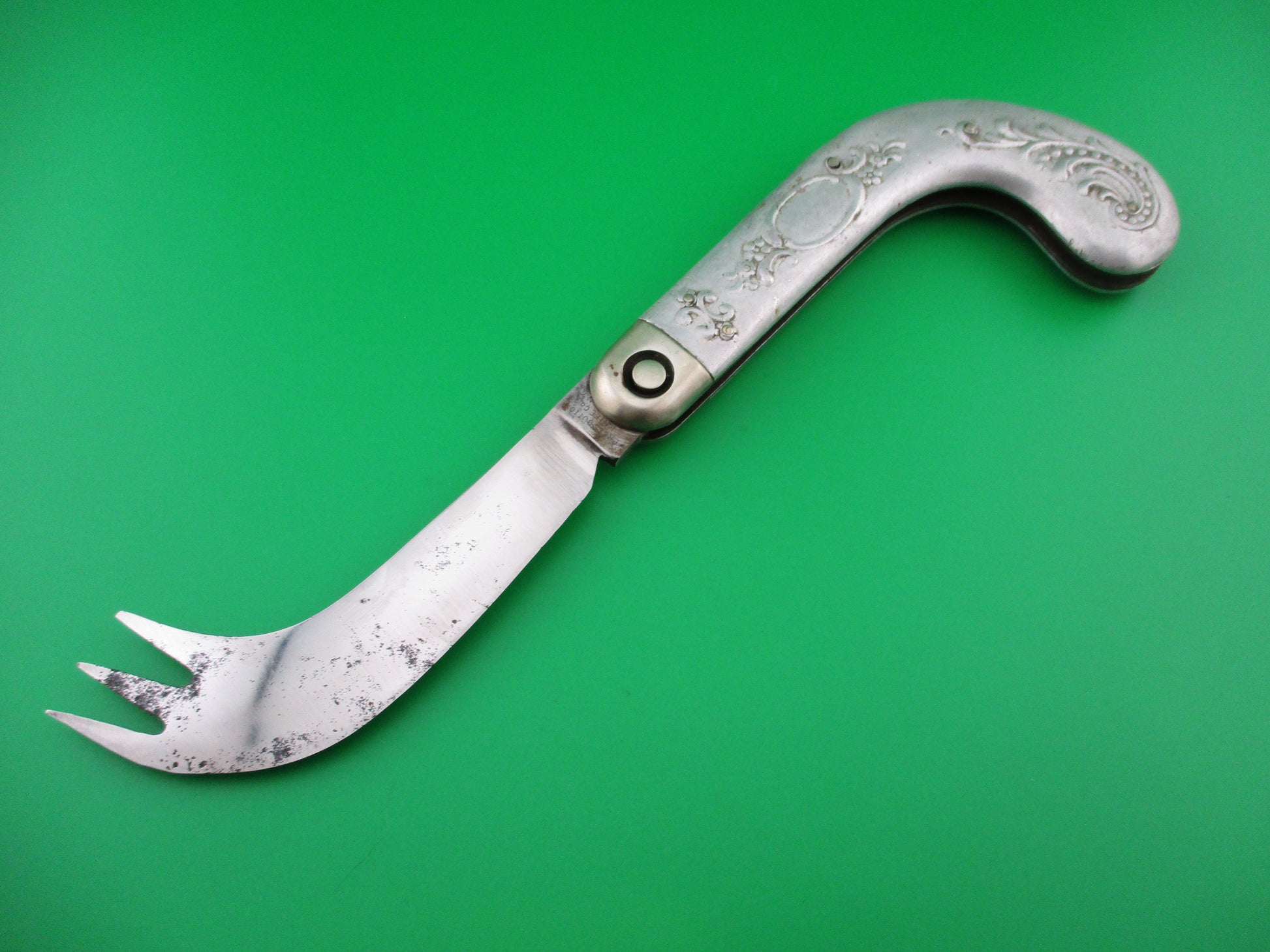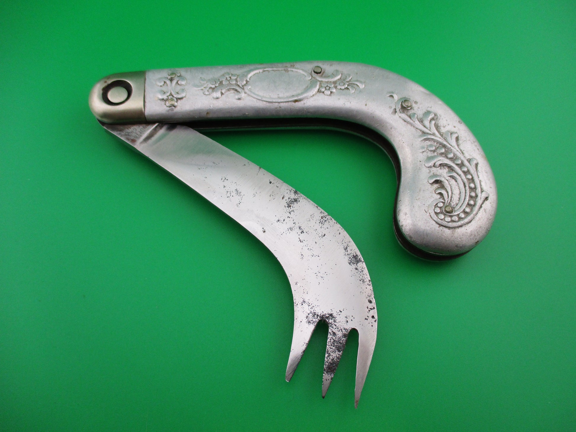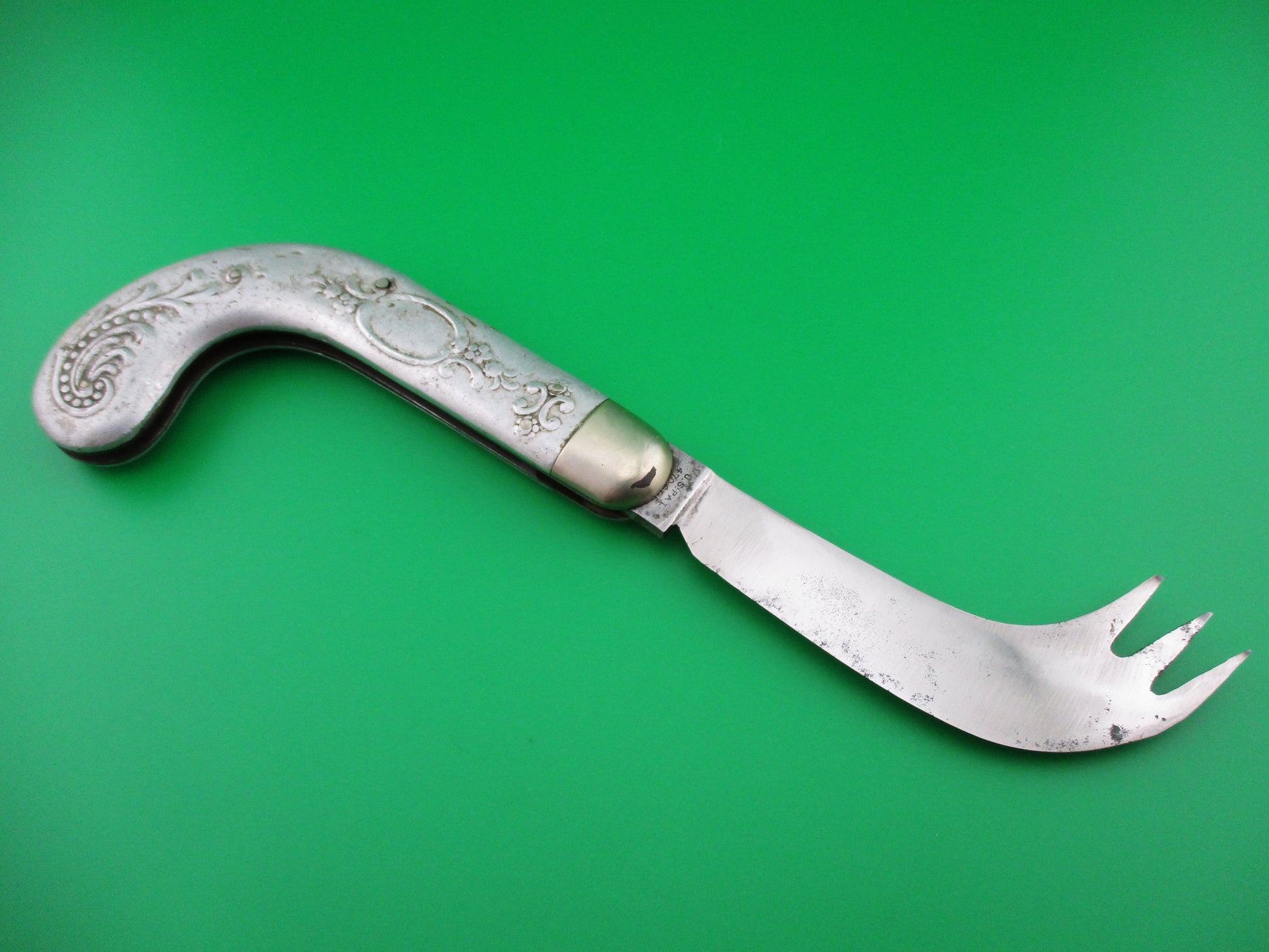 These are usually referred to as "One Arm Man" knives and were designed to help people with disabilities, specifically lost, or damaged arm or hand. It was designed to be used as both a cutting and eating utensil that could be opened and closed easily with one hand. This knife was made by the Press Button Knife Co of Walden, NY sometime between 1900 and 1923 and most, if not all, were made under contract for the AA Marks Artificial Limbs & Specialties Co of New York, as well as a few other switchblade models that they purchased. Most, if not all of these originally had an acid etch on the blade advertising the AA Marks company, but the etches were fragile and easily worn off with use.