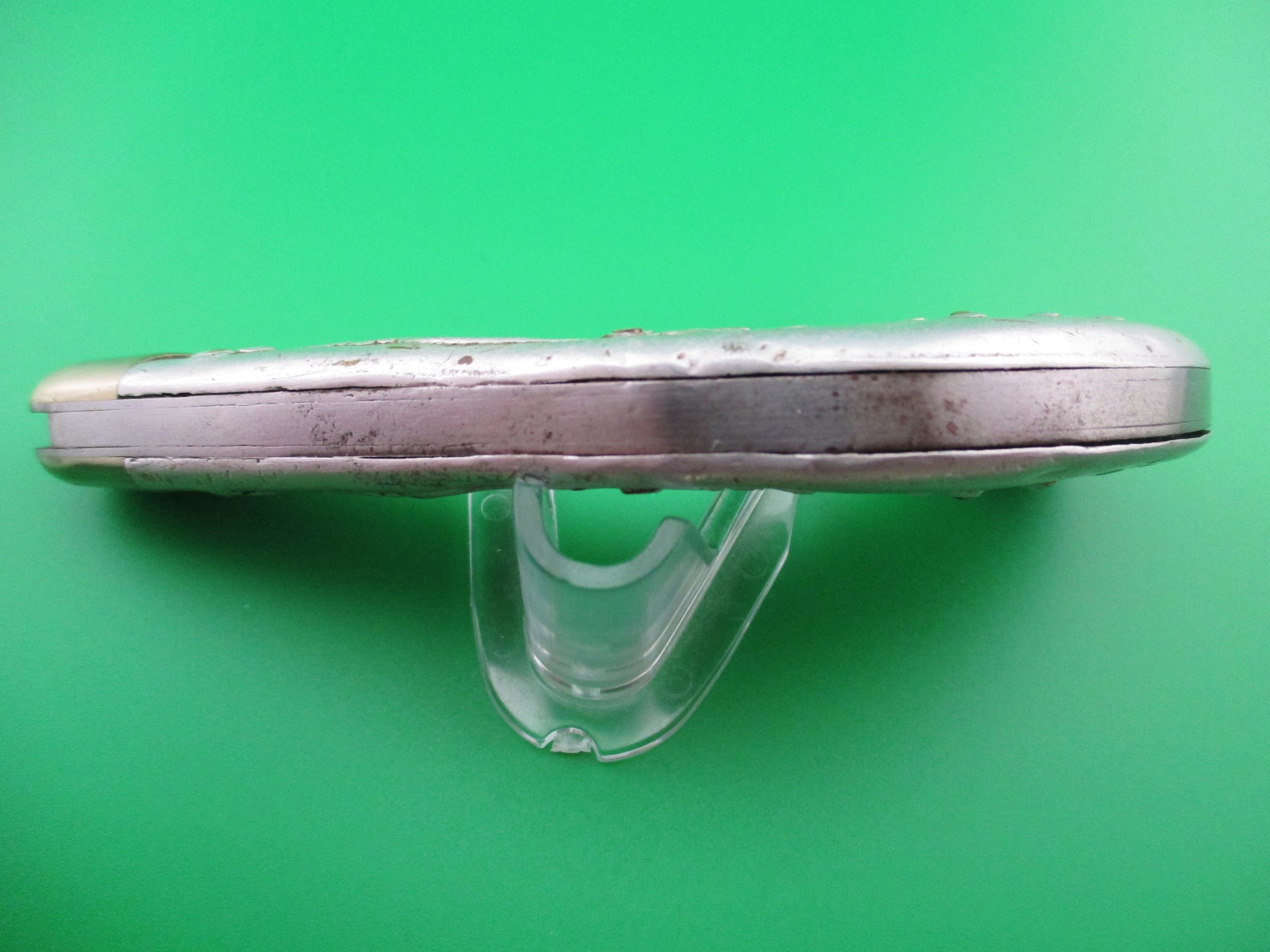 The blade on this knife is mostly full and shiny with some scratches and scattered light pitting, esp on middle fork tine. It is marked PRESS BUTTON KNIFE CO WALDEN NY on the front tang and US PAT 470605 on the rear. The knife measures just under 5 inches closed and approximately 9 inches open and it has pressed aluminum scales and steel liners. Aluminum was a rarer and more expensive material when this knife was made, but unfortunately not very durable so most of these that saw much use have damaged, or corroded scales. The scales on this one are actually very good, but do show some smoothing/wear from being in pocket and a couple of small dings. The knife workd well with the blade seating deep, good snap and very good lockup open. Beautiful old automatic knife in VG condition.