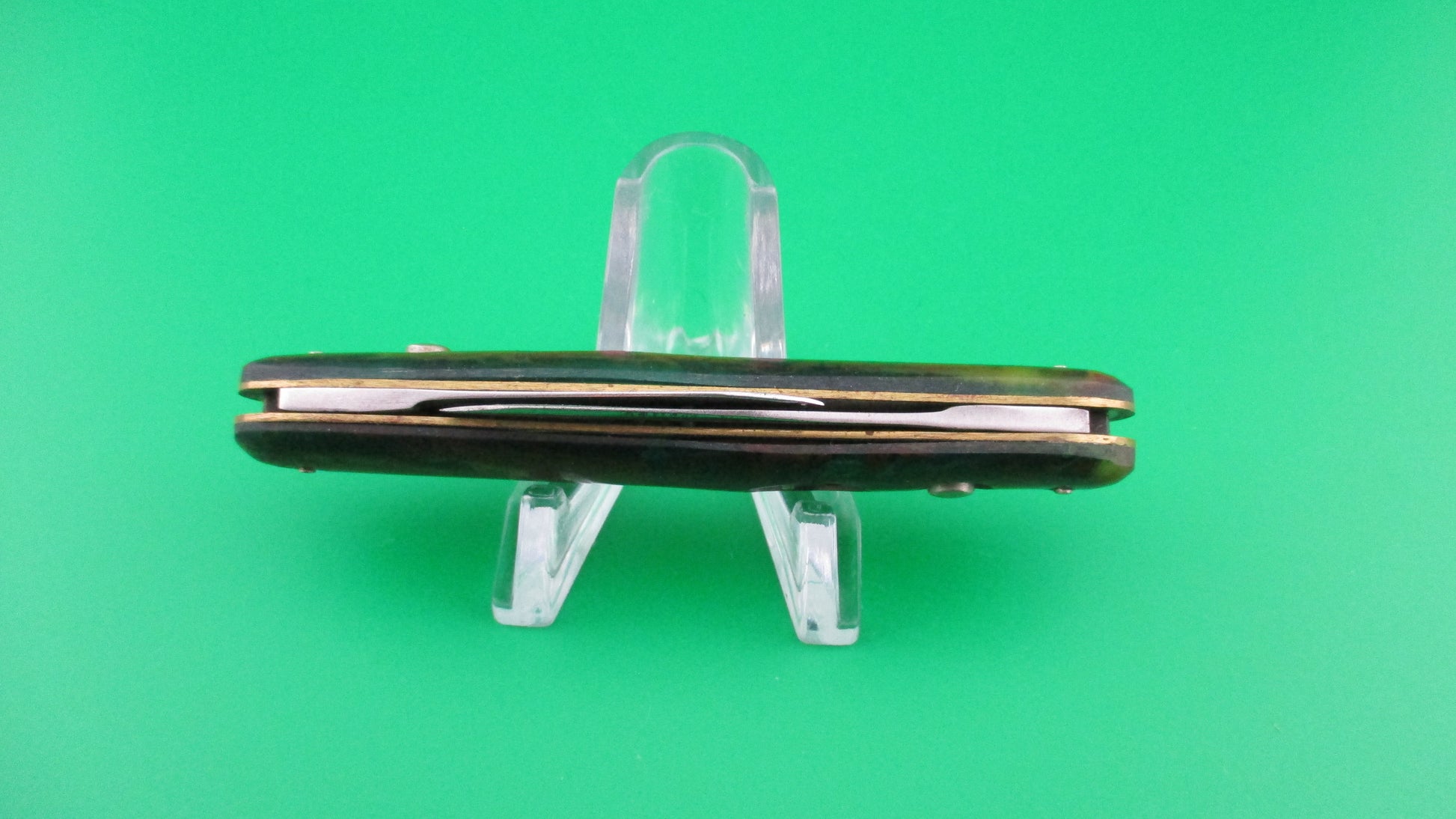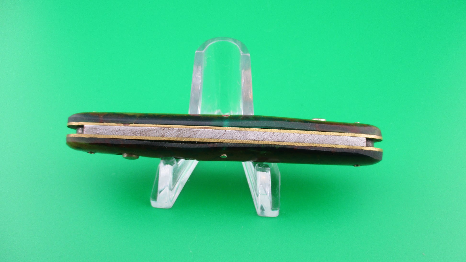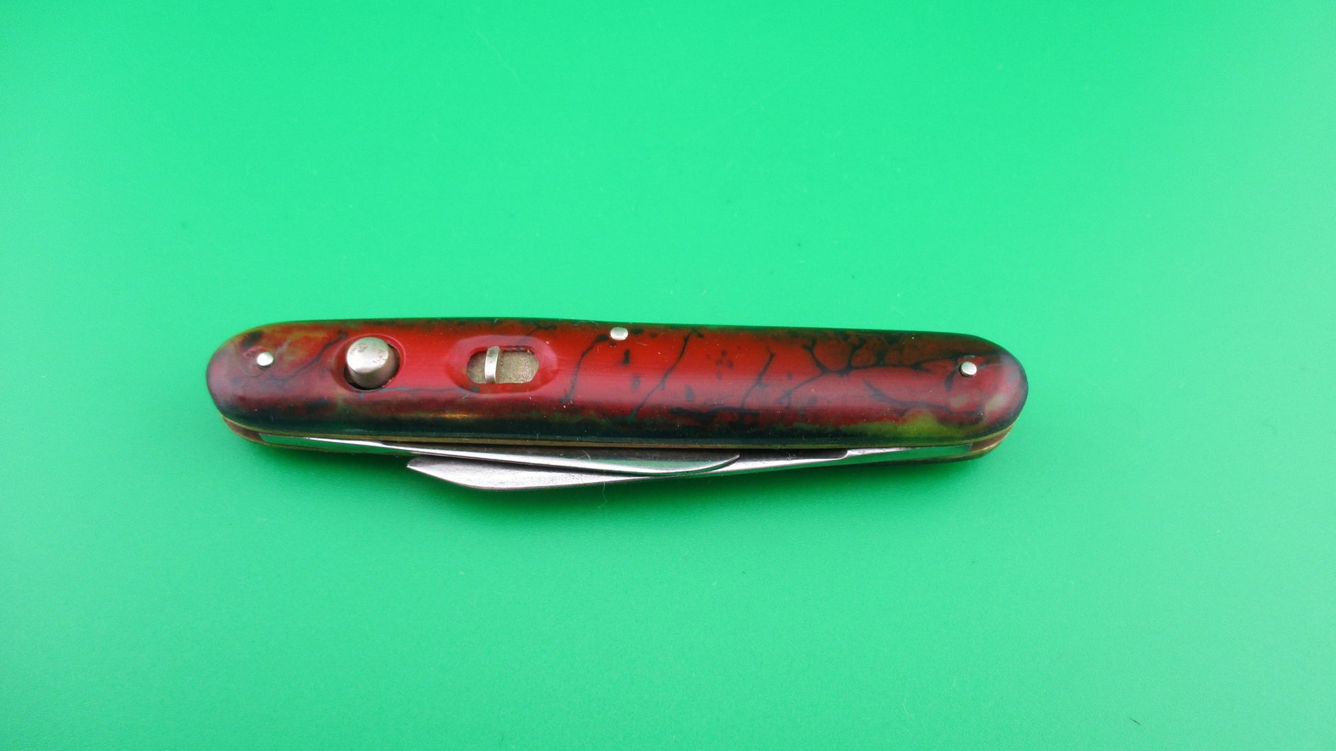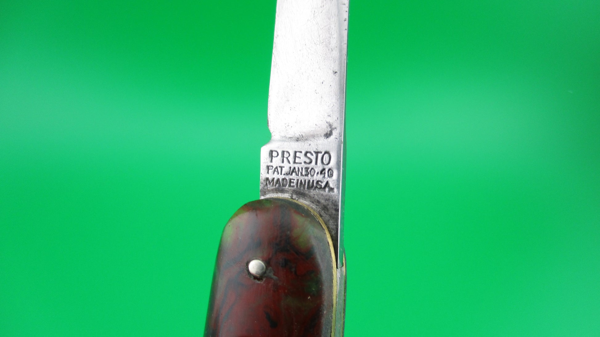 Vintage PRESTO double with Red & Green celluloid scales (handles). The knife was made by the Geo Schrade Knife Co of Bridgeport, CT between 1940 and 1956. It's the only size double made by the company and it measures 3 3/8" closed and 7" open with brass liners and nickel silver buttons & safeties. Main blade is stamped PRESTO PAT JAN 30-40 MADE IN USA and the small blade is stamped G SCHRADE in an arch over KNIFE CO in an arch over B'PORT CT. The blades are about 90% full with patina & scratches. The Red & Green celluloid scales are very unusual and in very good condition. The knife works well with large blade tip slightly above liners closed and small blade tip below the liners when closed, Good snap, both blades open fully with no kickback and good lockup with very little movement. Nice example of a vintage American PRESTO double switchblade. Both safeties work. G+ condition.