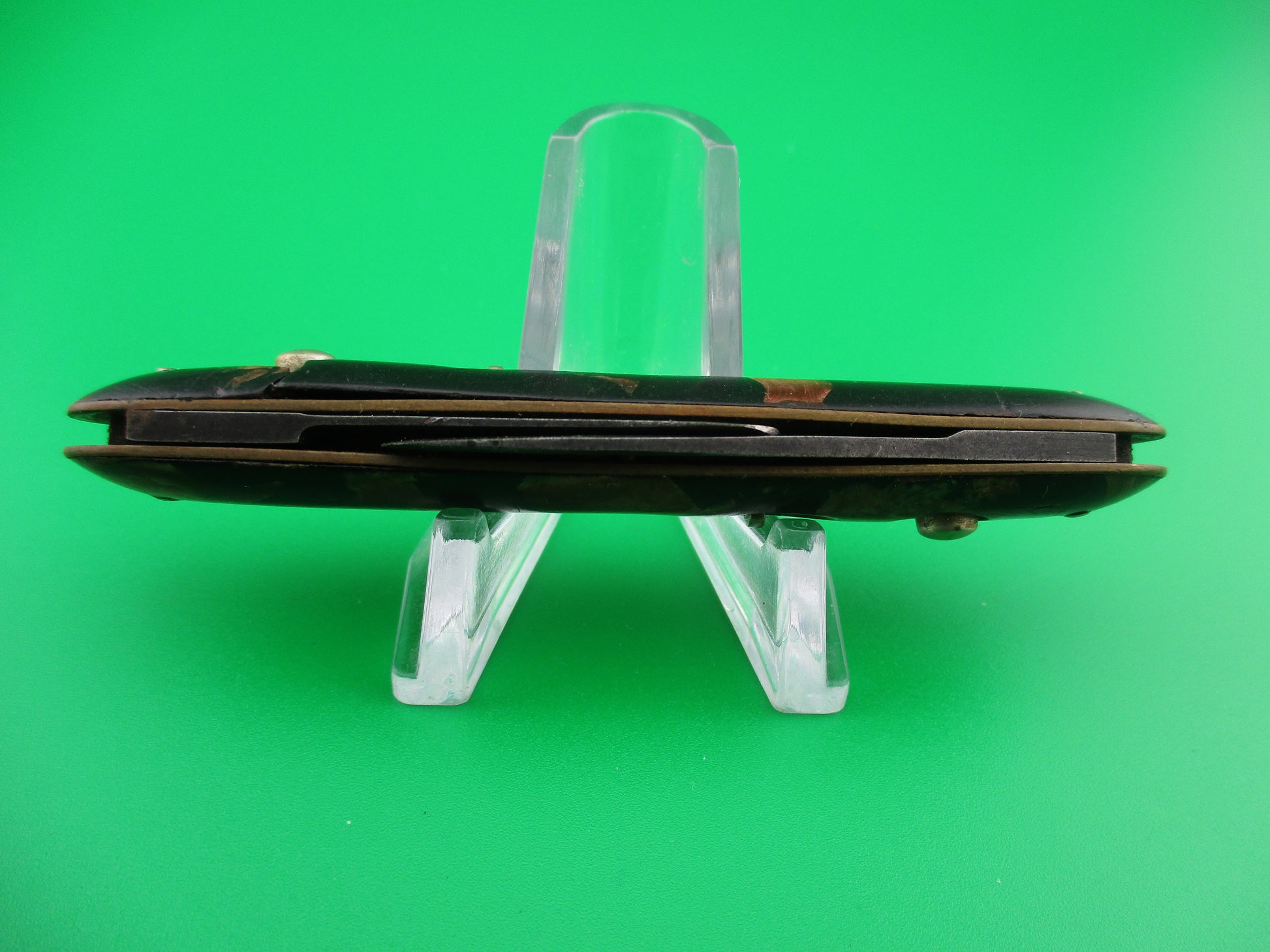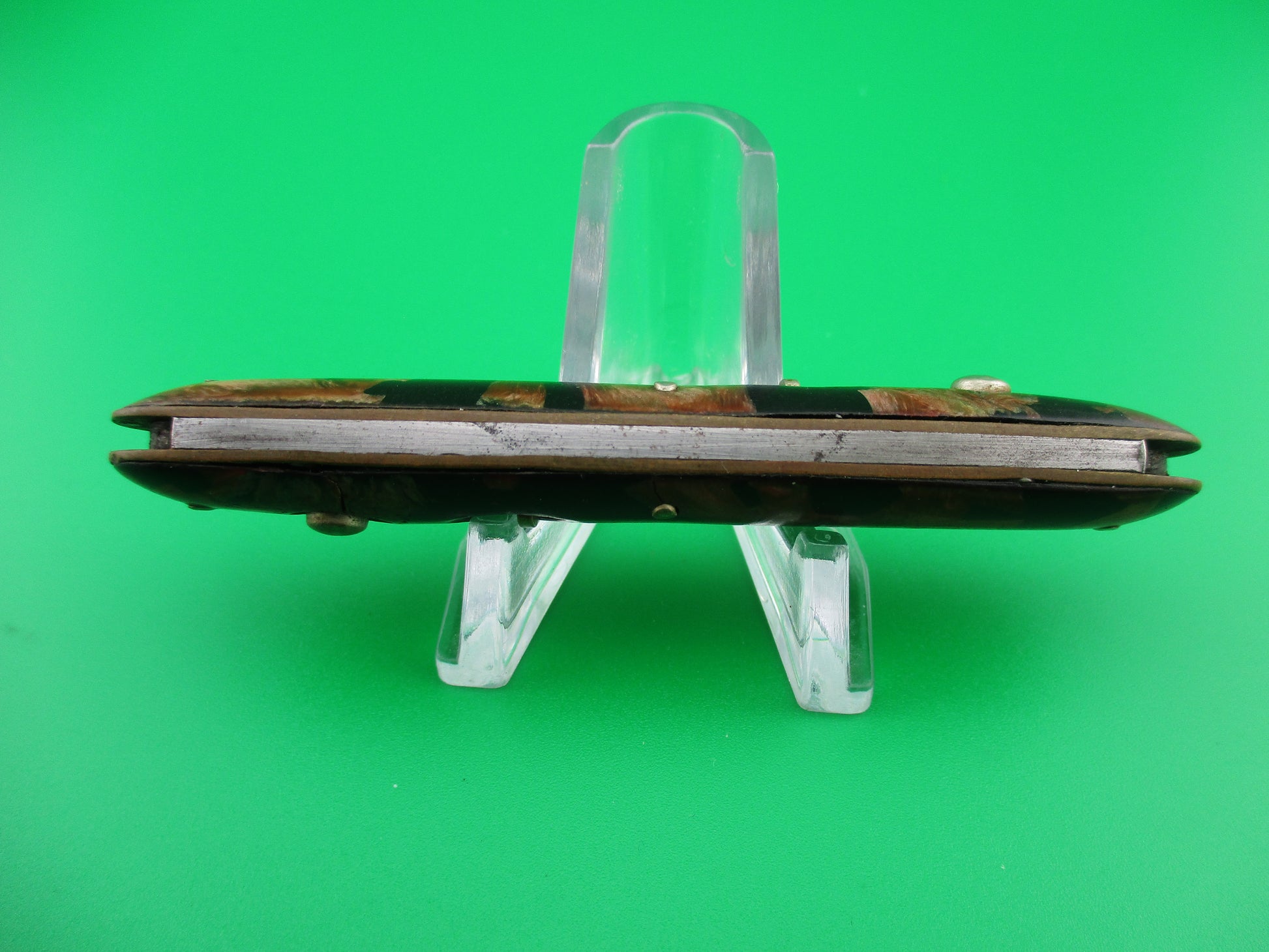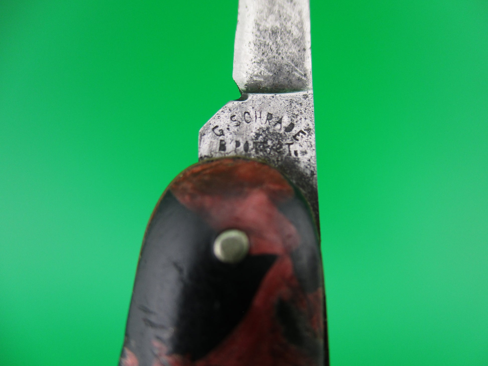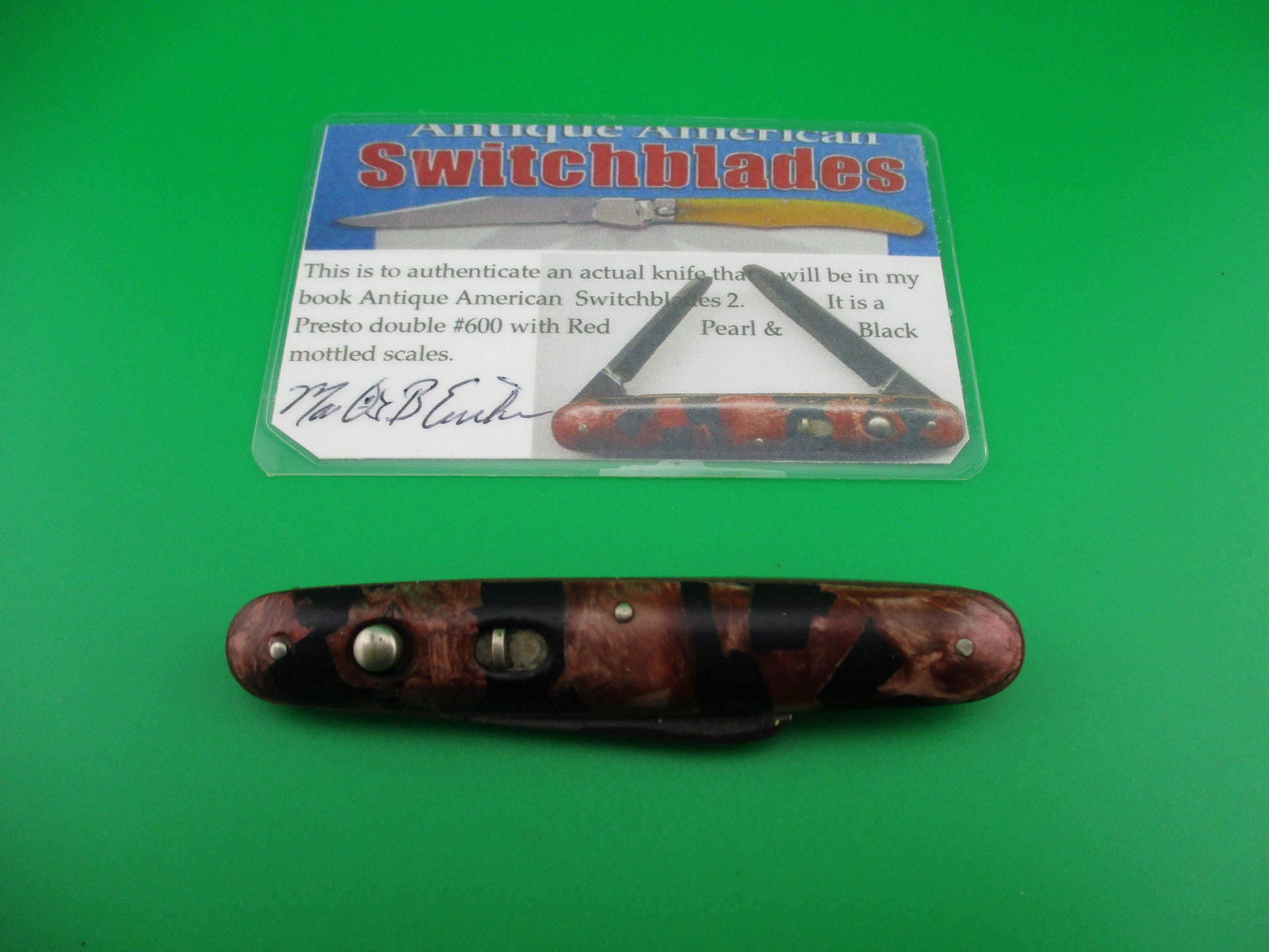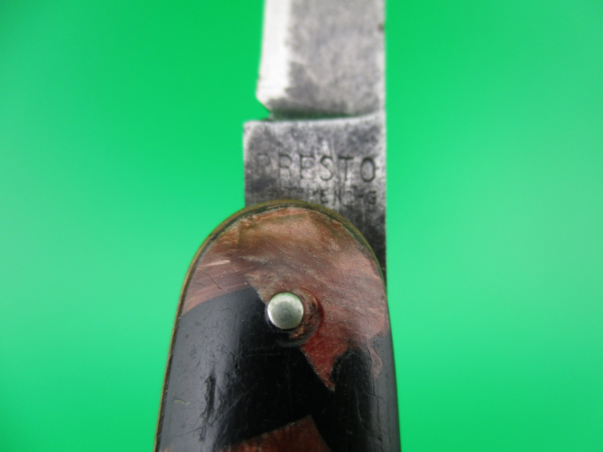 Vintage PRESTO double with celluloid scales (handles). The knife was made by the Geo Schrade Knife Co of Bridgeport, CT most likely between 1930 and 1940. It's the only size double made by the company and it measures 3 3/8" closed and 6 7/8" open with brass liners. Main blade is stamped PRESTO PAT PEND-G and the small blade is stamped G SCHRADE in an arch over B'PORT CT. The blades have both been sharpened with heavy patina, lots of scratches and some pitting and are about 90% full, or less. The Red Pearl & black mottled celluloid scales are very attractive, but there's a large crack through the button for the small blade, a tiny hairline by front button and lots of handling marks. The knife works with both tips even with the liners when closed, Good snap, open fully with kickback on the small blade. Large blade locks with 3/16" up and down and the small blade stays open, but doesn't lock. Both safeties work. This knife will be featured in the upcoming book Antique American Switchblades 2 and comes with a laminated Certificate of Authenticity. Condition isn't great, but it works. Fair- condition.