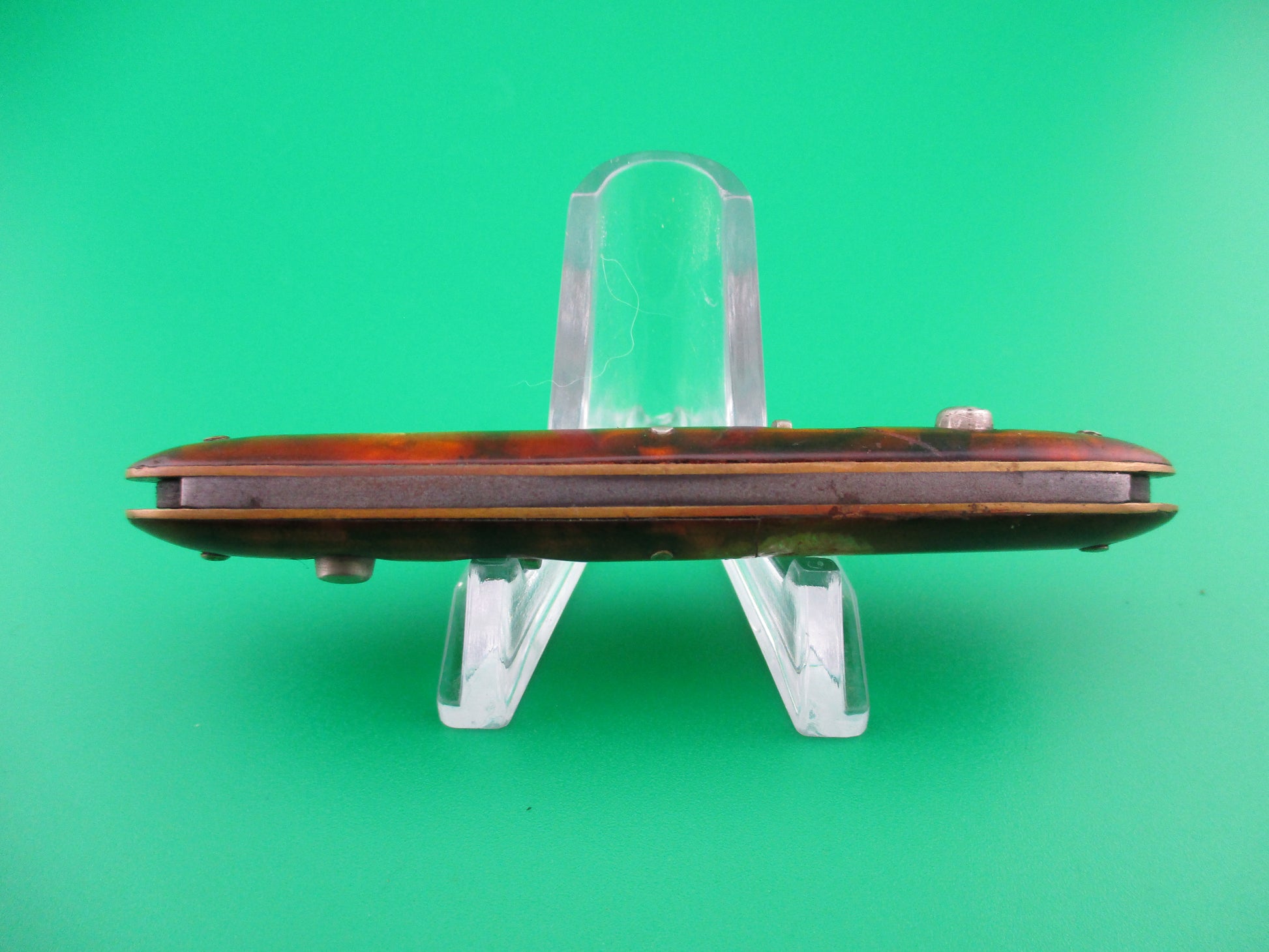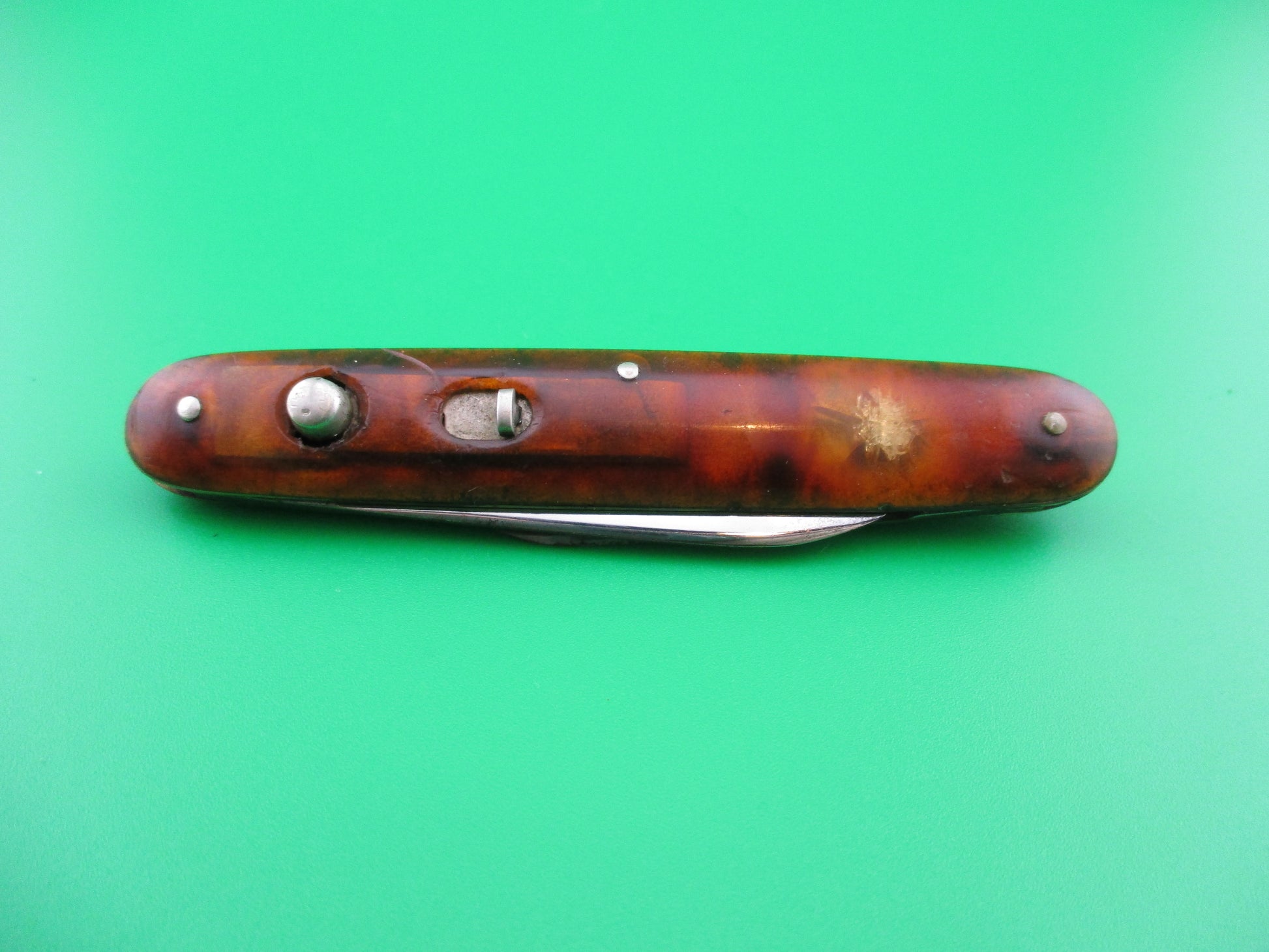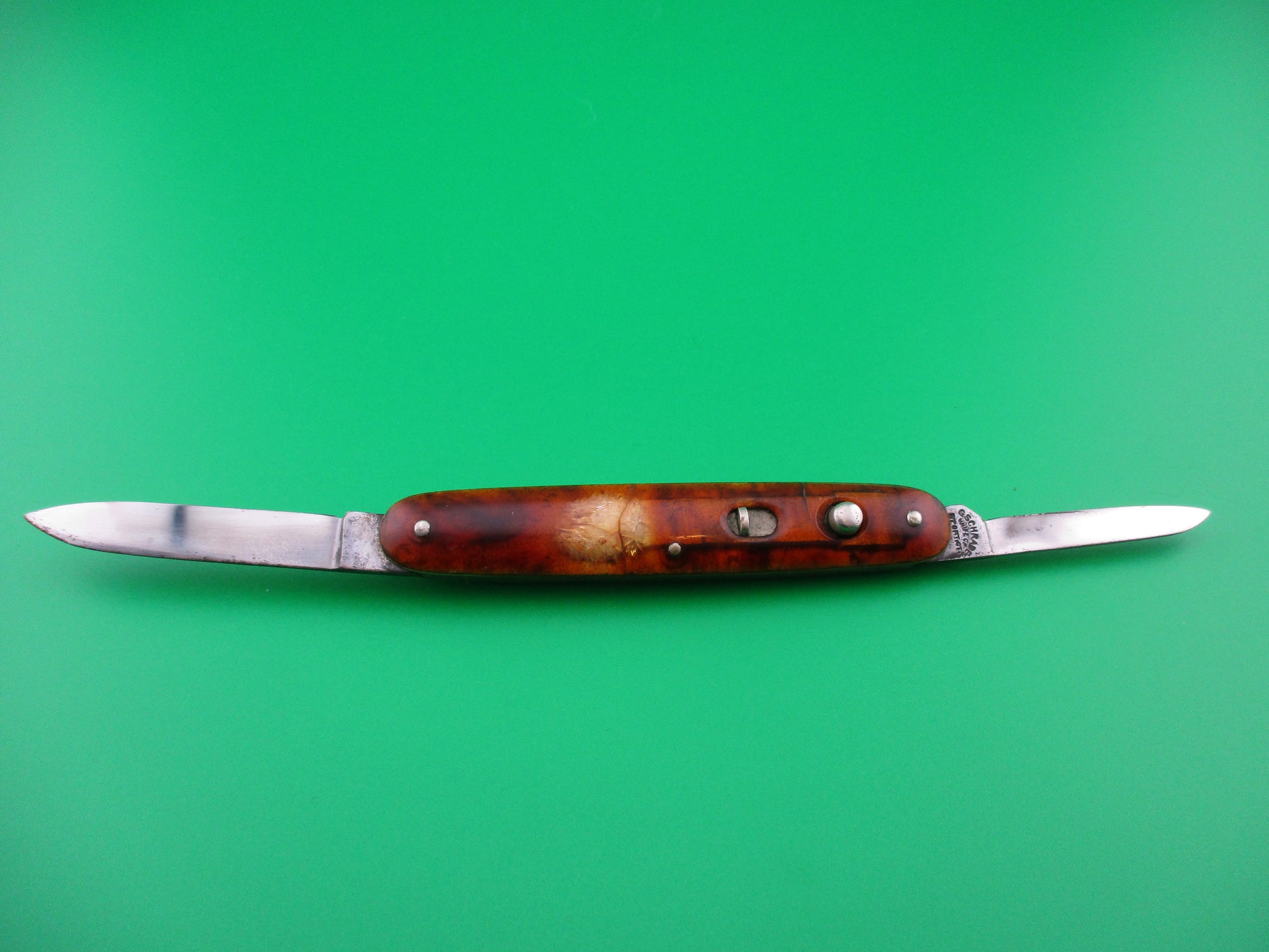 This is a PRESTO double with Tortoise celluloid scales (handles). The knife was made by the Geo Schrade Knife Co of Bridgeport, CT most likely between 1940 and 1956. It's the only size double made by the company and it measures 3 3/8" closed and 7 1/8" open with brass liners. Main blade is stamped PRESTO PAT JAN 30-40 MADE IN USA and the small blade is stamped G SCHRADE in an arch over B'PORT CT. The blades are mostly full and shiny with some of the original factory finish. The tortoise celluloid scales are very attractive, but there is some internal cracking in small spots on both scales and some handling marks. The knife works well with both tips at, or below the liners when closed, Good snap, open fully with no kickback and good lockup with very little movement. Both safeties work. Nice example of a vintage American PRESTO double switchblade.