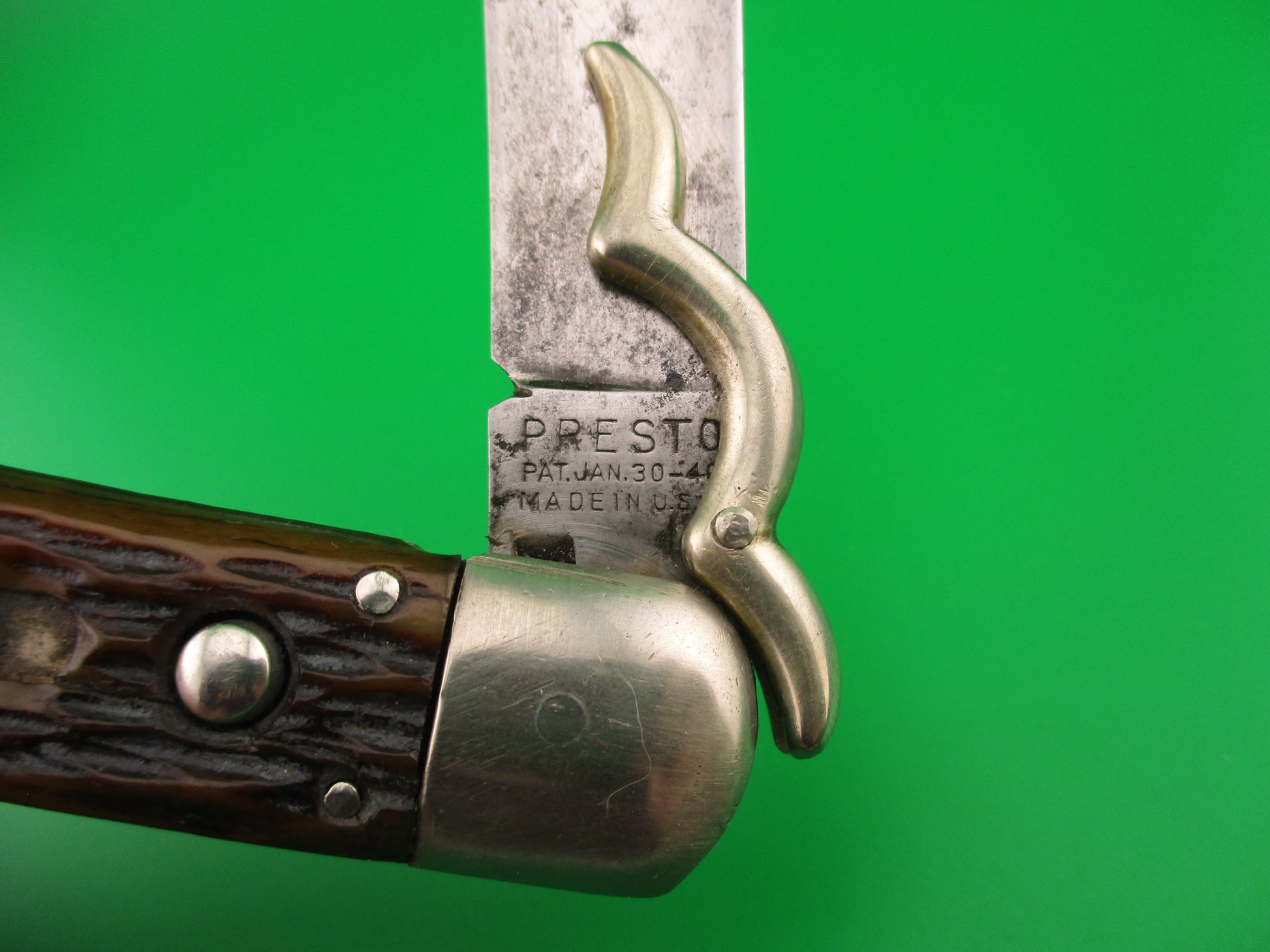 PRESTO Lazy W Folding Guard Hunter #8000 Jigged bone switchblade knife made by the George Schrade Knife Co of Bridgeport, CT sometime between 1940 and 1956. It was designated the model number 8000 and measures 5 inches closed and 8 3/4 inches open with steel liners and nickel silver bolsters, guards, button and safety. The clip blade is 98% full or better with patina, spotting, scratches and some scattered pitting, but overall good blade. The tang is marked PRESTO PAT JAN 30-40 MADE IN USA on the front and GEO SCHRADE KNIFE CO INC B'P'T, CONN on the rear. The jigged bone scales are in excellent condition and all original to the knife. The knife works well with the blade tip seating deep & centered in the well, good snap, guards fly into position, and very good lockup with less than 1/16" up and down at the tip. Does not rattle if shaken when blade is open except for the guards. Safety works. VG condition.