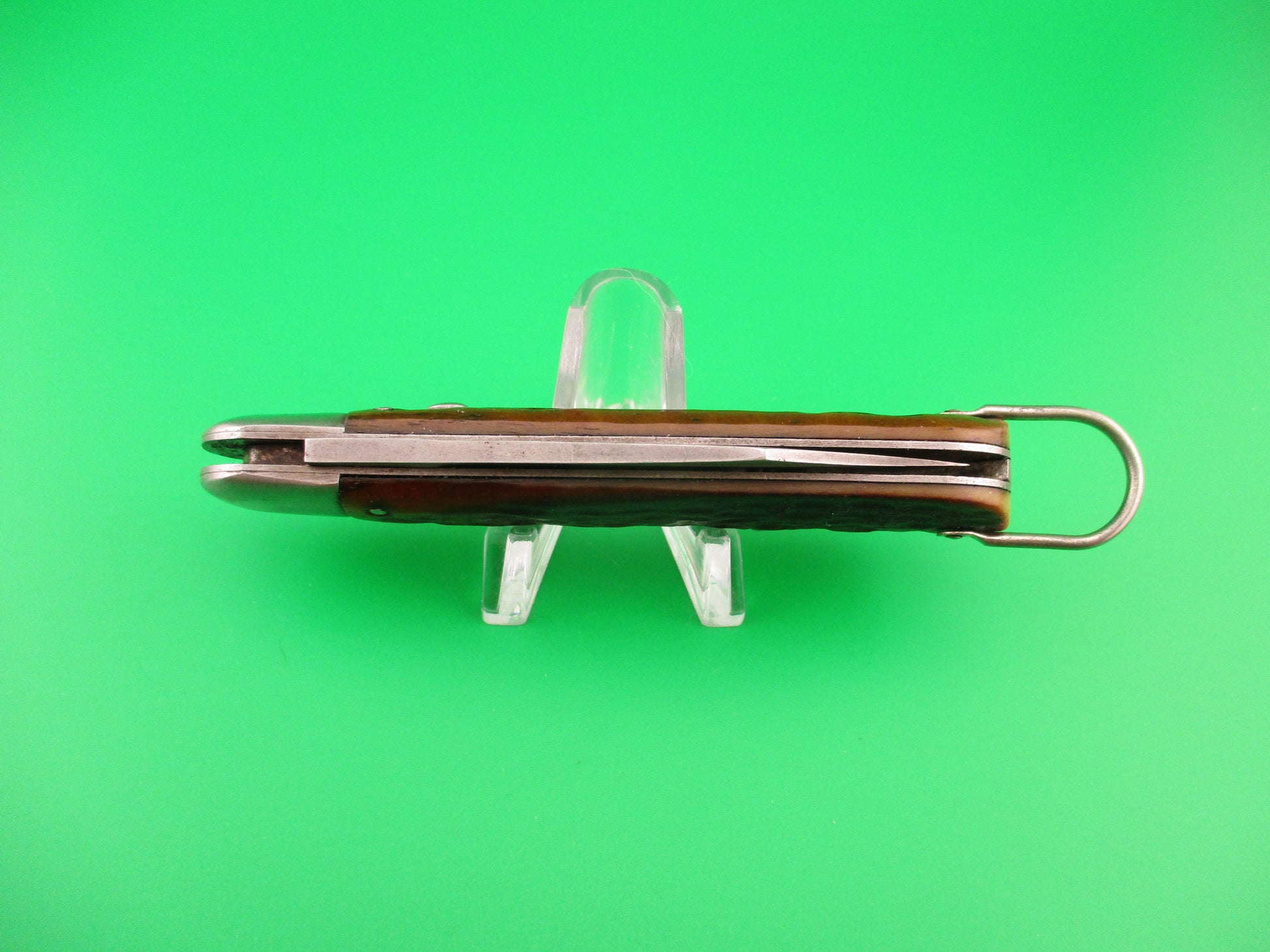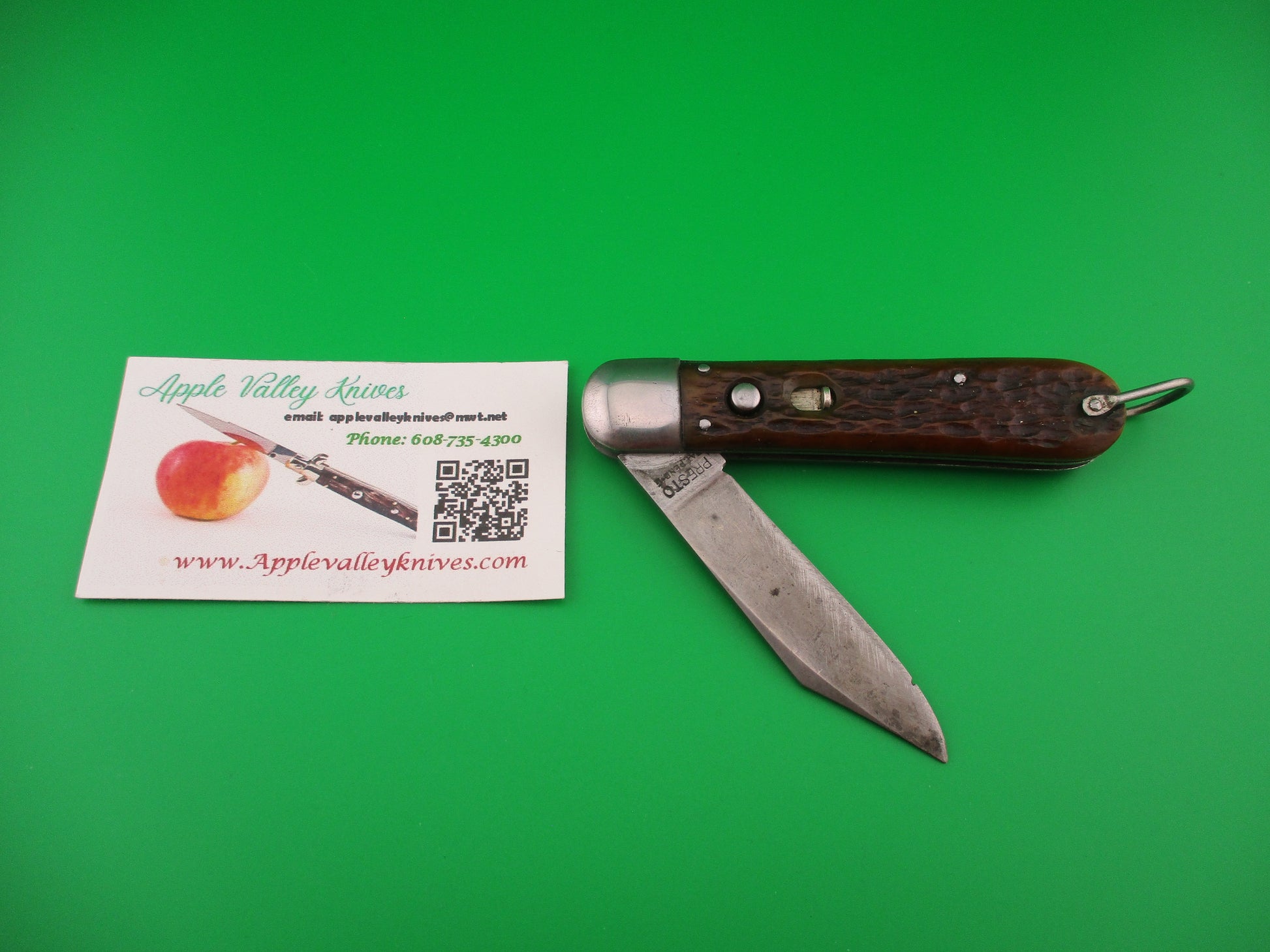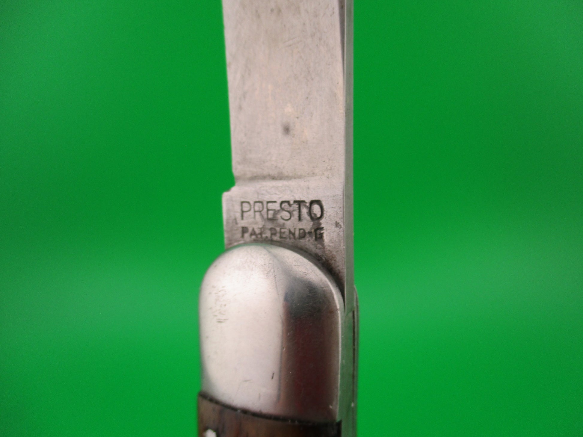 Vintage PRESTO M2 WWII jigged bone handled automatic knife made by the George Schrade Knife Co of Bridgeport, CT sometime between 1930 and 1942. It measures 4 1/8" closed and 7 inches open with steel liners, bolsters, bail & button with nickel silver safety. The clip blade is 95% full or better with scratches and spotting under a light patina and a tiny chip out of the cutting edge and is marked PRESTO over PAT PEND-G on the front and G SCHRADE over B'PORT CT on the rear. The scales are very nice dyed Jigged bone with no cracks or chips with lanyard ring (staple). The knife works well with blade tip deep and centered, strong snap and good lockup with about 1/8" movement at the tip. Barely rattles if shaken with blade open. Safety works. EX- condition.