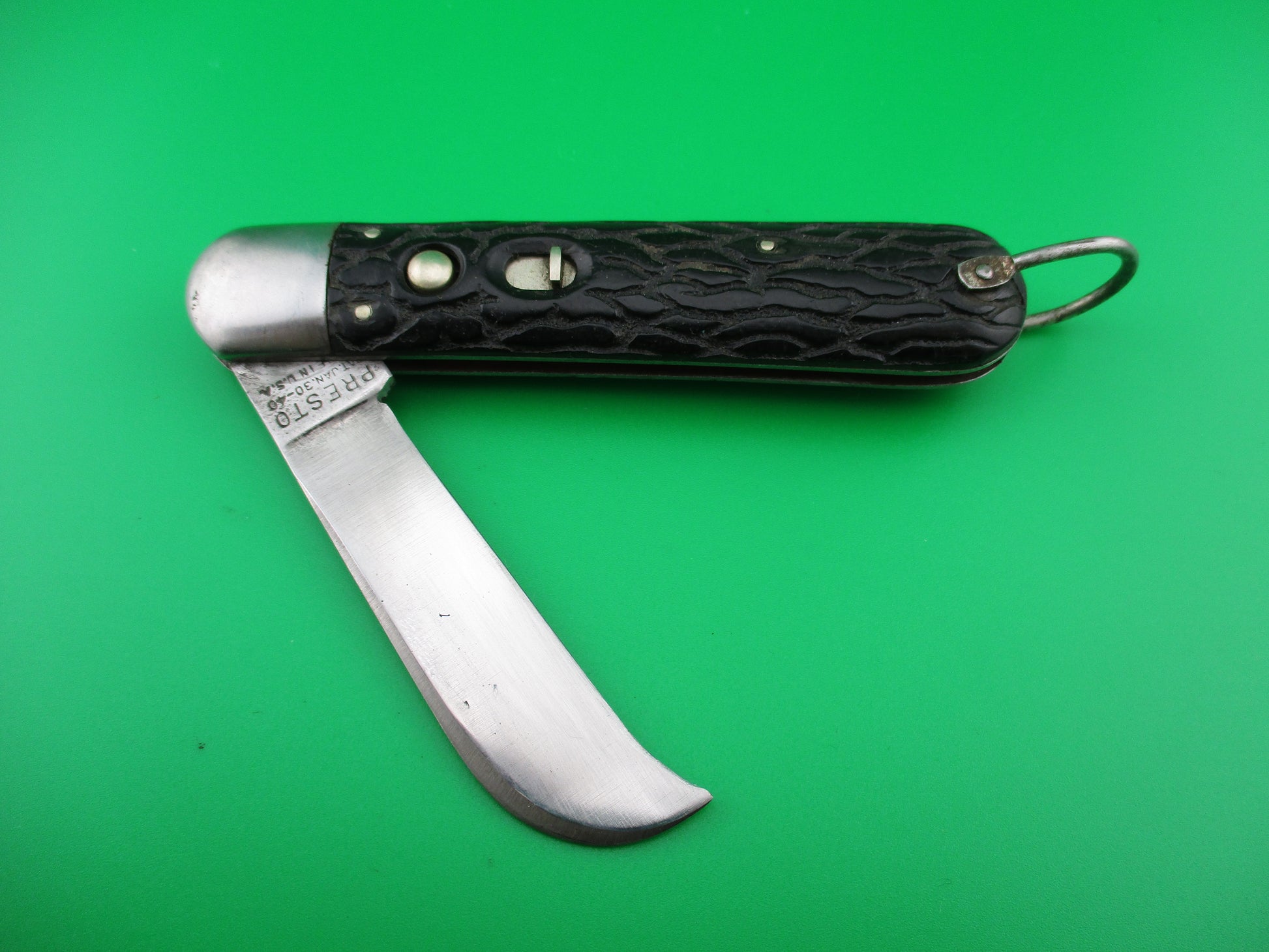 PRESTO M2 Black Wormgroove handles vintage switchblade knife. This knife was made by the George Schrade Knife Co of Bridgeport, CT sometime between 1940 and 1956. It measures 4 1/8" closed and 6 3/4" open with steel liners, bolsters and lanyard ring, but nickel silver button and safety. The hawk bill blade is about 92% full with light scratches and missing a bit from sharpening and is stamped PRESTO PAT JAN 30-40 MADE IN USA front and GEO SCHRADE KNIFE CO INC BPT CONN rear. The scales are in nice condition with no cracks or shrinkage and has bail (staple) to attach a cord. The knife works well with blade tip deep and centered, strong snap and good lockup with about 1/8" up and down at the tip. Very likely military issue, probably post WWII, though some believe that these were issued near the end of the war. Also sold after the war and sometimes advertised as a flooring/carpet knife. Safety works well. VG+ condition.