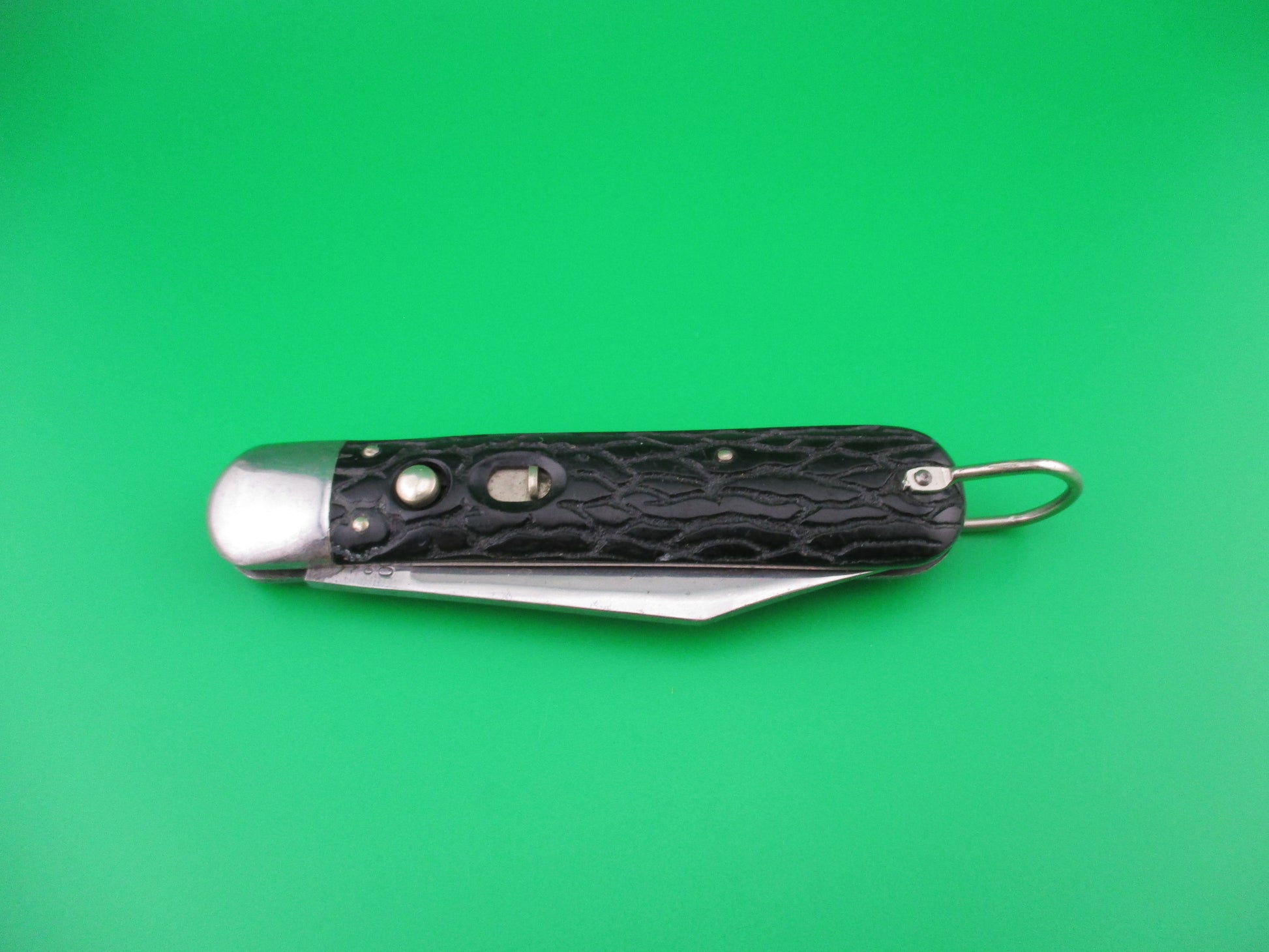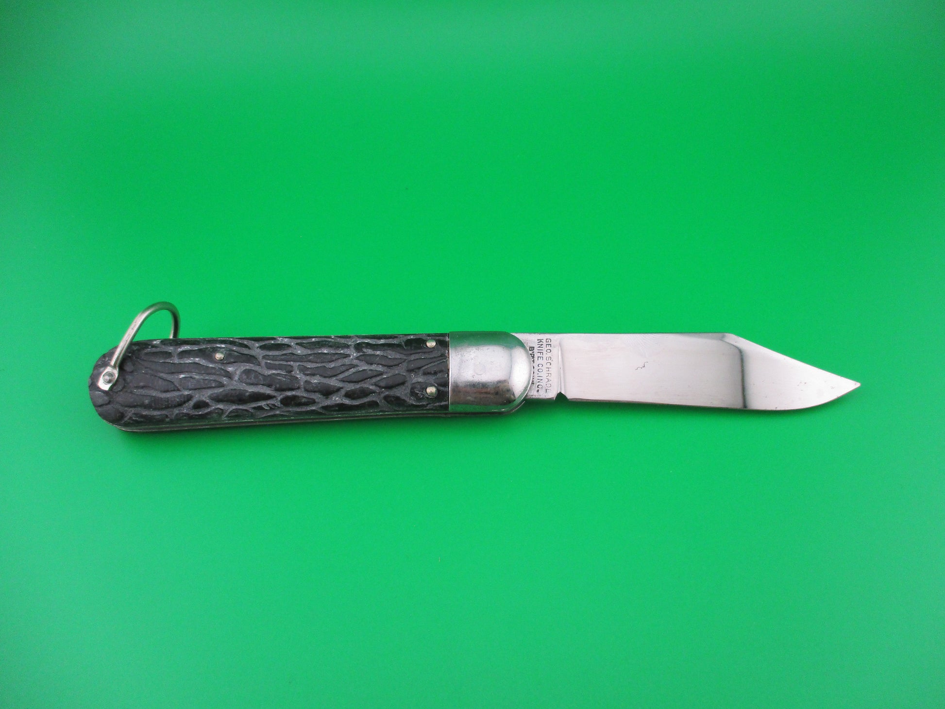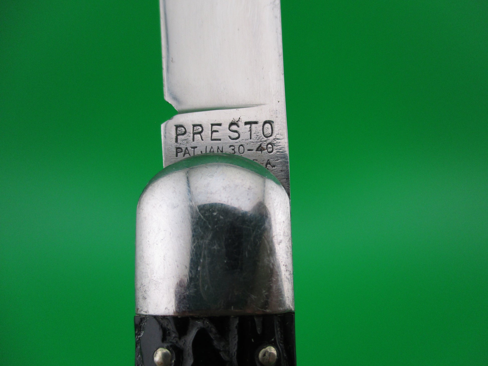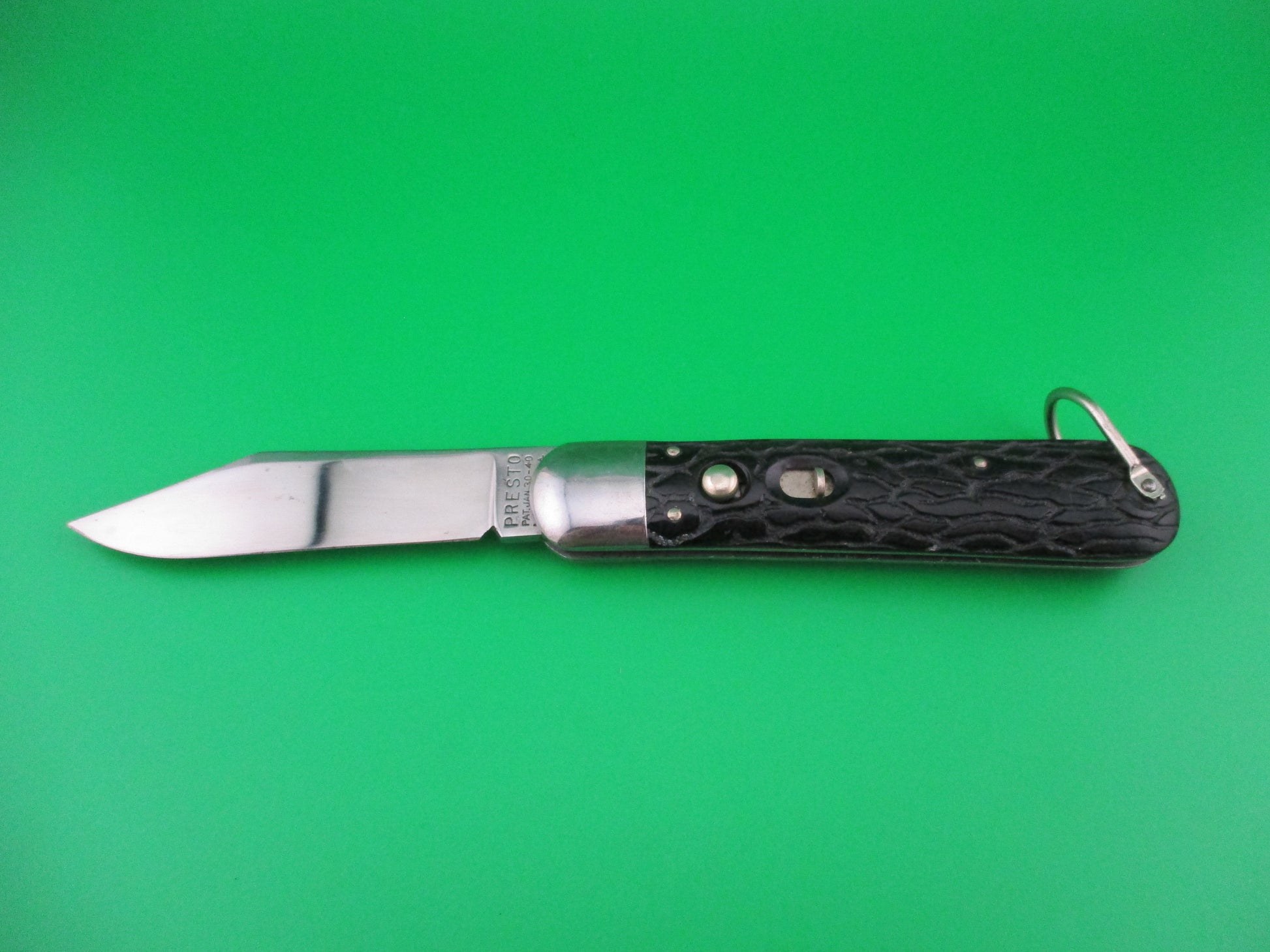 Vintage PRESTO M2 WWII Black Worm groove handles vintage switchblade knife. This knife was made by the George Schrade Knife Co of Bridgeport, CT sometime between 1940 and 1956. It measures 4 1/8" closed and 7 1/8" open with steel liners, bolsters and lanyard ring, but nickel silver button and safety. The clip blade is 100% full with original factory finish intact and is stamped PRESTO PAT JAN 30-40 MADE IN USA front and GEO SCHRADE KNIFE CO INC BPT CONN rear. The scales are in nice condition with no cracks or shrinkage and has bail (staple) to attach a cord. The knife works well with blade tip deep and centered, strong snap and good lockup. Safety works. Nearly new condition.