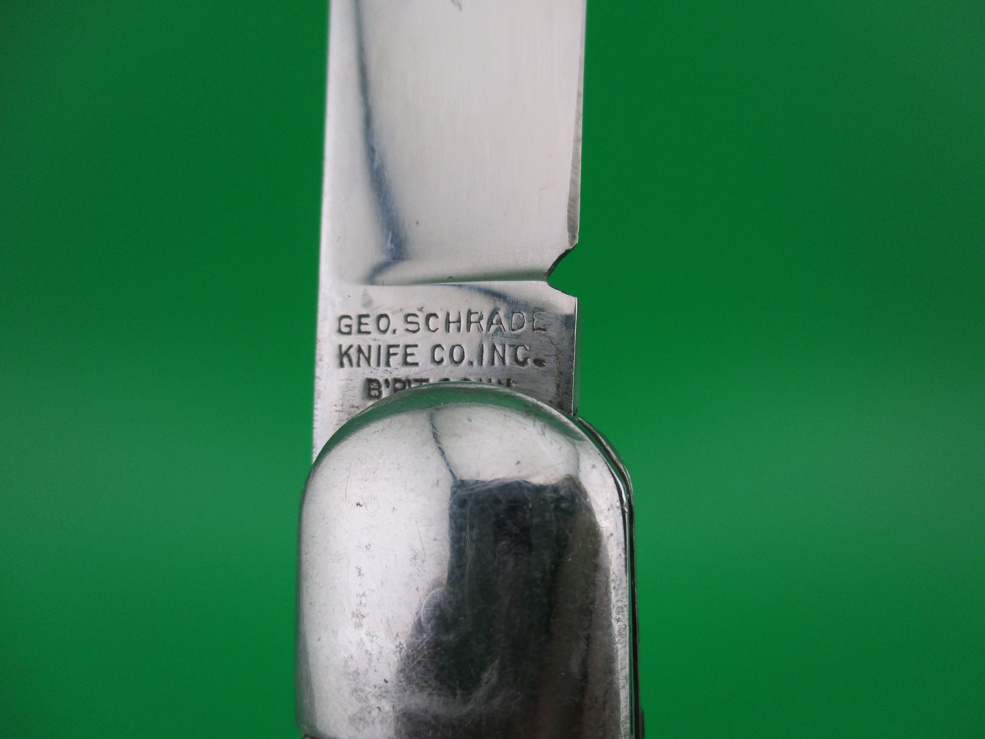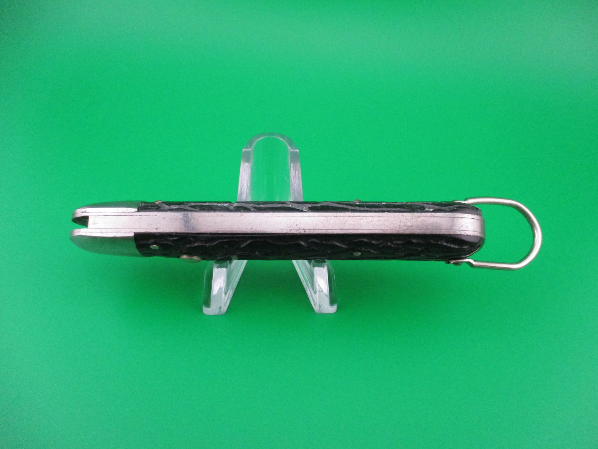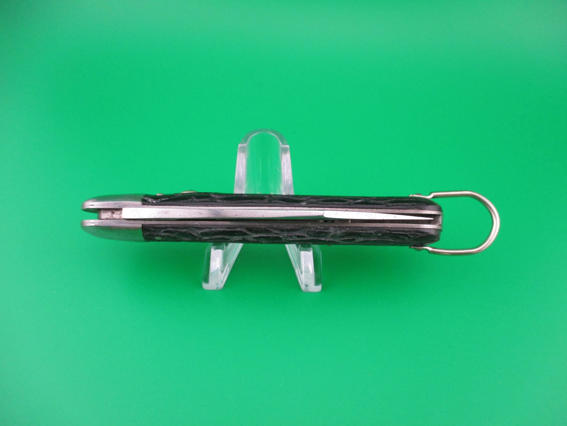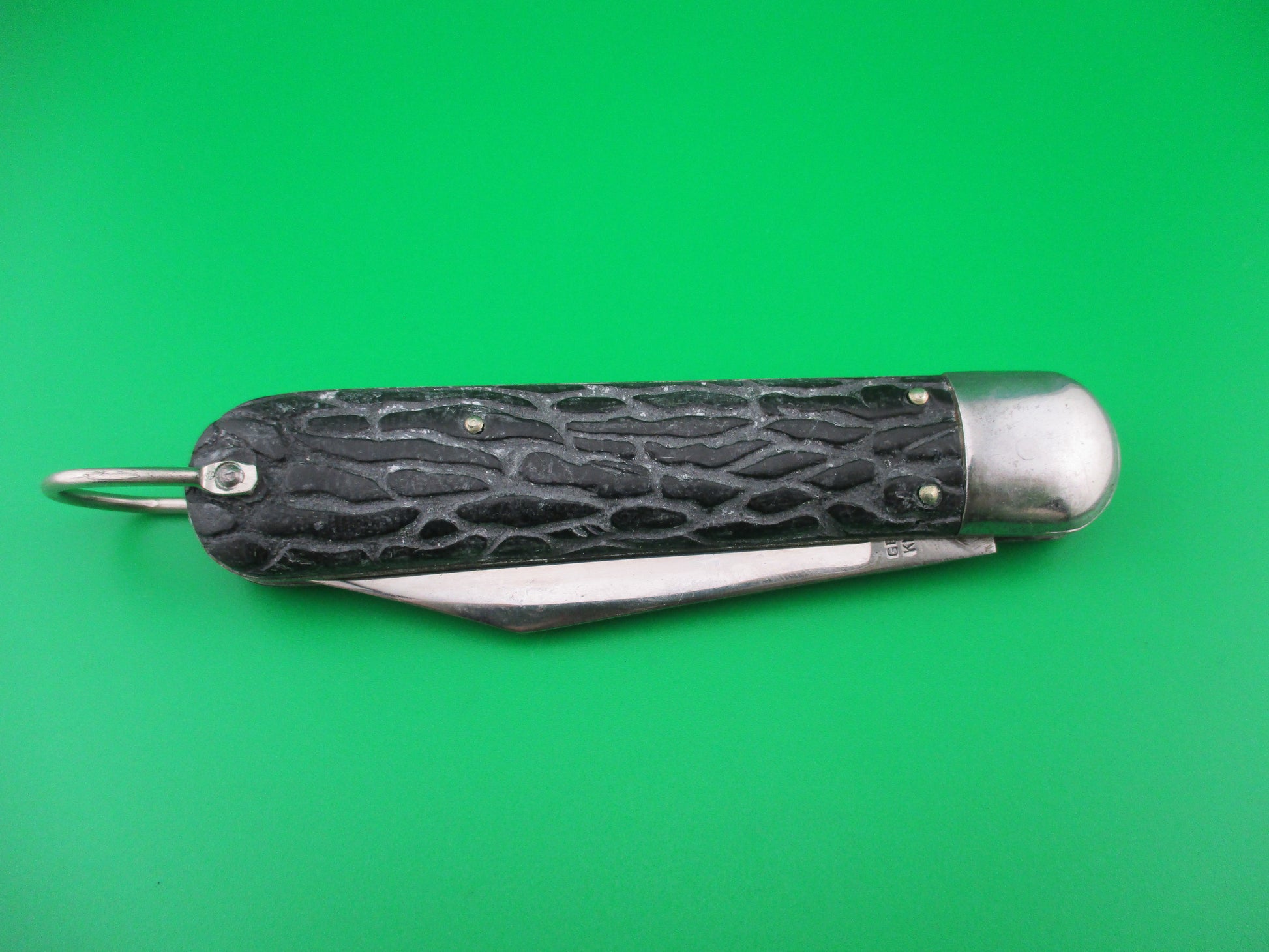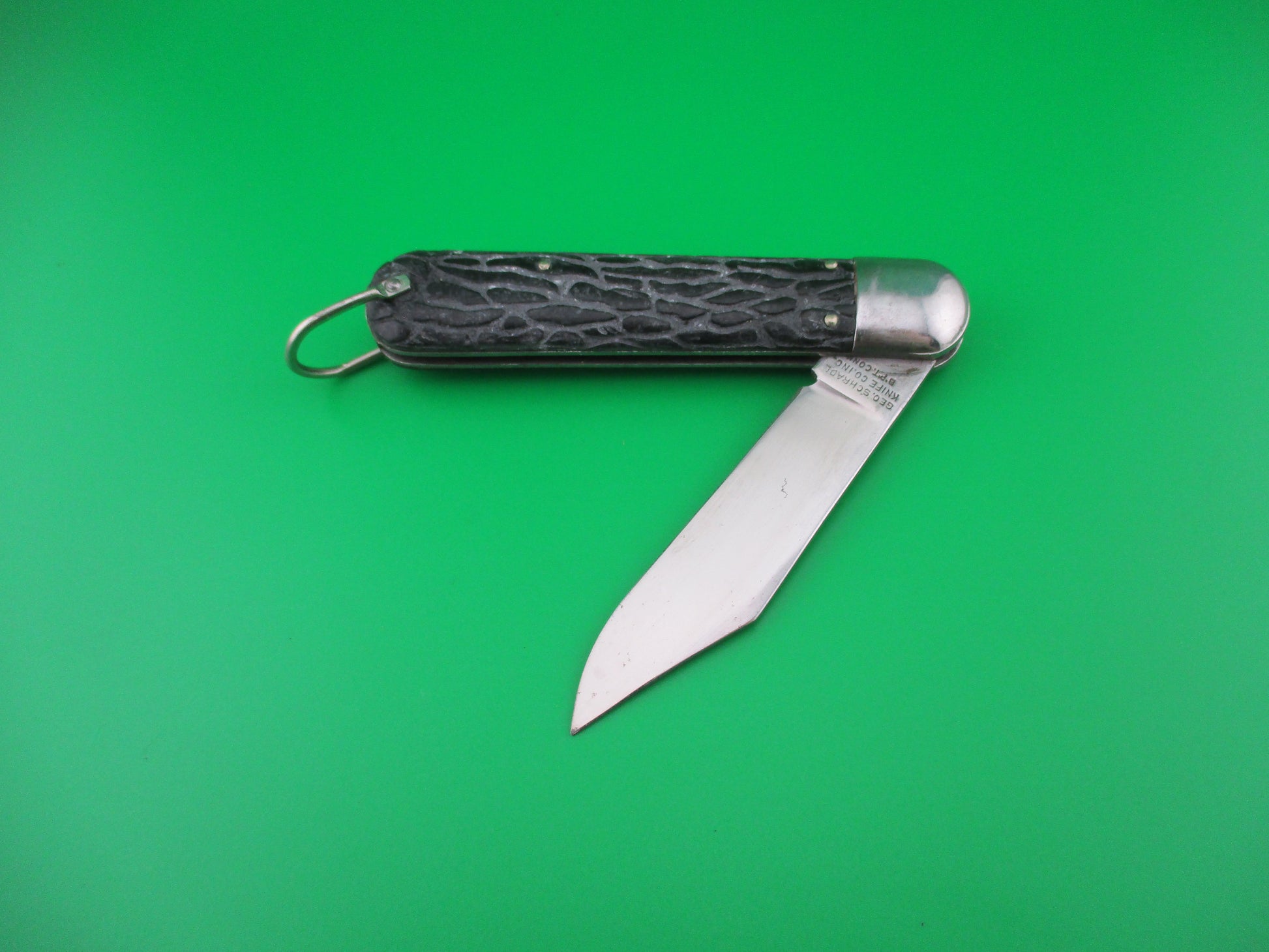 Vintage PRESTO M2 WWII Black Worm groove handles vintage switchblade knife. This knife was made by the George Schrade Knife Co of Bridgeport, CT sometime between 1940 and 1956. It measures 4 1/8" closed and 7 1/8" open with steel liners, bolsters and lanyard ring, but nickel silver button and safety. The clip blade is 100% full with original factory finish intact and is stamped PRESTO PAT JAN 30-40 MADE IN USA front and GEO SCHRADE KNIFE CO INC BPT CONN rear. The scales are in nice condition with no cracks or shrinkage and has bail (staple) to attach a cord. The knife works well with blade tip deep and centered, strong snap and good lockup. Safety works. Nearly new condition.