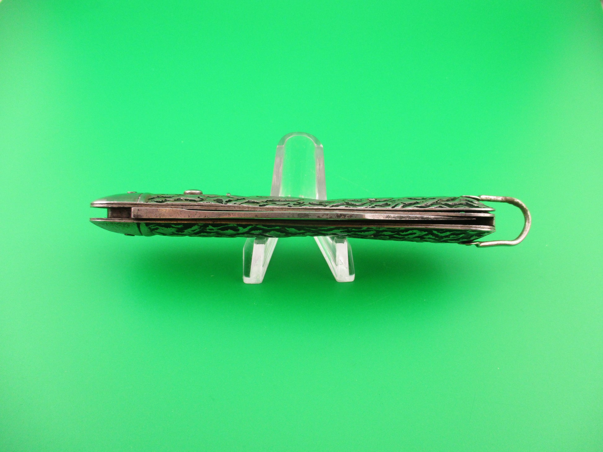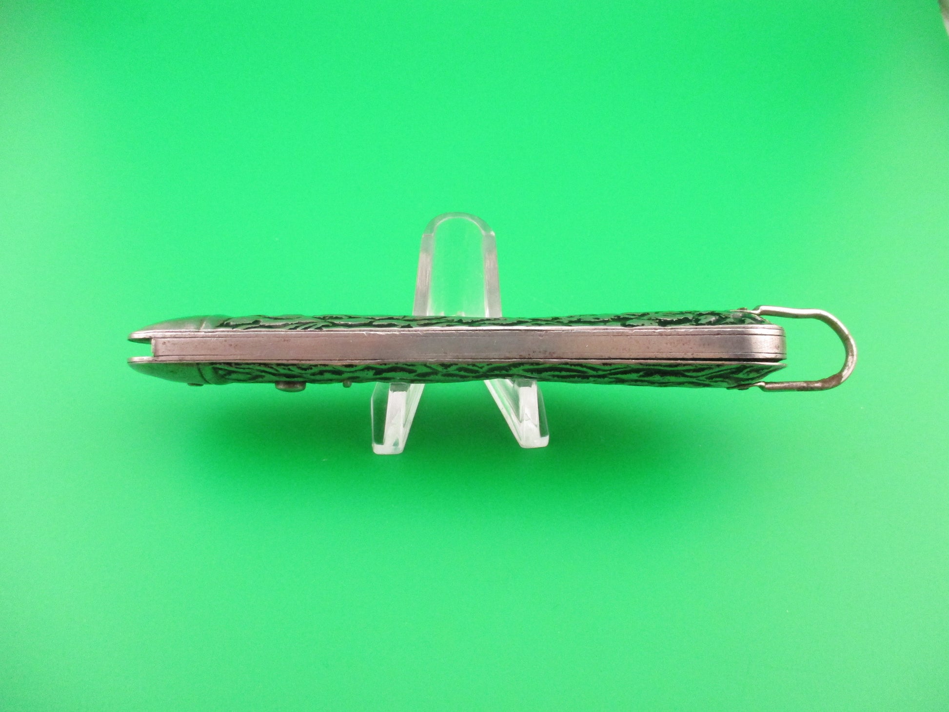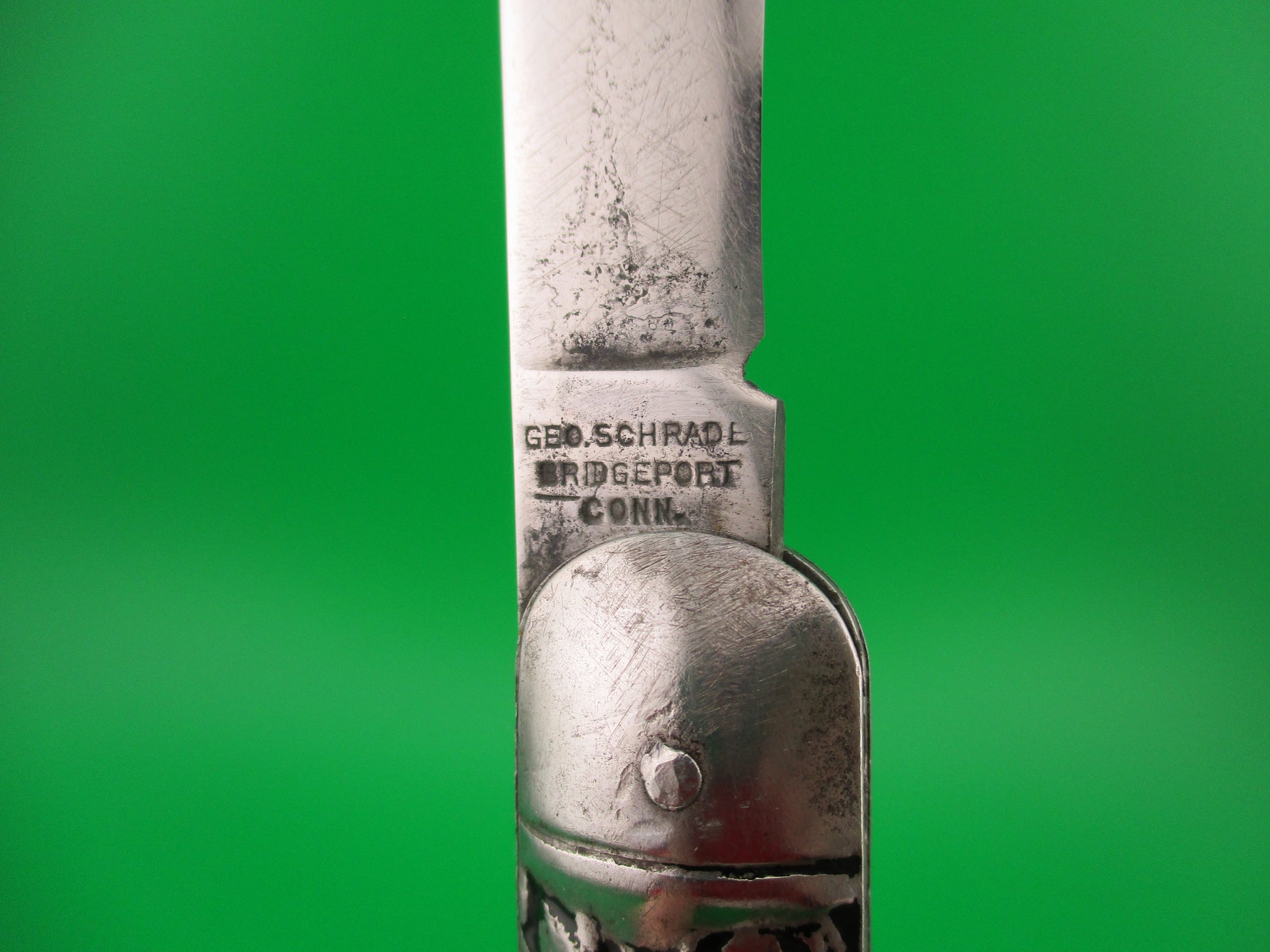 Vintage Presto hunter switchblade with painted black metal handles made by the Geo Schrade Knife Co of Bridgeport, CT sometime between 1929 and 1955. It's the largest model that they offered measuring 5 inches closed and 8 5/8 inches open with steel liners, button & safety. The blade is 94% full or better with lots of light scratches from sharpening/use and the tang is stamped PRESTO MADE IN USA and the backside is marked GEO SCHRADE BRIDGEPORT CONN. The painted metal scales are in good condition with some of the original paint intact. The knife functions well with the blade tip deep in the well closed, good snap and very loose lockup with about 1/2" up and down at the tip and some side to side. Knife does rattle if shaken with blade open, as most of these 70+ year old used switchblades do. VG- condition.