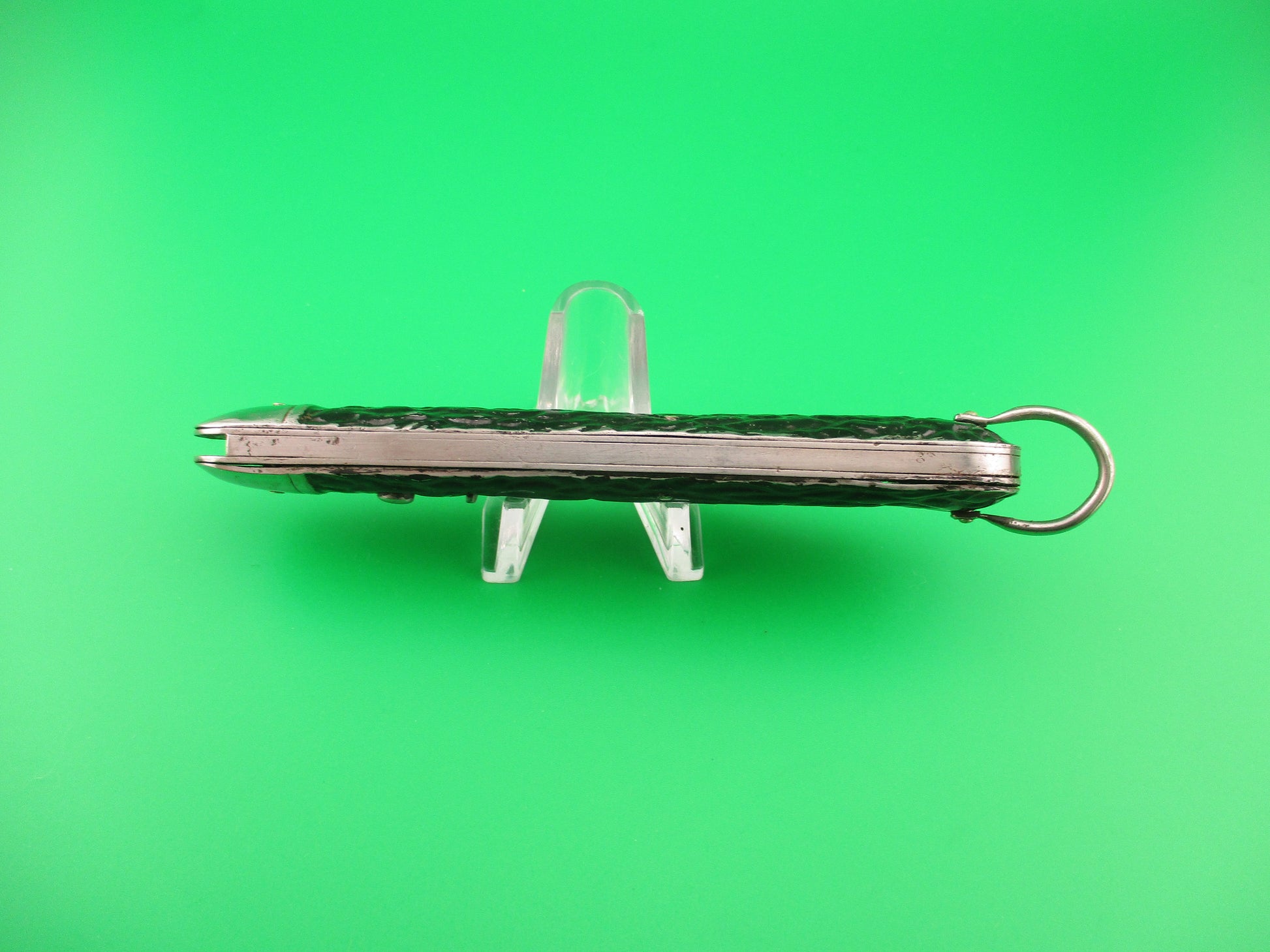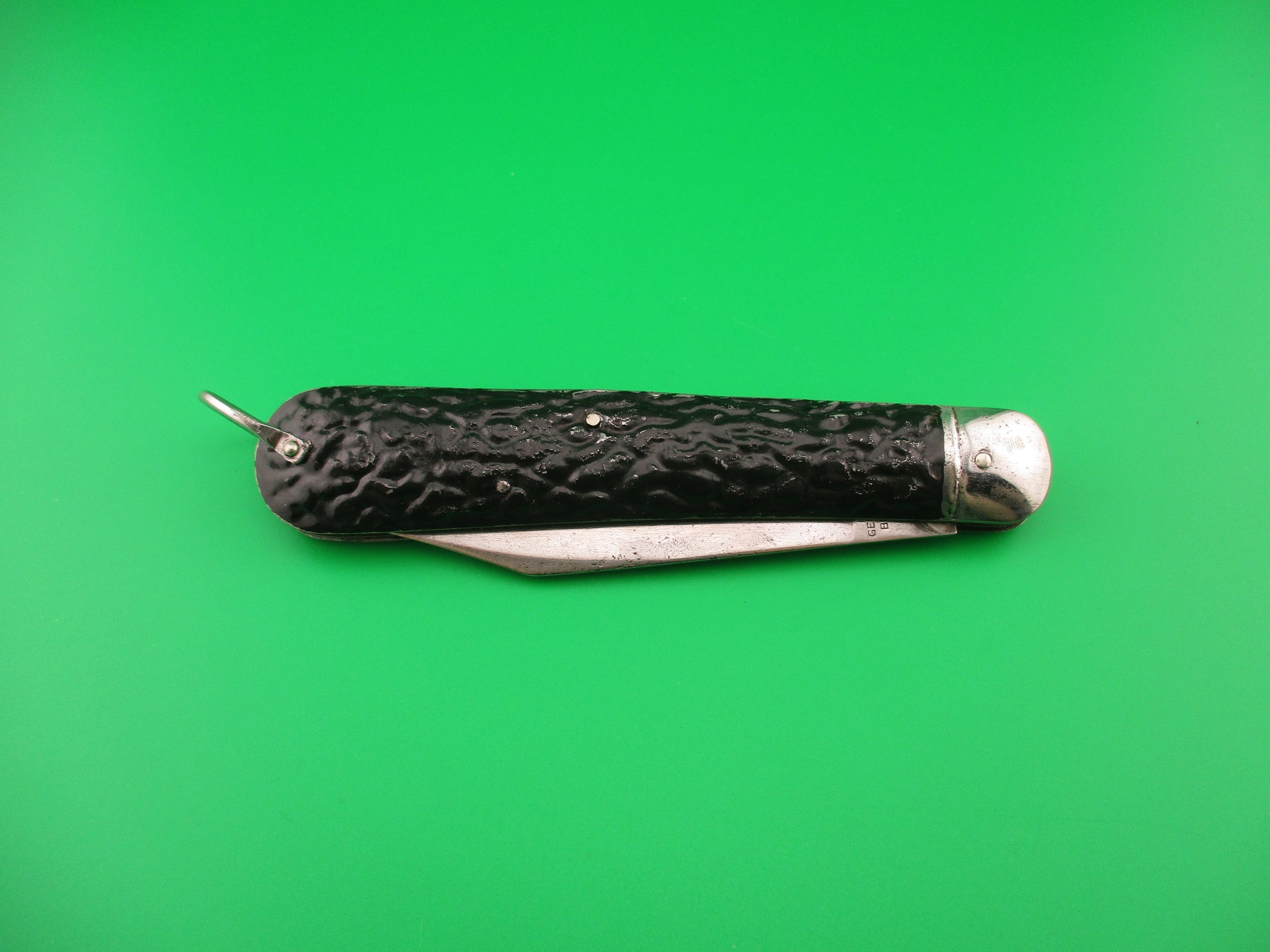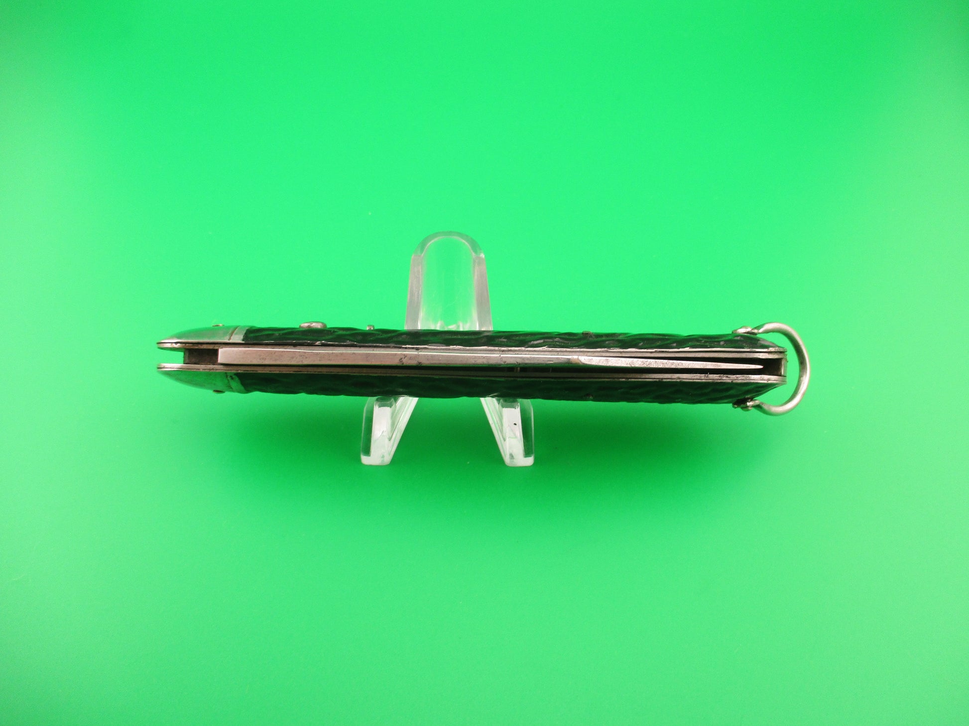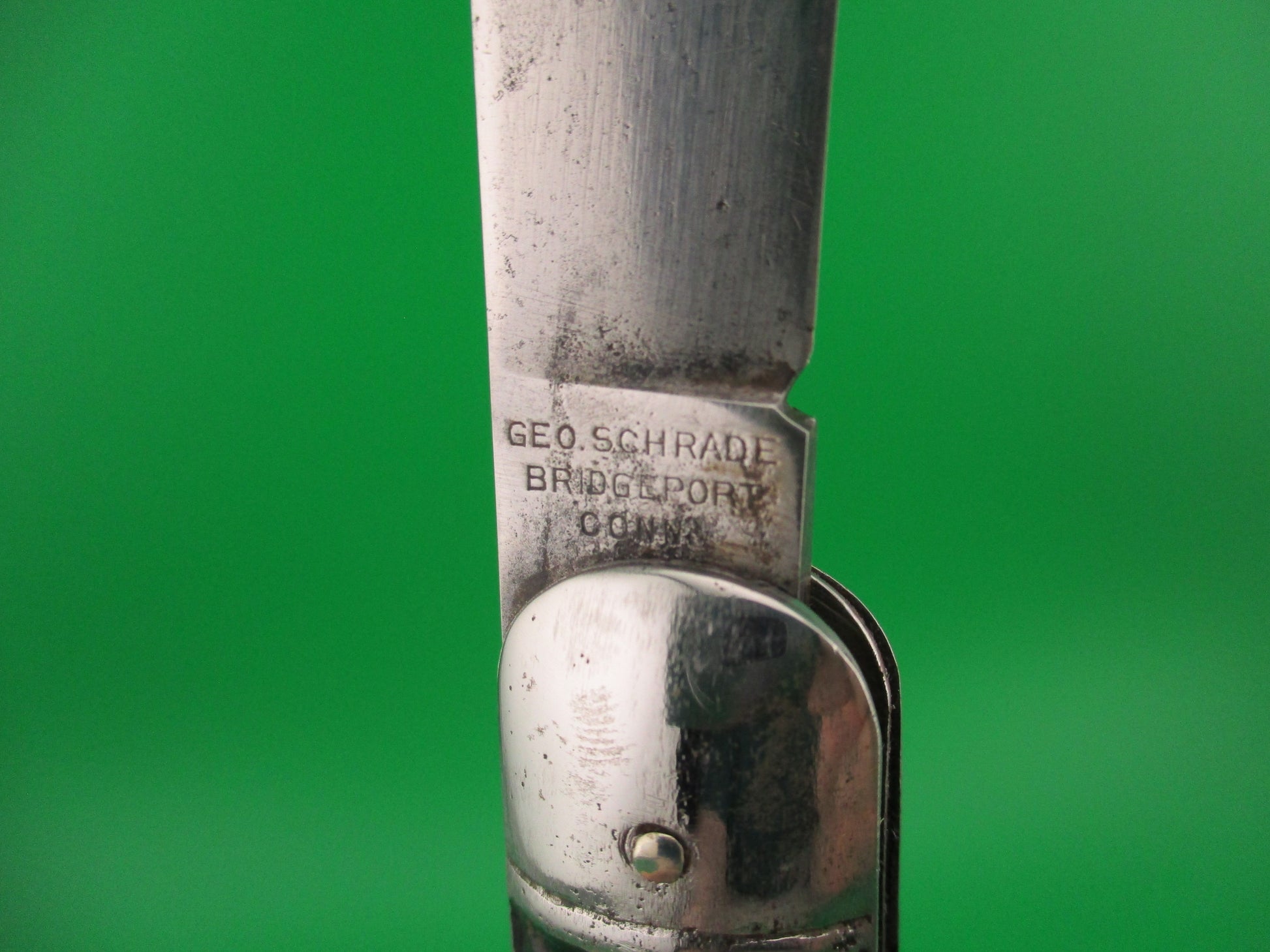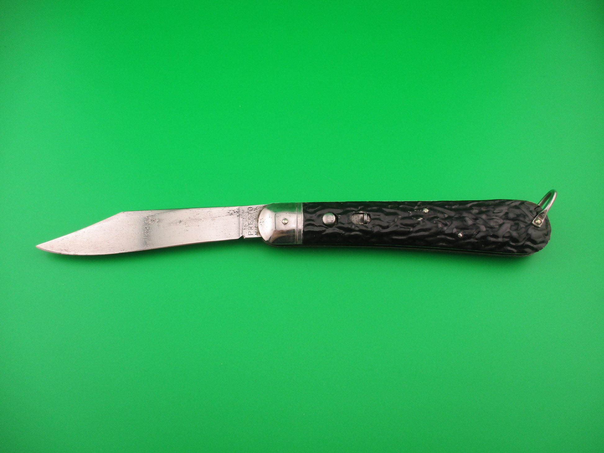 Vintage Presto MADE IN USA Vintage Paratrooper style Hunter Metal switchblade w lanyard ring & painted black metal handles. It was made by the Geo Schrade Knife Co of Bridgeport, CT sometime between 1929 and 1955. It's the largest model that they offered measuring 5 inches closed and 8 3/4 inches open with steel liners, button & safety. The blade is 97% full or better with lots of light scratches and some light pitting and the tang is stamped PRESTO MADE IN USA and the backside is marked GEO SCHRADE BRIDGEPORT CONN. The painted metal scales are in good condition with all the black paint intact, but likely has been repainted. The knife functions well with the blade tip deep and centered in the well closed, good snap and below average lockup with about 1/8" up and down at the tip and some side to side. Knife does rattle if shaken with blade open, as most of these 70+ year old used switchblades do. Safety works. VG condition.
