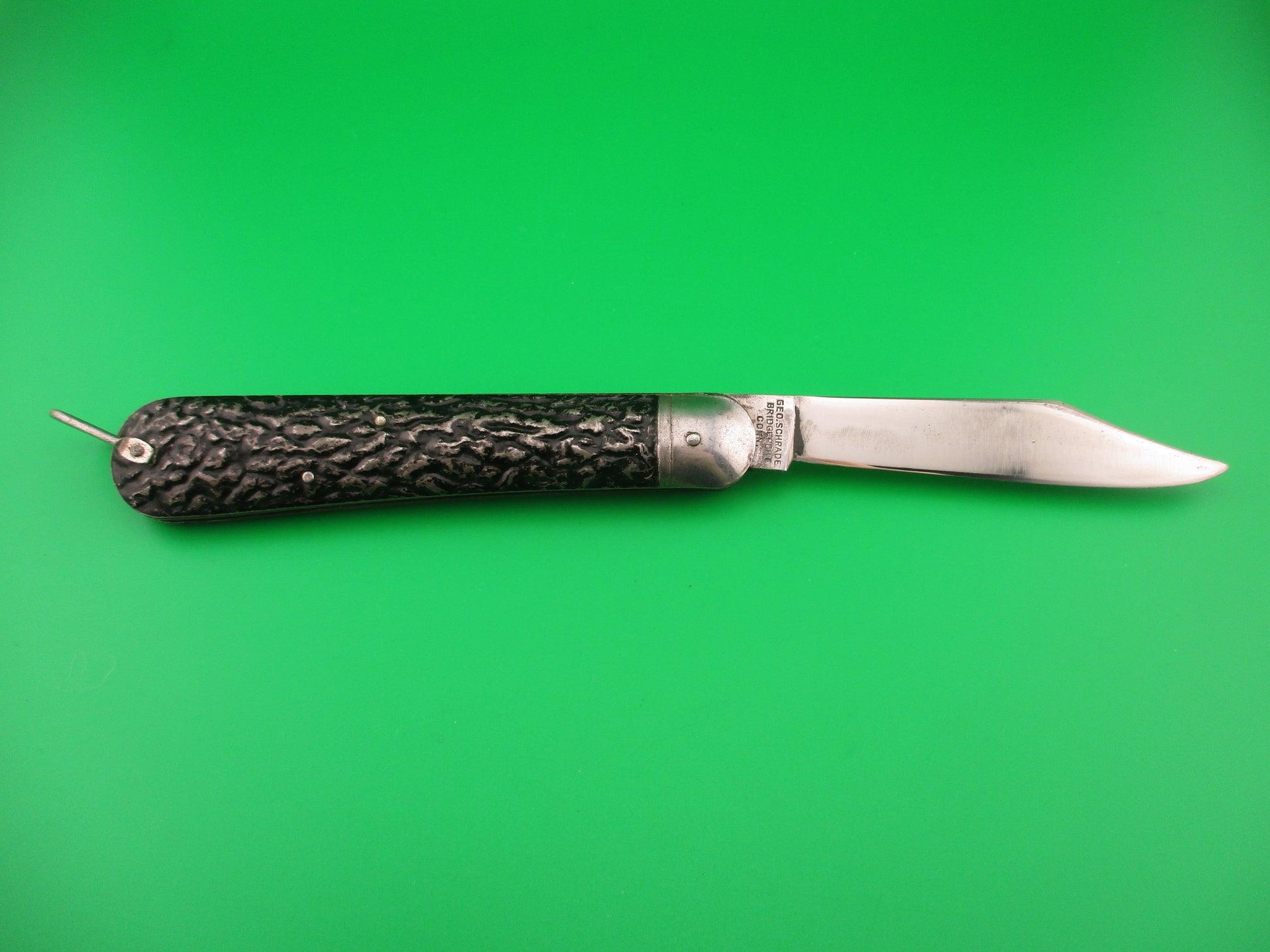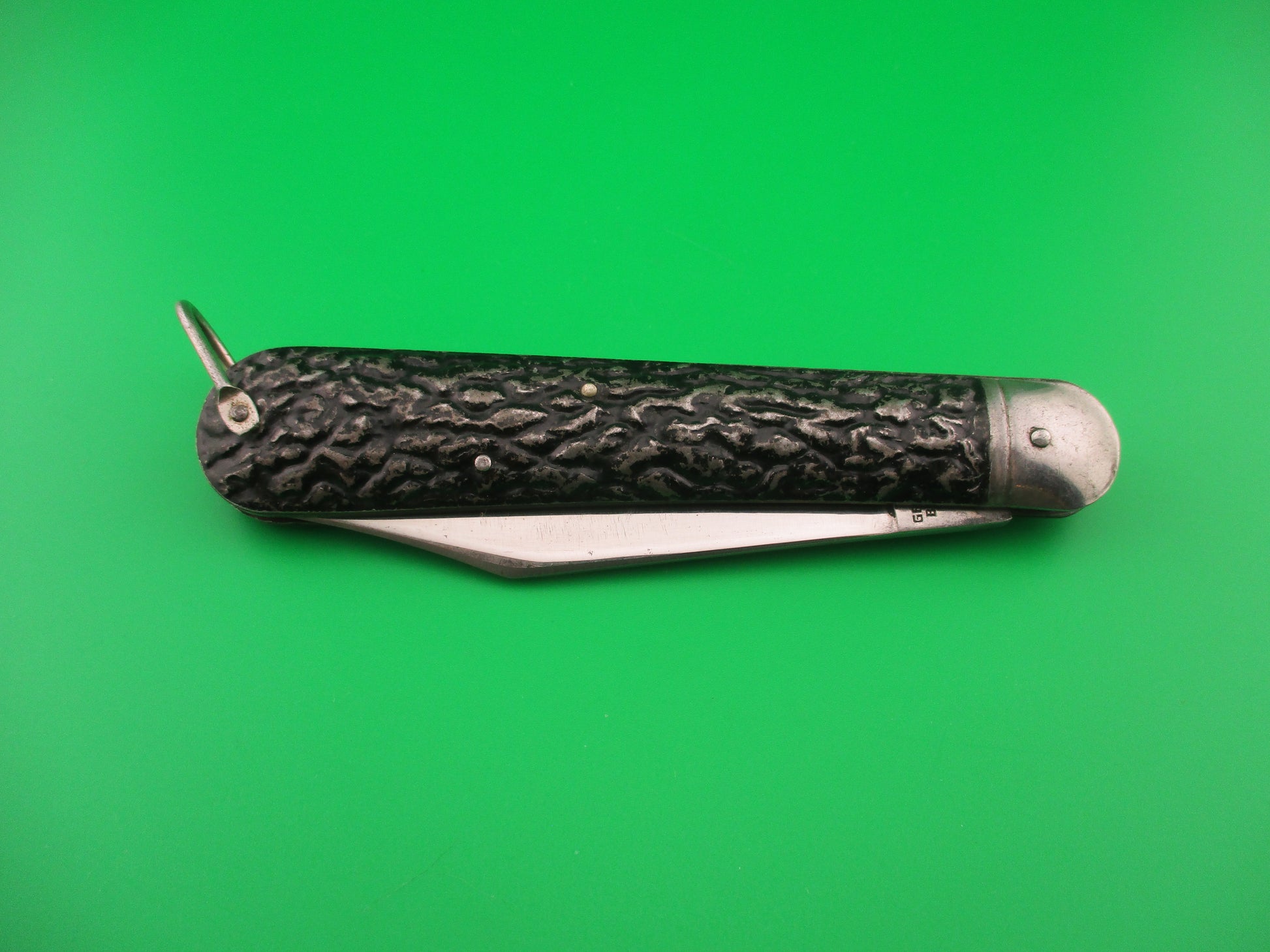 Presto MADE IN USA Vintage Paratrooper style Hunter Metal switchblade w lanyard ring & painted black metal handles made by the Geo Schrade Knife Co of Bridgeport, CT sometime between 1929 and 1955. It's the largest model that they offered measuring 5 inches closed and 8 5/8 inches open with steel liners, button & safety. The blade is 96% full or better and shiny with light scratches from sharpening/use and the tang is stamped PRESTO MADE IN USA and the backside is marked GEO SCHRADE BRIDGEPORT CONN. The painted metal scales are in good condition with most of the original paint intact with worn high spots. The knife functions well with the blade tip deep & centered closed, strong snap and excellent lockup with less than 1/16" movement at the tip. No rattle if shaken with blade open! VG+ condition.
