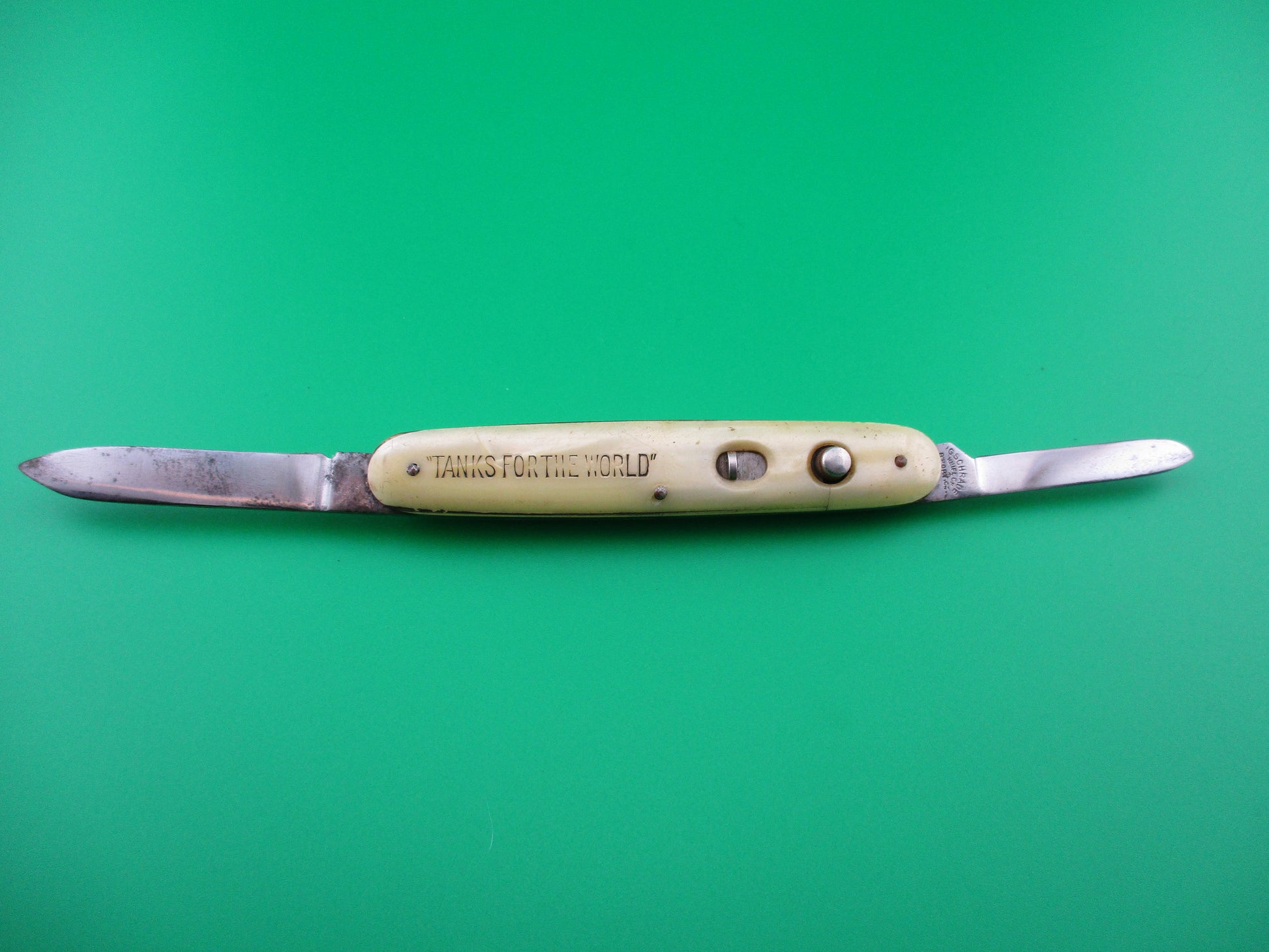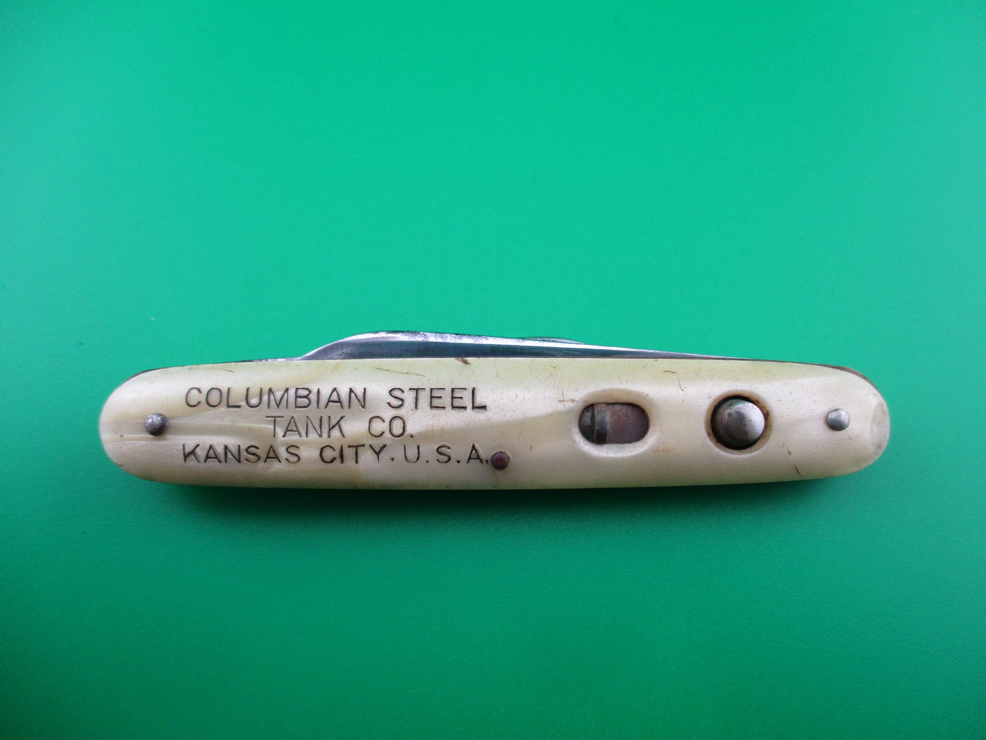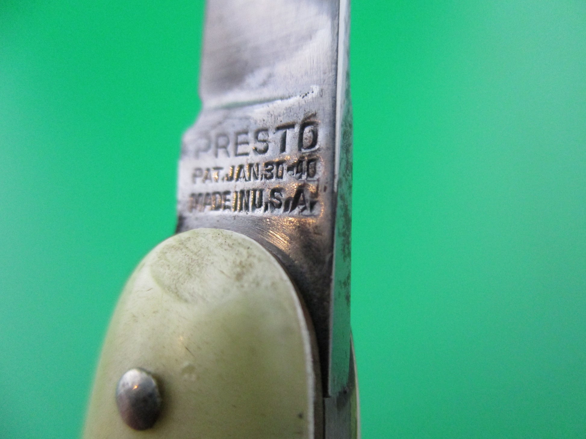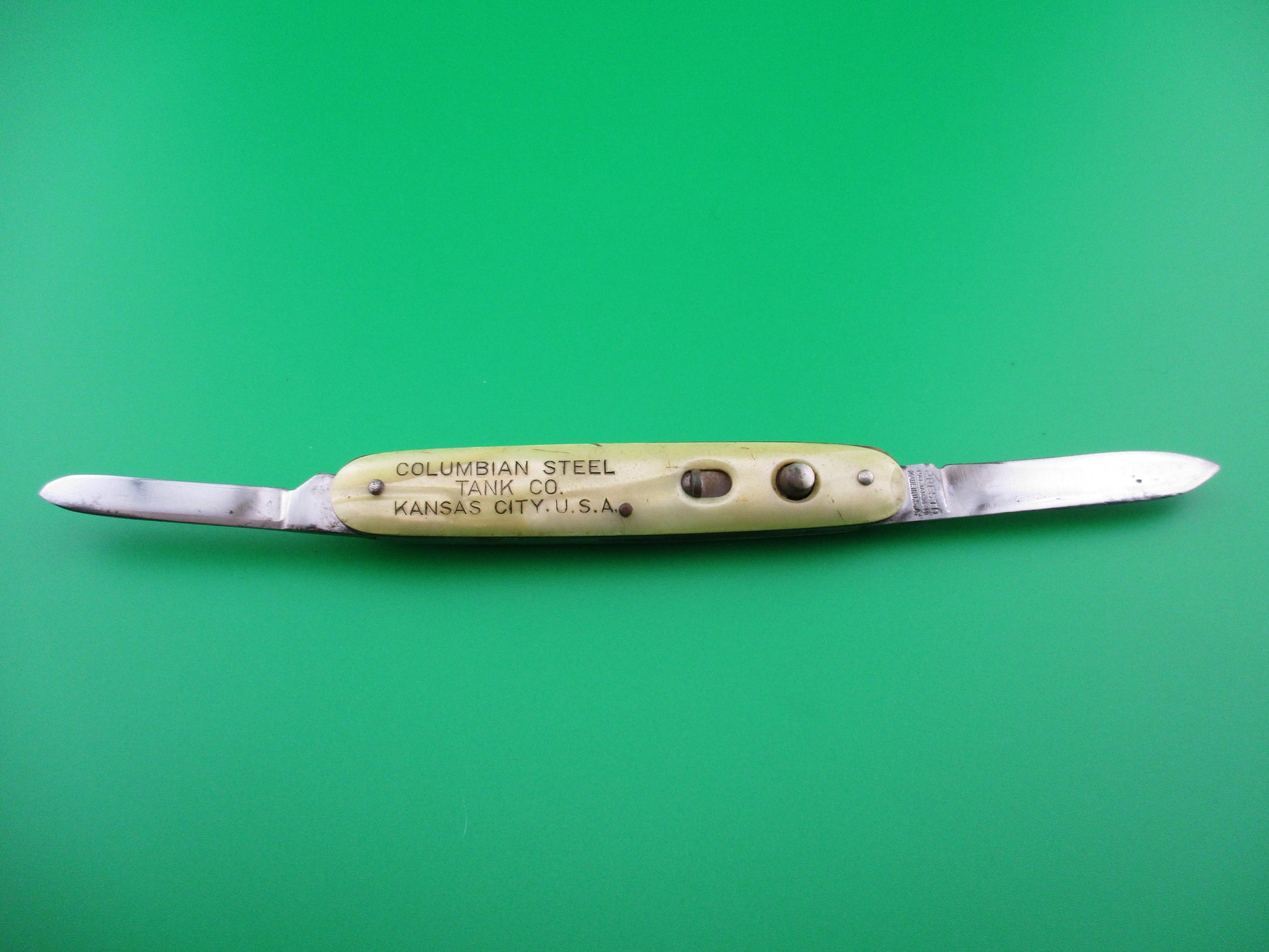 Nice old PRESTO double switchblade with marine pearl celluloid scales with advertising for the COLUMBIAN STEEL TANK Co. KANSAS CITY USA on the front and TANKS FOR THE WORLD on the back. Made by the George Schrade Knife Co of Bridgeport, CT in the 1940s or early 50s. It measures 3 3/8" closed and just over 7 inches with both blades open and has brass liners. The blades are mostly full and shiny with some light scratches and some light peppering with one pitted spot. Looks like they have been lightly cleaned. The scales are in good condition with one hairline crack by the button on the back side. The knife works well with the tip of the small blade peeking just a bit when closed. Both blades open fully and lock when the buttons are pressed. No kickback. Good lockup with just a little movement on each blade. Both safeties work. Nice old American double switchblade.
