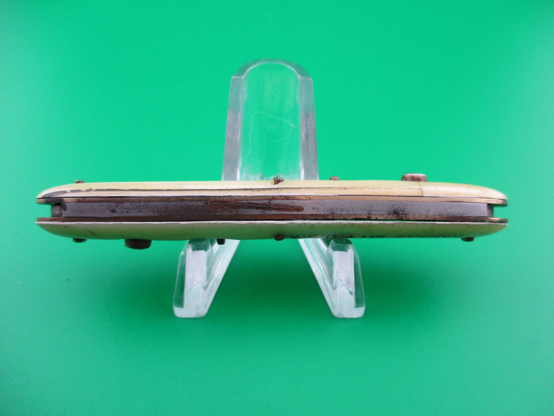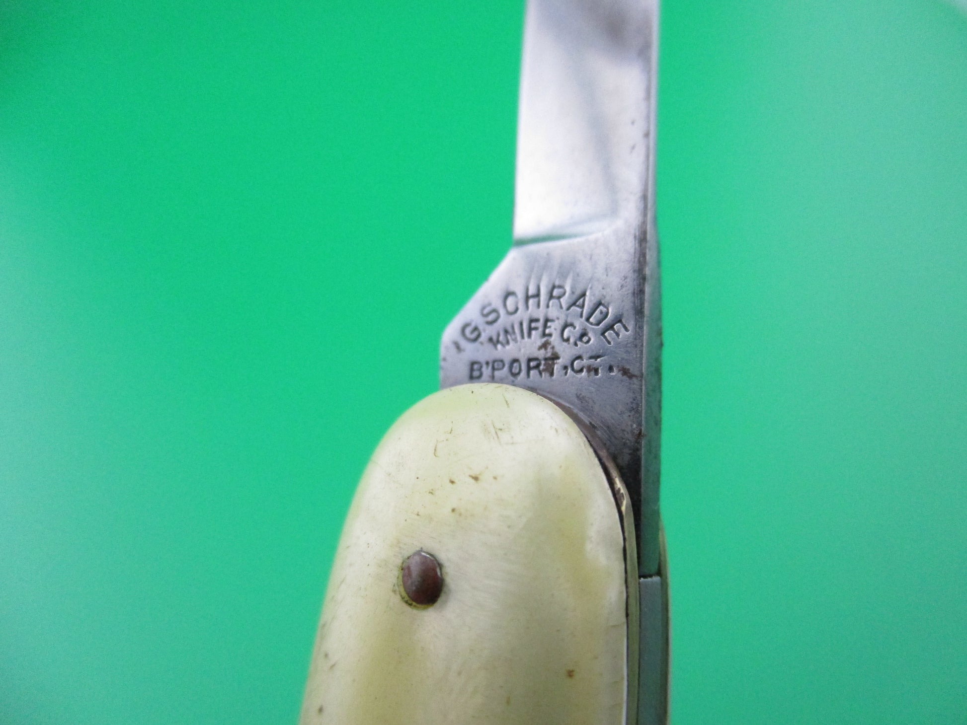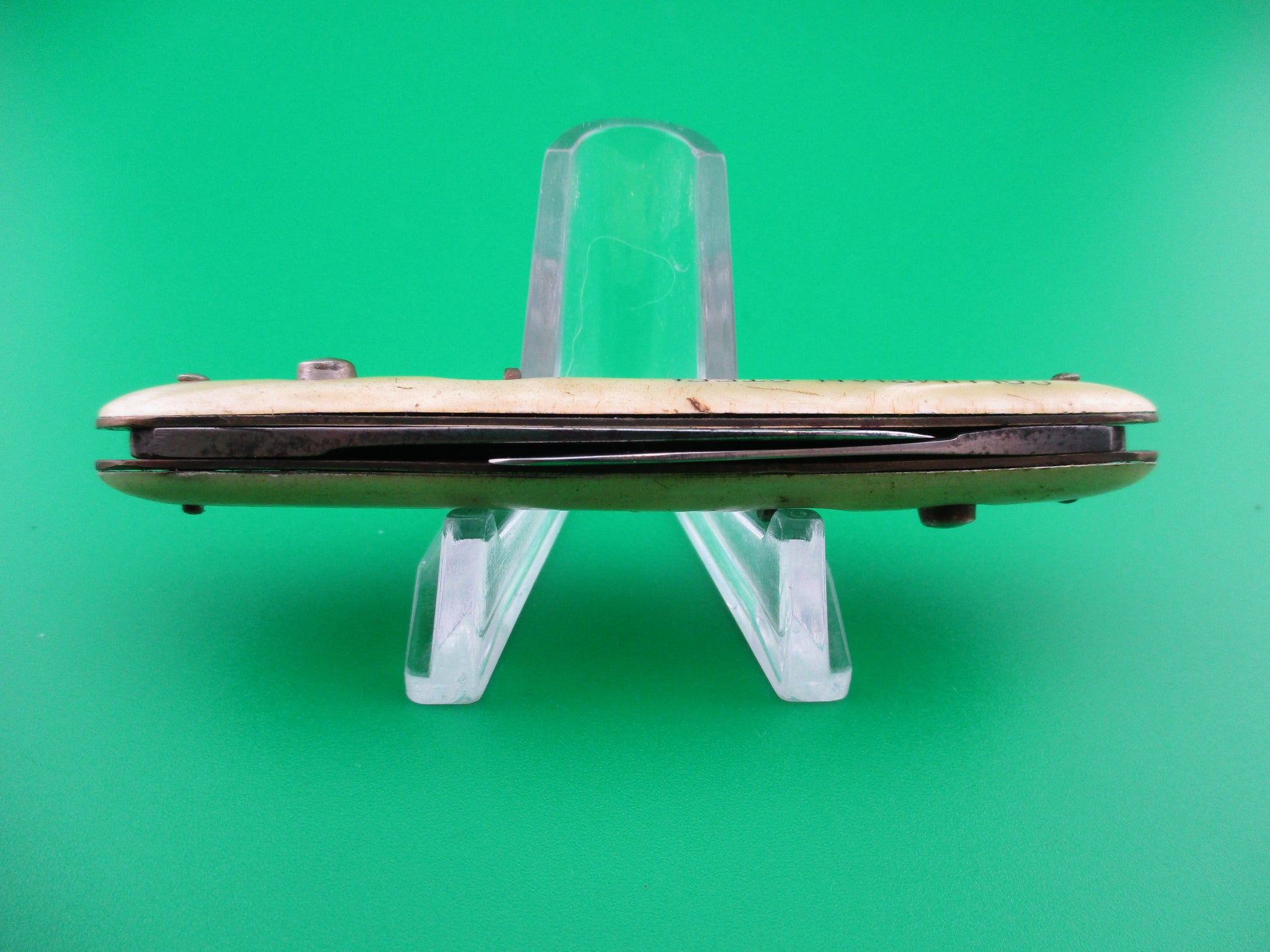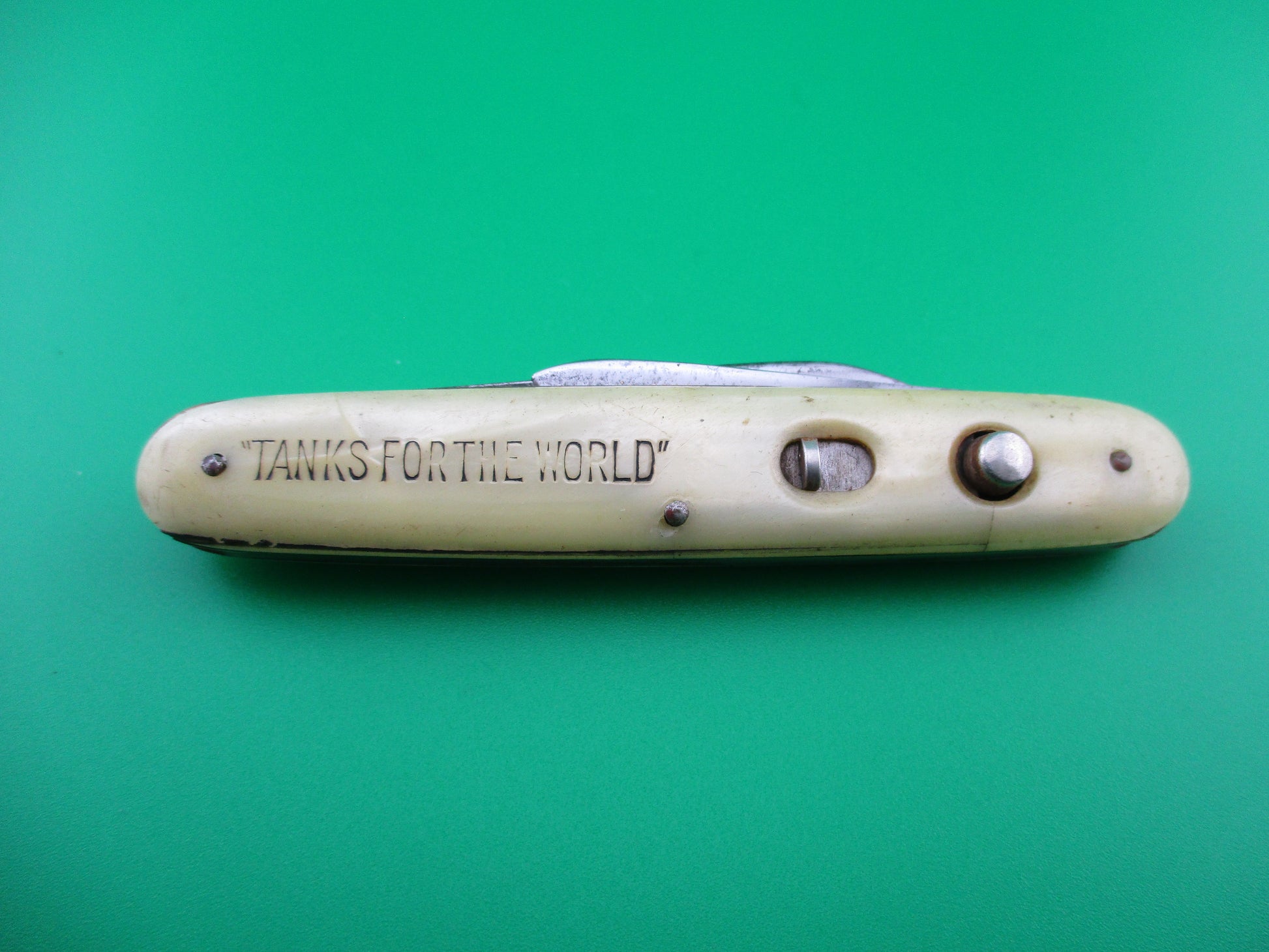 Nice old PRESTO double switchblade with marine pearl celluloid scales with advertising for the COLUMBIAN STEEL TANK Co. KANSAS CITY USA on the front and TANKS FOR THE WORLD on the back. Made by the George Schrade Knife Co of Bridgeport, CT in the 1940s or early 50s. It measures 3 3/8" closed and just over 7 inches with both blades open and has brass liners. The blades are mostly full and shiny with some light scratches and some light peppering with one pitted spot. Looks like they have been lightly cleaned. The scales are in good condition with one hairline crack by the button on the back side. The knife works well with the tip of the small blade peeking just a bit when closed. Both blades open fully and lock when the buttons are pressed. No kickback. Good lockup with just a little movement on each blade. Both safeties work. Nice old American double switchblade.