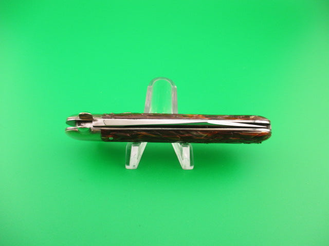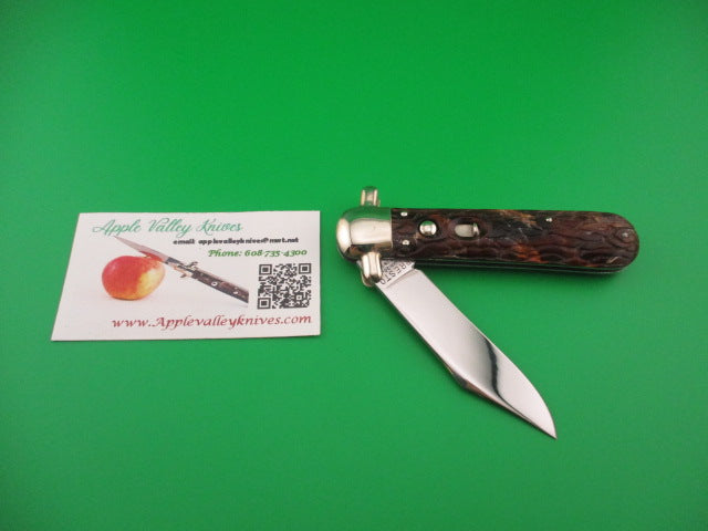 Presto Derby Scout switchblade with synthetic wormgroove brain scales made by the George Schrade Knife Co of Bridgeport, CT sometime between 1940 and 1956. It was designated the model 1500 which was the second largest size switchblade made by the company. This knife measures 4 1/8 inches closed and 7 1/8 inches open with steel liners and nickel silver bolsters, button and safety. The blade is 100% full and gorgeous with all of the original factory finish, a really beautiful blade. The tang is stamped PRESTO PAT JAN 30-40 MADE IN USA on the front and GEO SCHRADE KNIFE CO INC B'P'T, CONN on the reverse. The multi colored synthetic wormgroove scales are very attractive and the coloring is often referred to as "brain". This knife functions great with the blade tip seating deep, strong snap and excellent lockup open with less than 1/16" up and down. Does not rattle if shaken with blade open. This is a Super nice example of a harder-to-find PRESTO Derby guard scout. Safety works. EX++ condition.