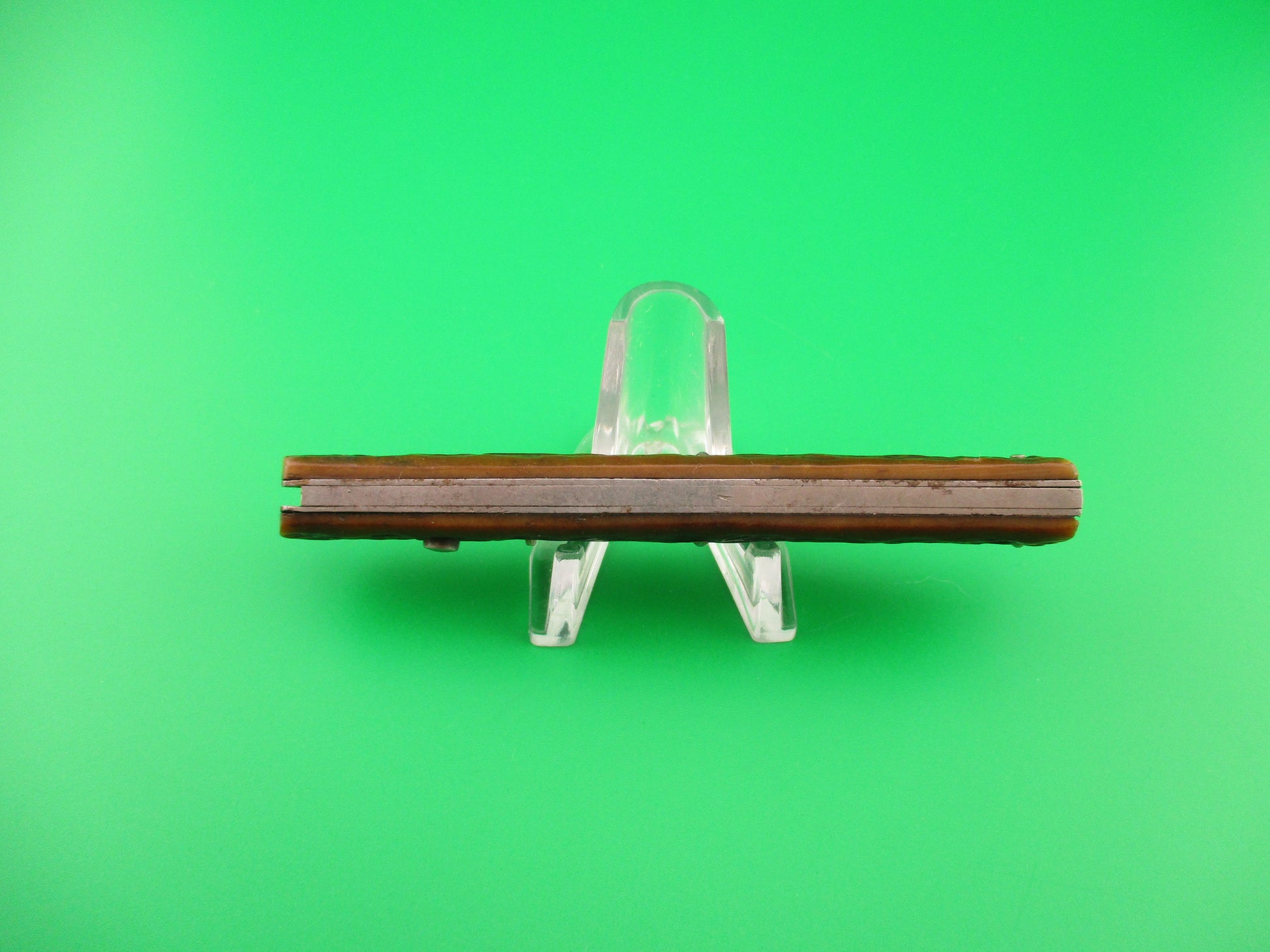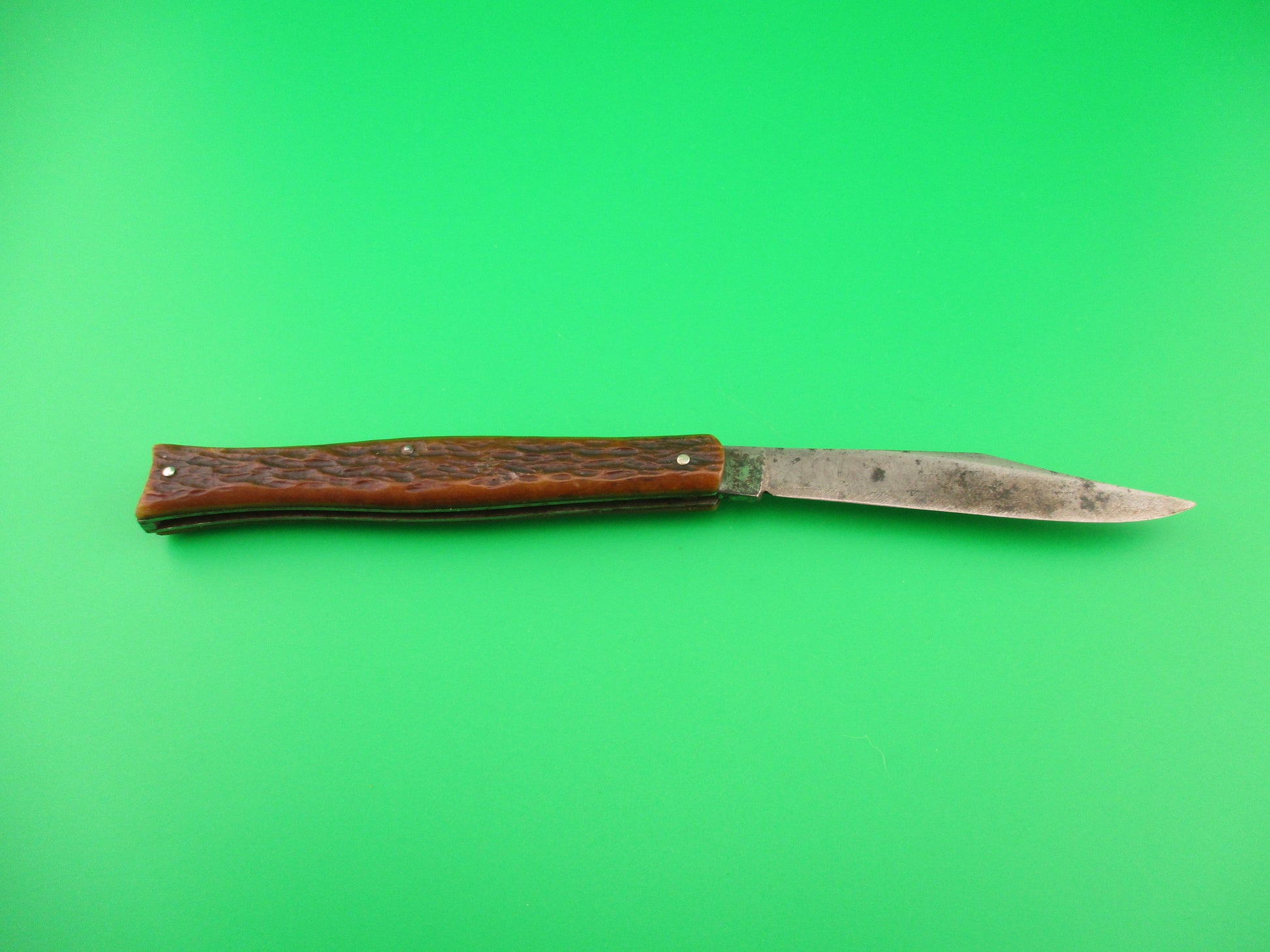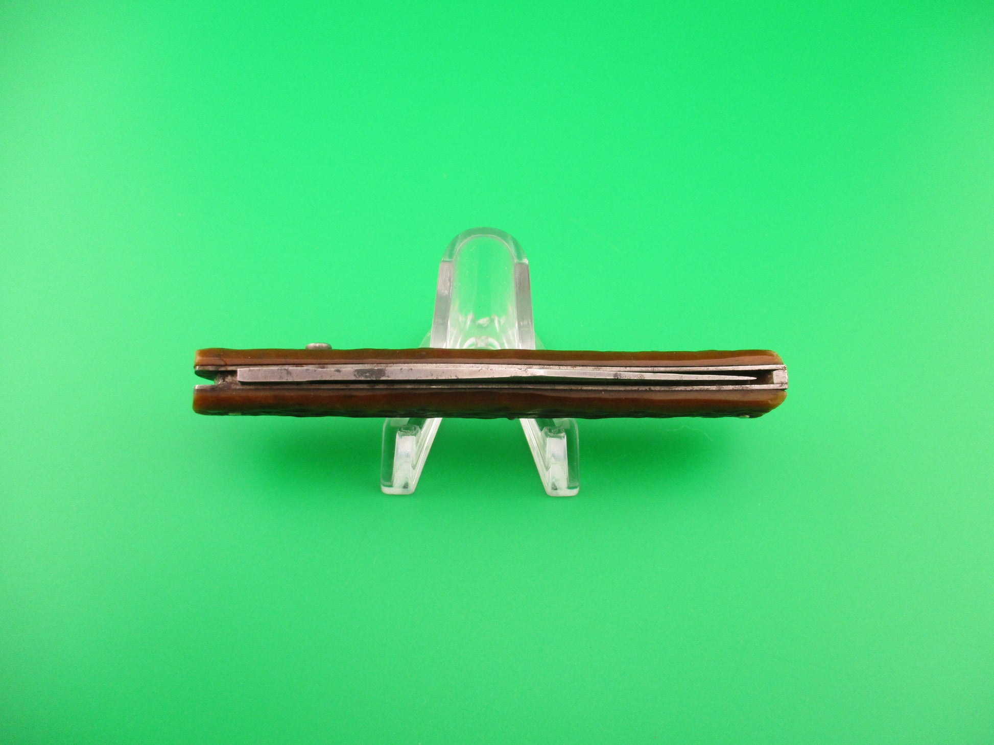 Vintage Presto fishtail switchblade made by the Geo Schrade Knife Co of Bridgeport, CT sometime between 1929 and 1940 designated the model #6000S. It measures 4 inches closed and 7 3/16 inches open with steel liners & button with nickel silver safety. The clip blade is 99% full or better with heavy patina with some scratches, spotting & pitting and the tang is stamped PRESTO PAT PEND-G on the front and G SCHRADE in an arch over B'PORT, CT on the rear tang which means it was an earlier knife made before 1940. The jigged bone scales (handles) are in excellent condition. The blade tip is even with the liners closed, good snap and does not lock open. Rattles if shaken with blade open. Safety works. G+ condition.