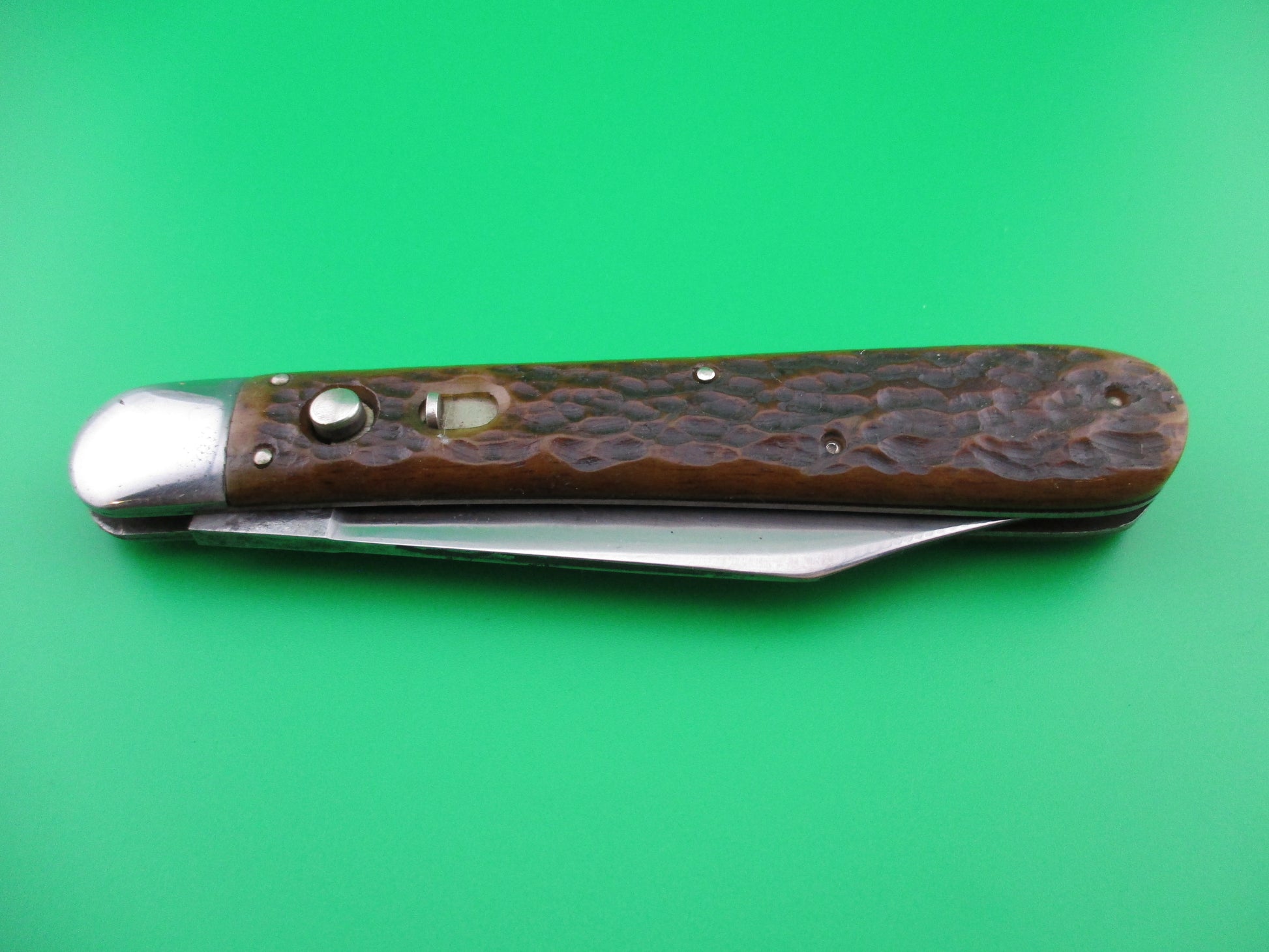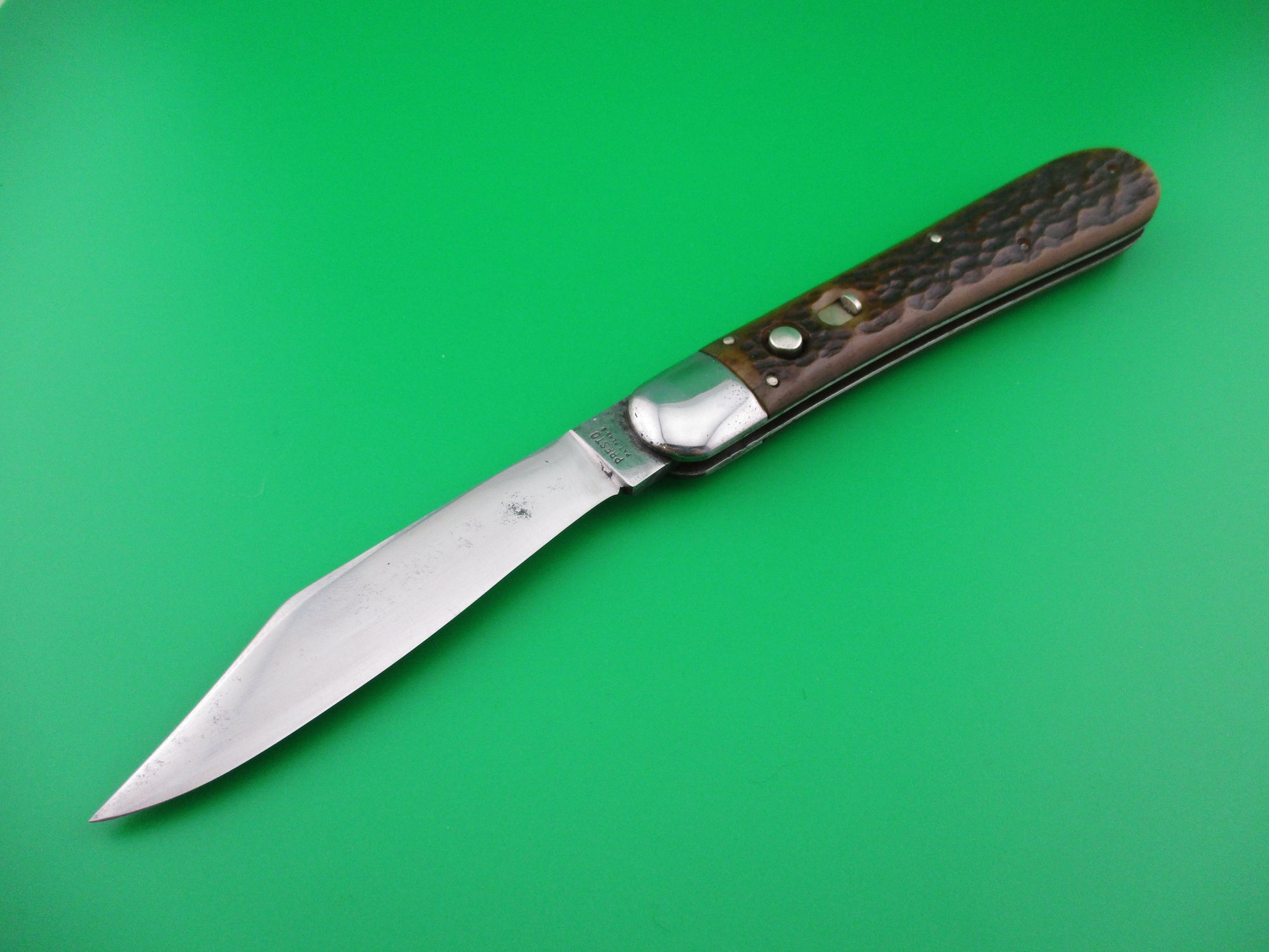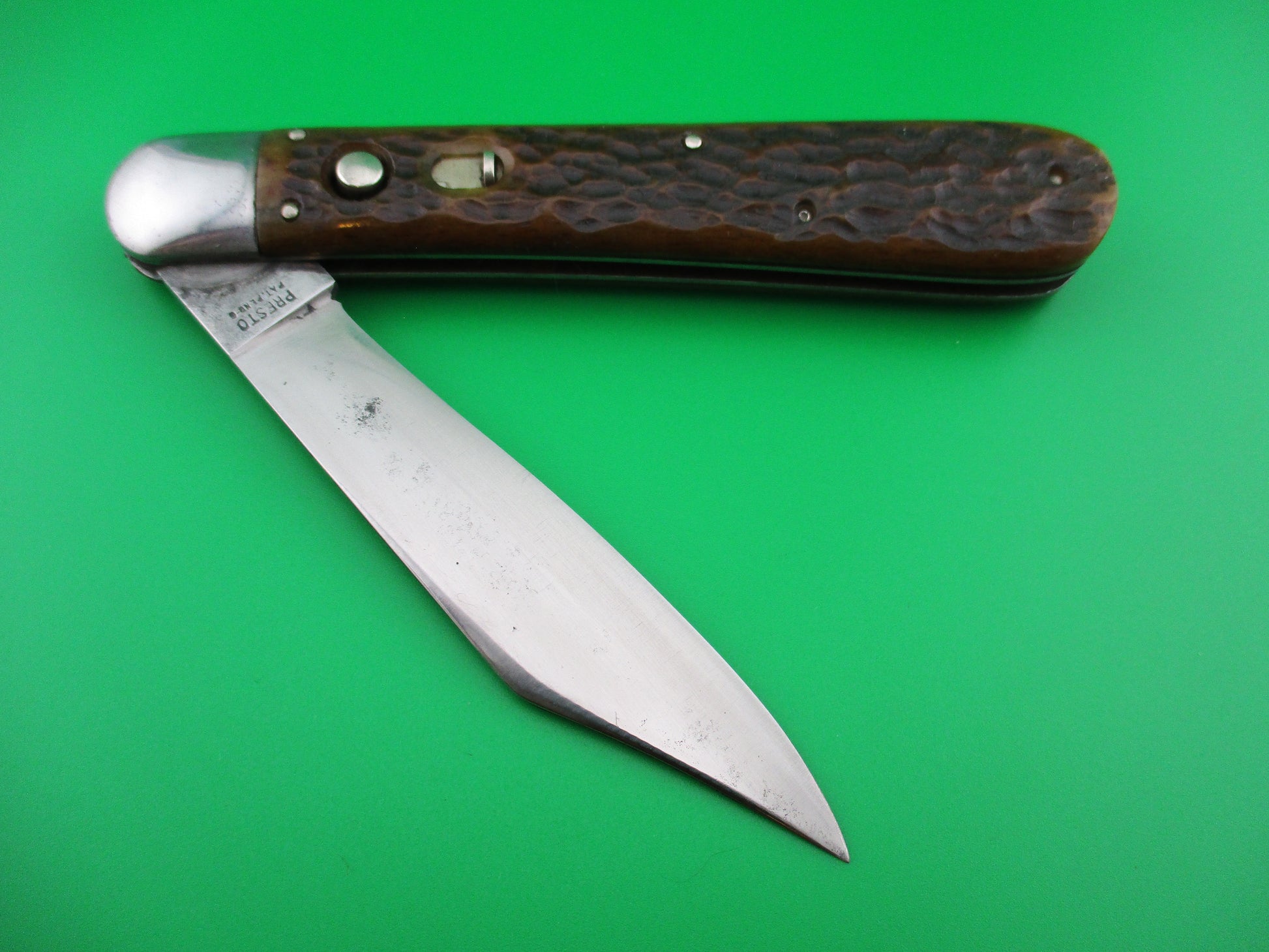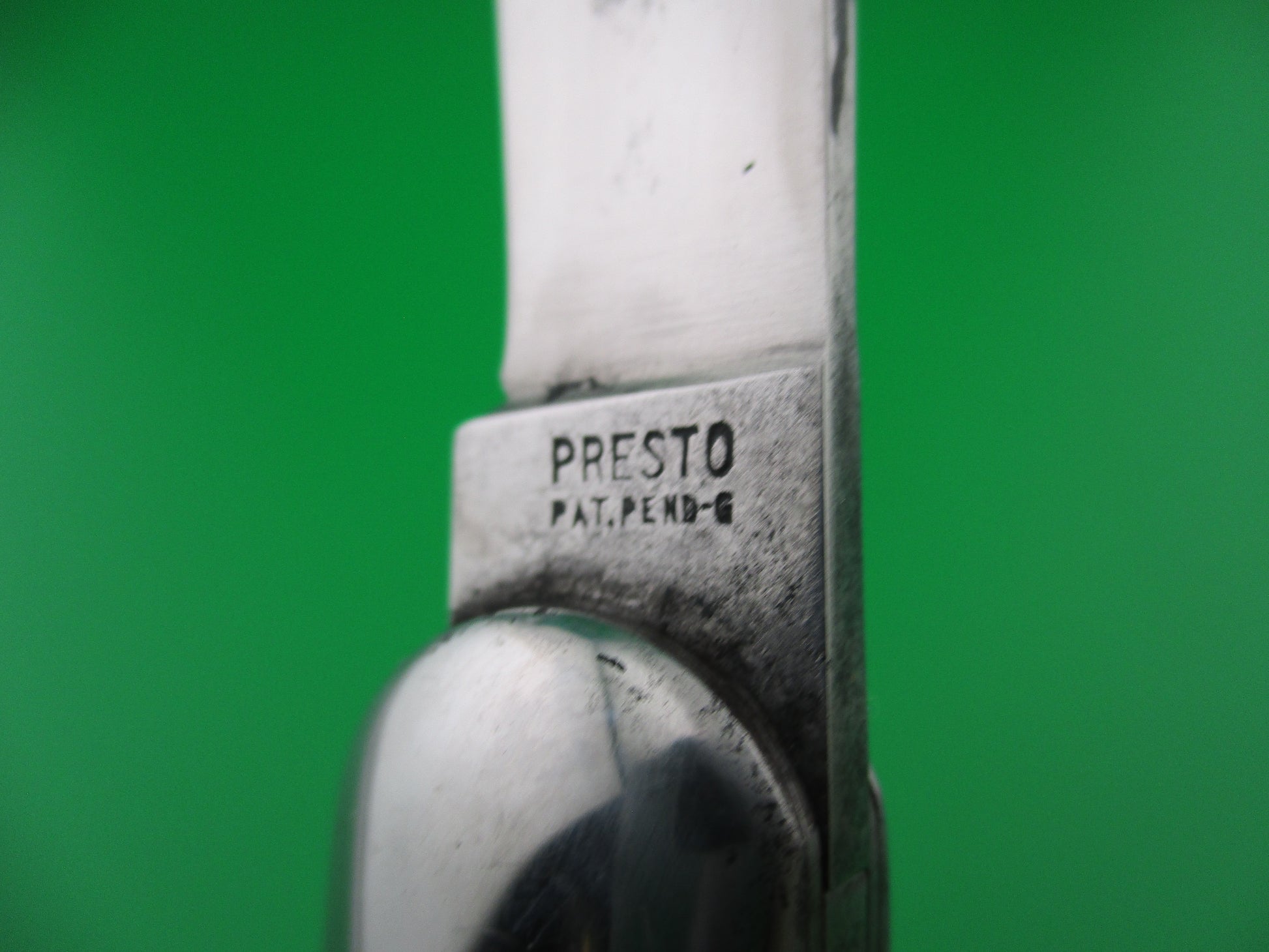 Presto Hunter switchblade with jigged bone scales. Made by the George Schrade Knife Co of Bridgeport, CT sometime between 1930 and 1940. This is one of the earliest hunters with the less common Small PRESTO stamp. This knife measures 5 inches closed and 8.75 inches open with steel liners and bolsters. It was designated the model 3000 and was the largest switchblade made by the company. This one is in excellent condition with a nearly full blade with no major flaws. The blade is approximately 96% full and has some light spotting. This knife functions great with the blade tip seating deep, strong snap and locking up nicely with just a little up and down at the tip. This is a really nice example of a harder-to-find vintage Presto Small stamp hunter.