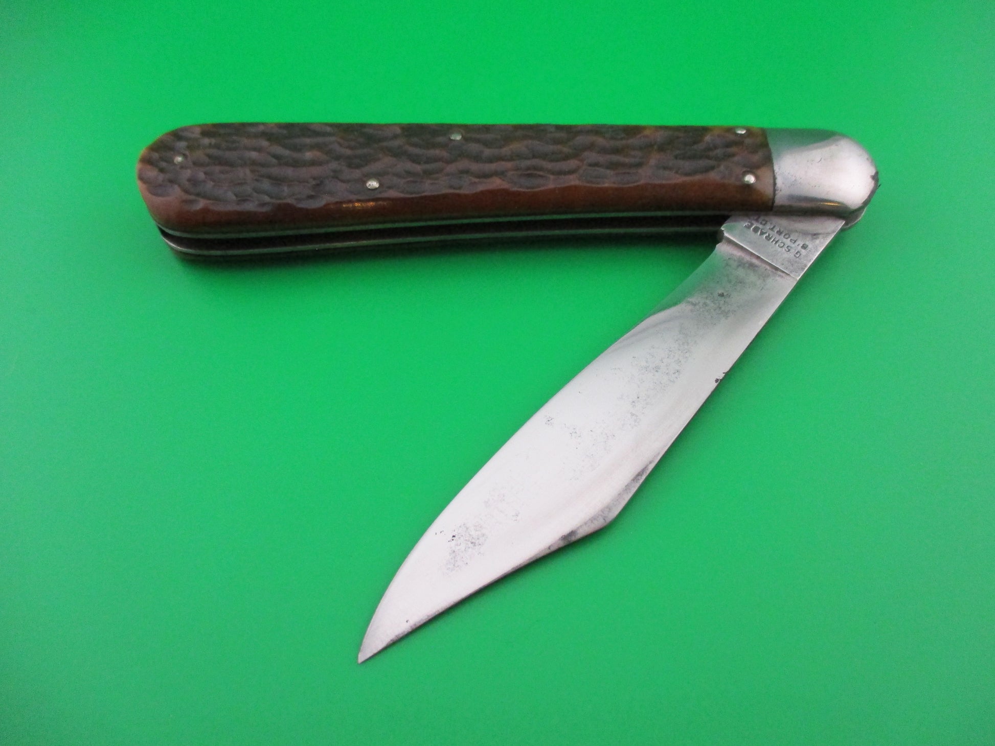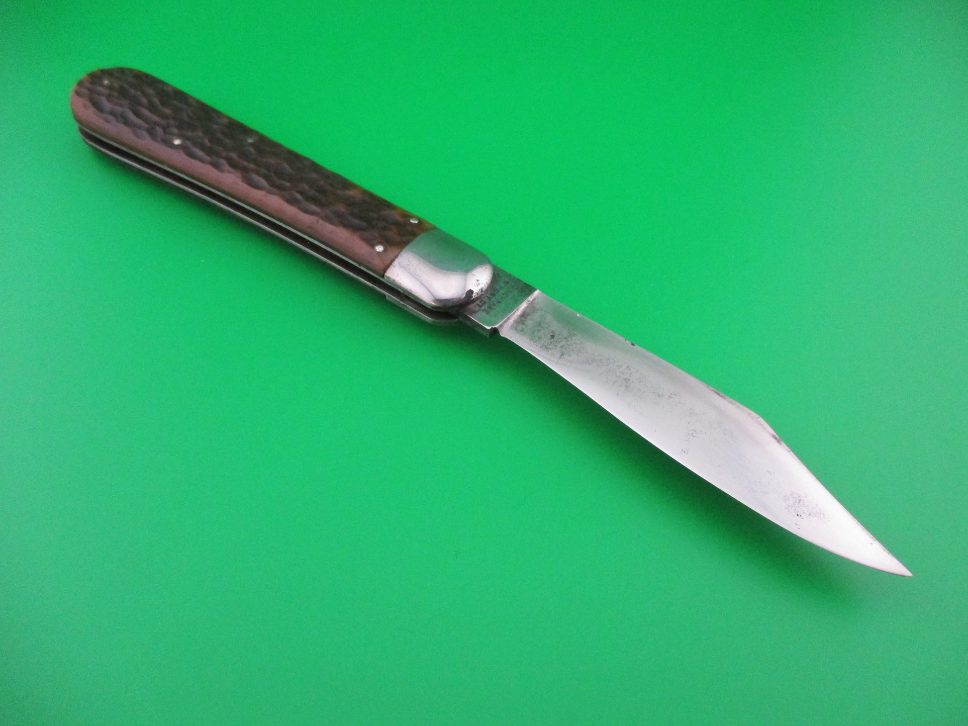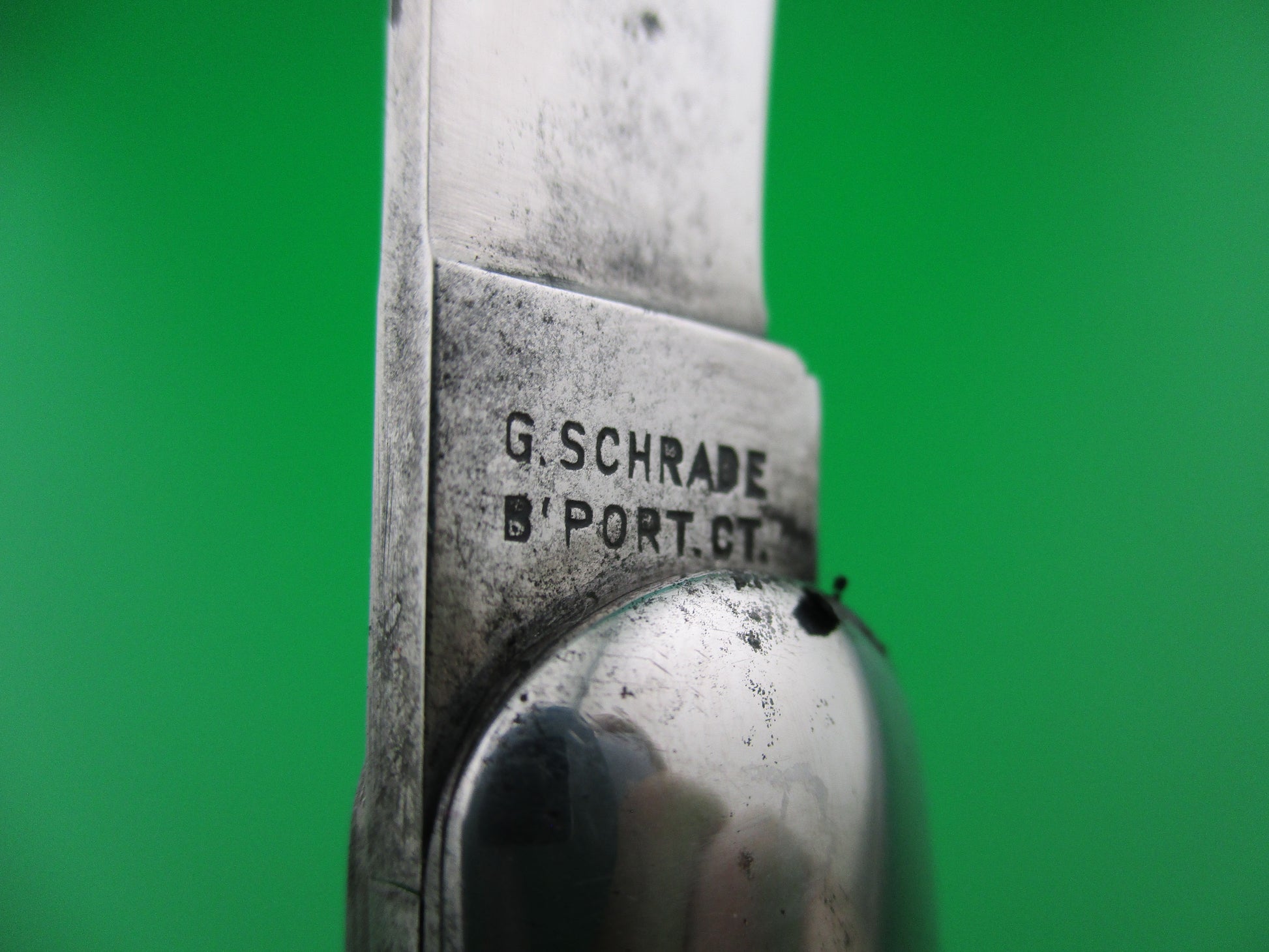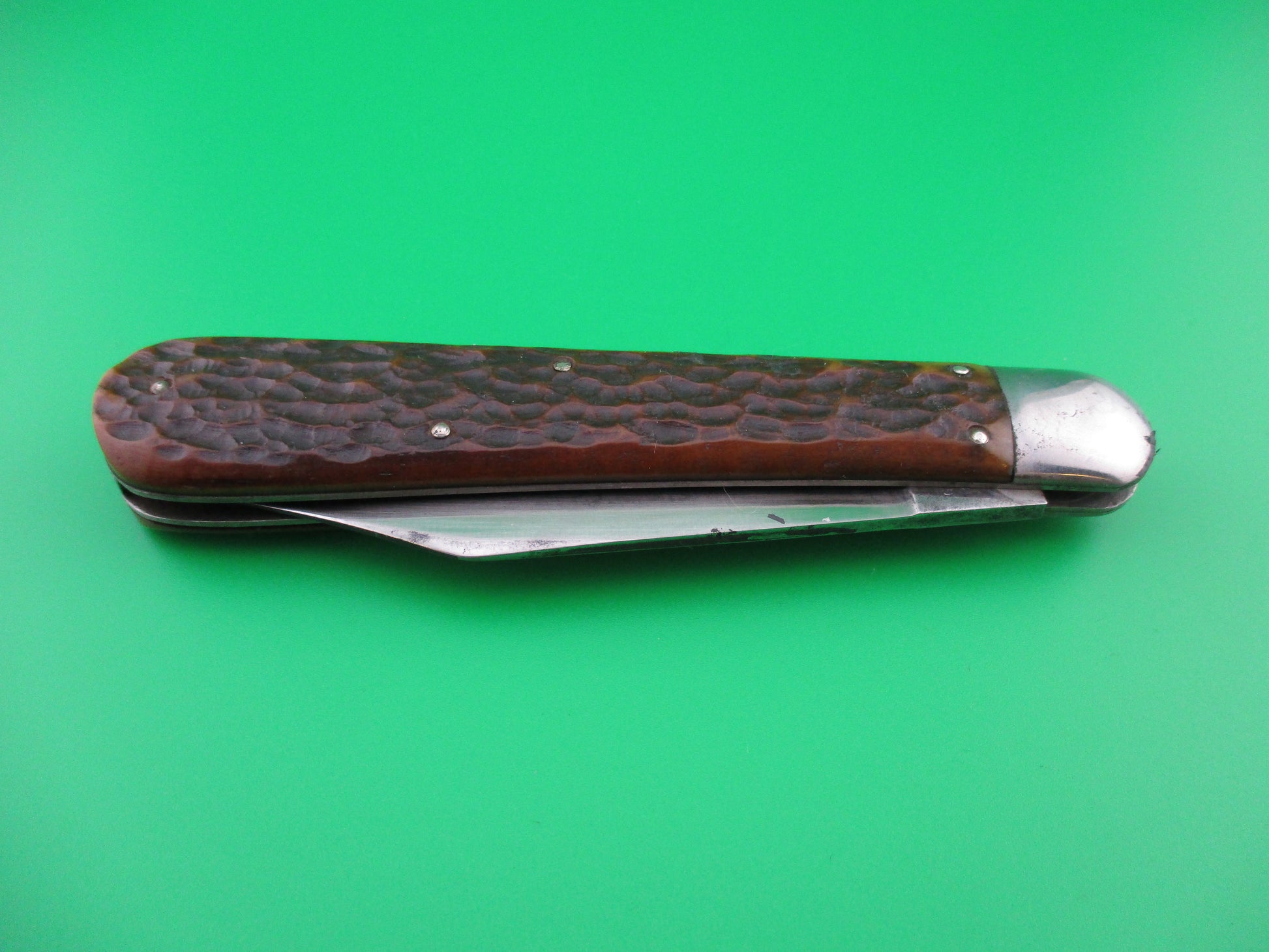 Presto Hunter switchblade with jigged bone scales. Made by the George Schrade Knife Co of Bridgeport, CT sometime between 1930 and 1940. This is one of the earliest hunters with the less common Small PRESTO stamp. This knife measures 5 inches closed and 8.75 inches open with steel liners and bolsters. It was designated the model 3000 and was the largest switchblade made by the company. This one is in excellent condition with a nearly full blade with no major flaws. The blade is approximately 96% full and has some light spotting. This knife functions great with the blade tip seating deep, strong snap and locking up nicely with just a little up and down at the tip. This is a really nice example of a harder-to-find vintage Presto Small stamp hunter.