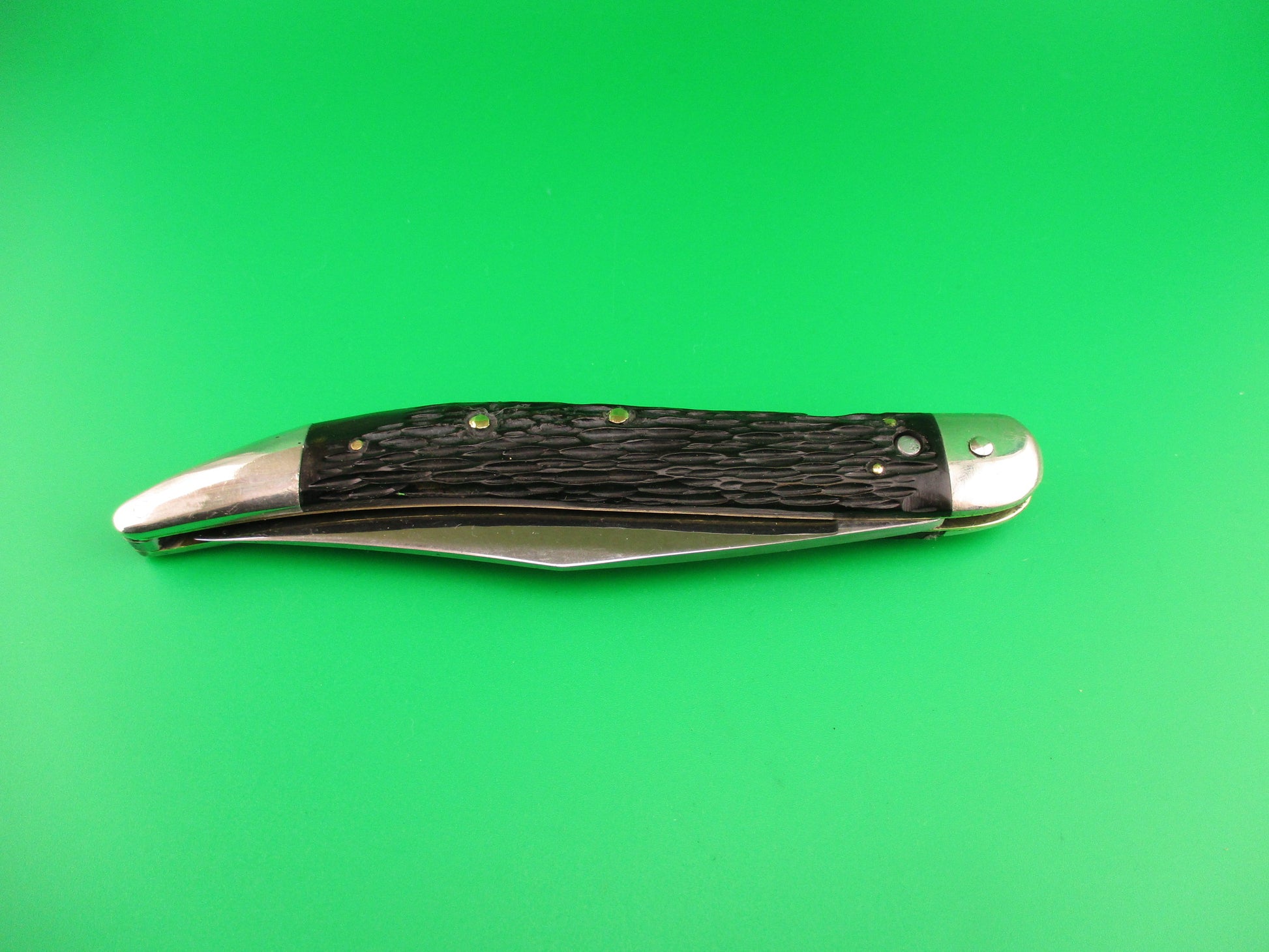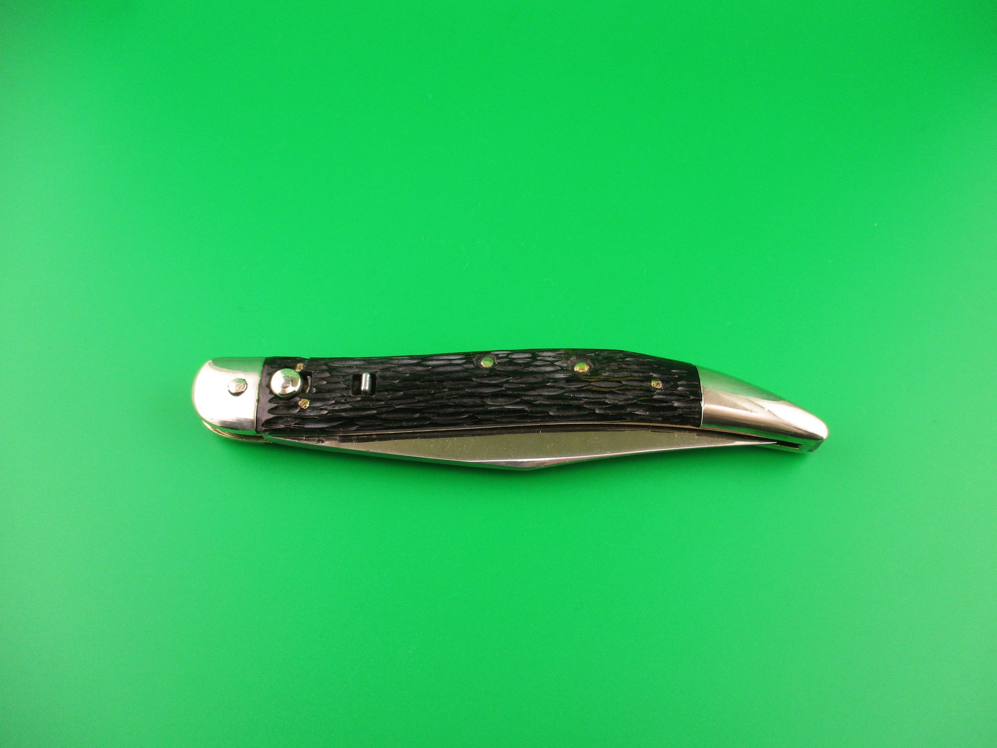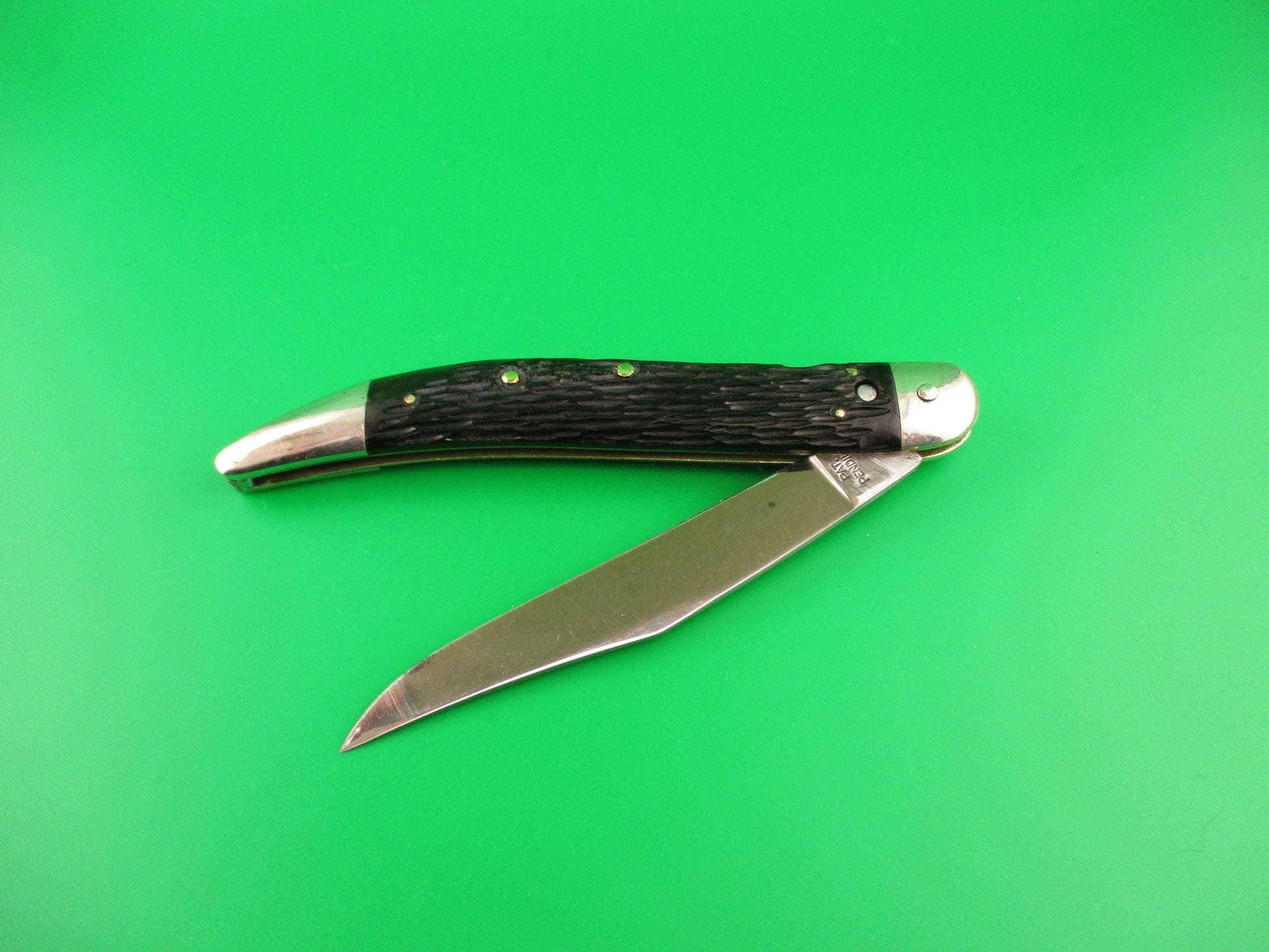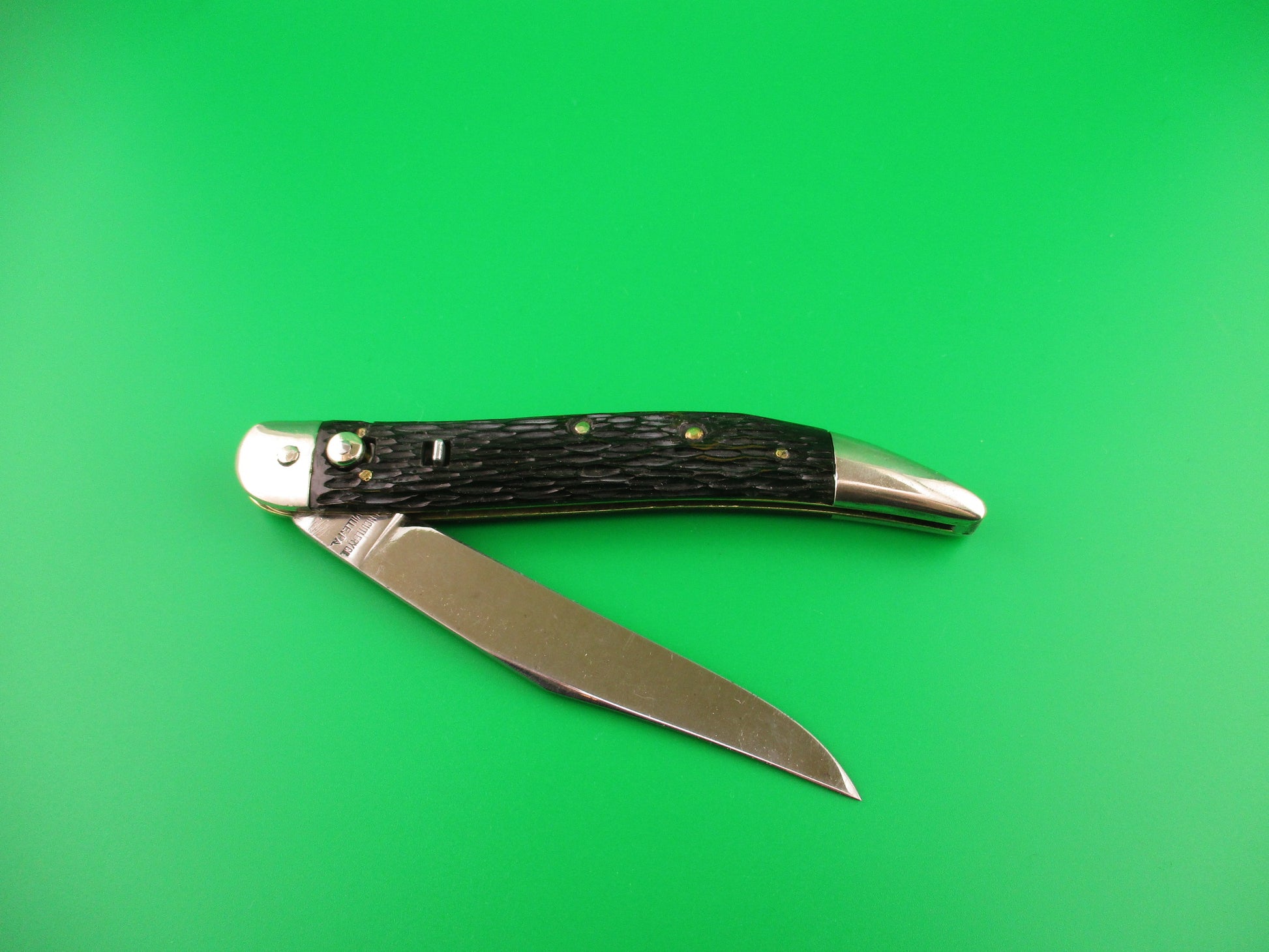 Vintage Queen Cutlery Co Titusville, PA Jet 25 Toothpick Black w/safety switchblade knife. This is a Rarer early version with a different tang stamp than most which just have a Q with a crown on the tang. Knife measures 5 inches closed and 8 7/8 inches open with brass liners and nickel silver bolsters & button with aluminum safety. The long clip blade is 100% full with original finish and the tang is stamped Queen Cutlery Co Titusville, PA and PAT PENDING on the back side. Black jigged scales are in great condition except for one bad scuff that also left marks on the liner next to it as you can see in the pics. The knife works as it should with blade tip below the liners closed, good snap and stays open as it's supposed to via pressure from the back spring. (no locking mechanism by design) Safety works. EX+ condition.