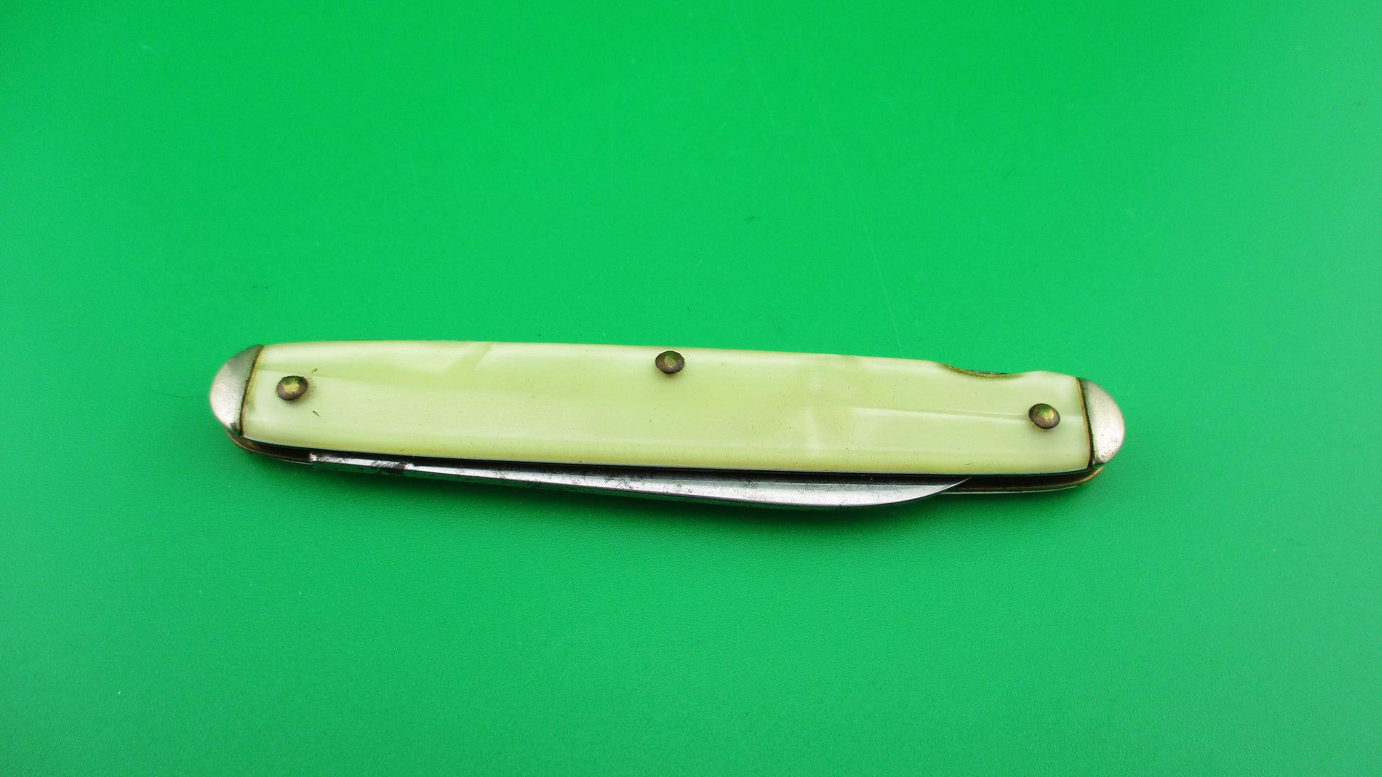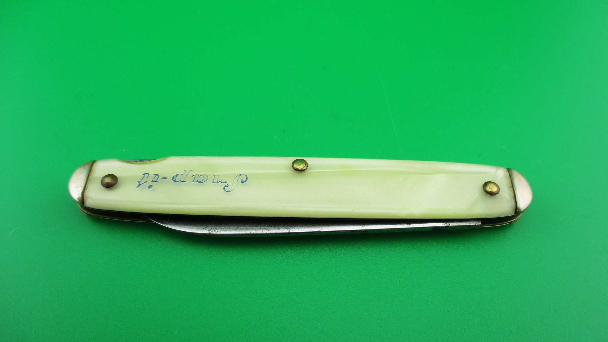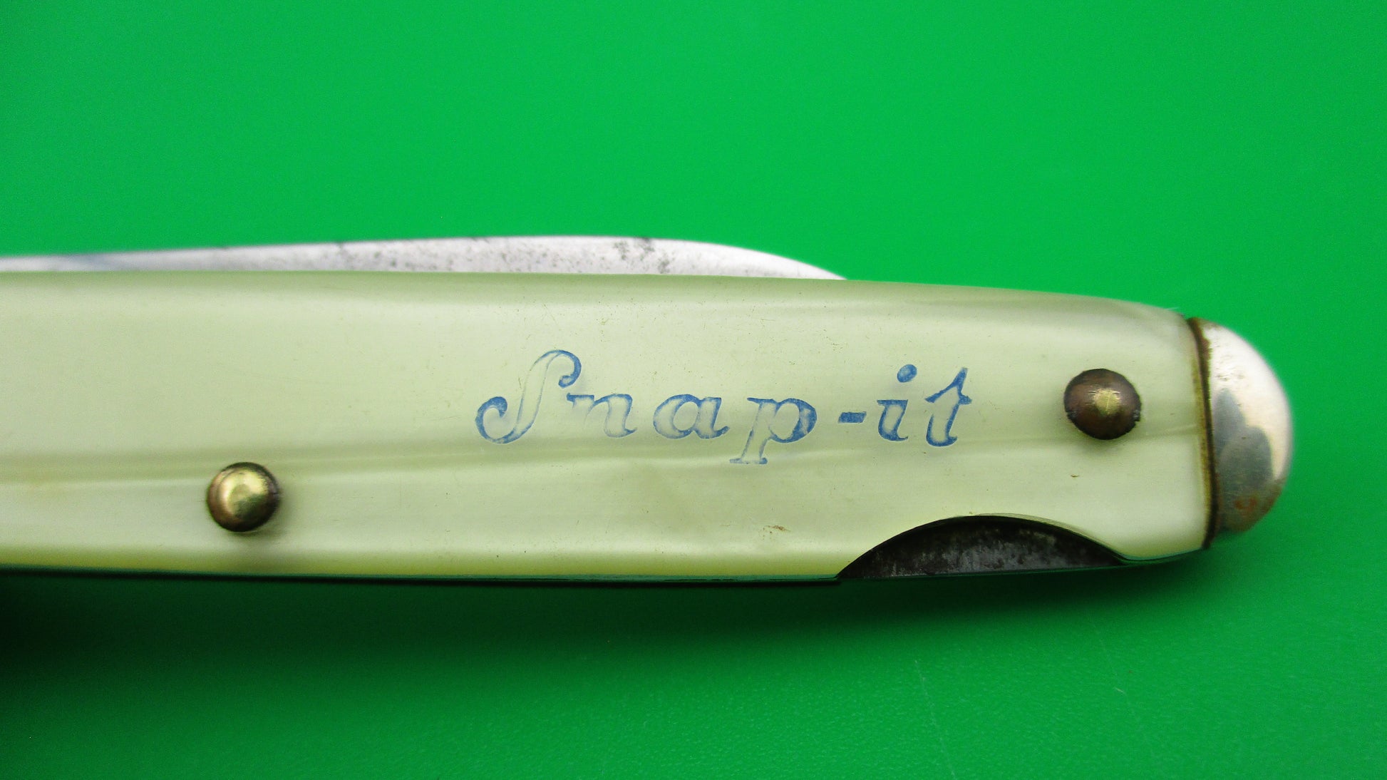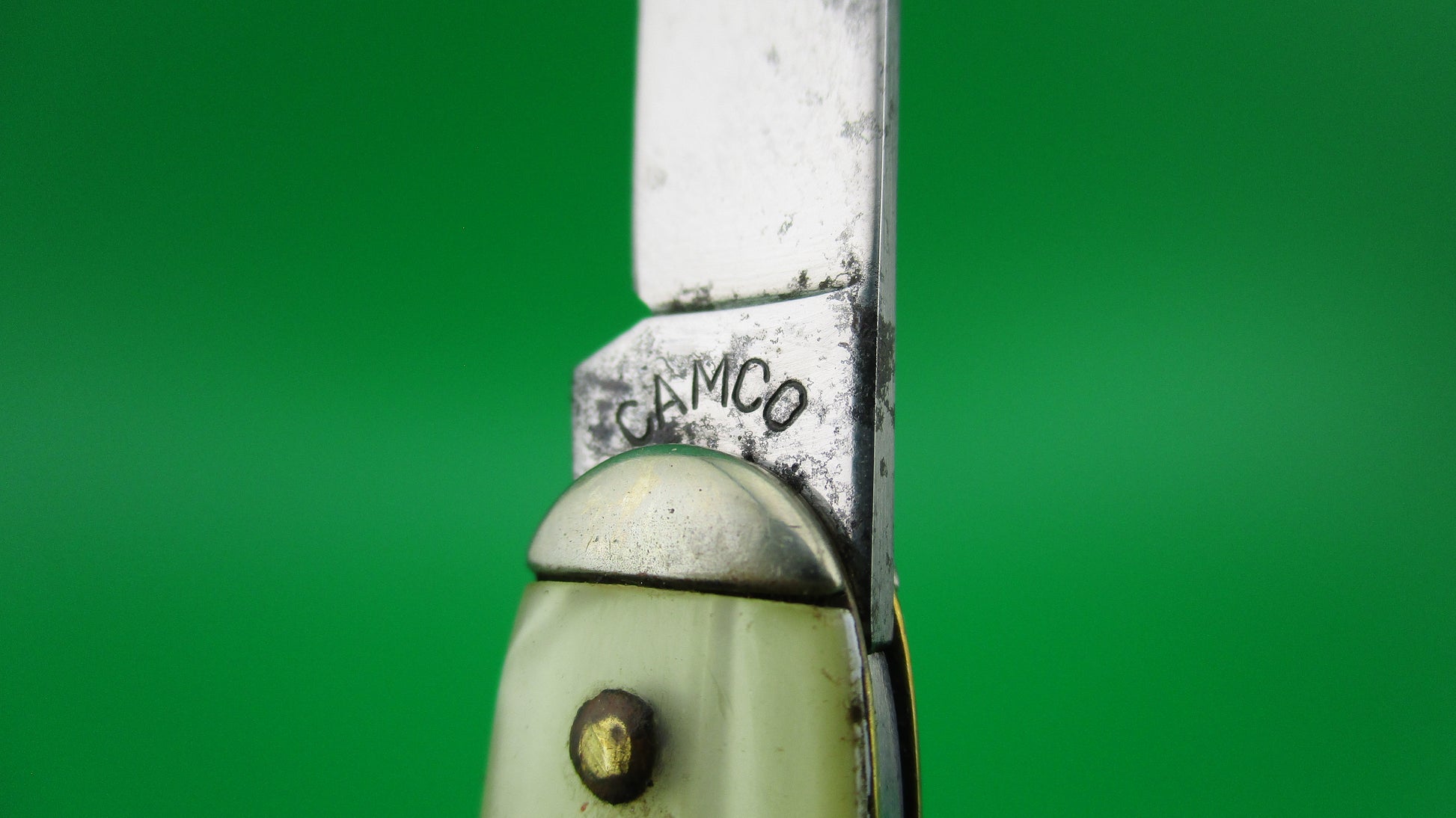 Rare CAMCO Snap-it Vintage Camillus Backspring release automatic knife from 1940s. This is one of two production switchblade knives made by Camillus Cutlery Co of Camillus, NY with the other being the MC1 orange military issue paratrooper knife which they made about 20 years later. This knife was designated the "Flylock 80" and was designed to compete with George Schrade's low cost pull ball advertising knives. Both companies wanted to provide cheap advertising switchblades for their customers and both examples have no button or safety which leaves both sides of the knives open for advertising. These knives were also trademarked "Snap-it", which is printed on the back scale of this knife. It measures 3 1/8" closed and 5 1/4" open with brass liners and nickel silver tip bolsters. The flat grind spear blade is 99% full with much of the original factory finish with light scratches and some peppering and the tang is stamped CAMCO USA. The synthetic imitation pearl scales are very attractive with Snap-it in blue printed on the back scale and are in excellent condition. To open the knife you press on the exposed backspring in the "half moon" cutout near the bottom/back of the knife. It takes two hands to open. To close you press the same release to unlock the blade to be pushed closed. The knife works well with blade tip seating deep in the well closed, opens fully and locks up well. Does not rattle if shaken with the blade open. These are pretty hard to find knives. EX condition.