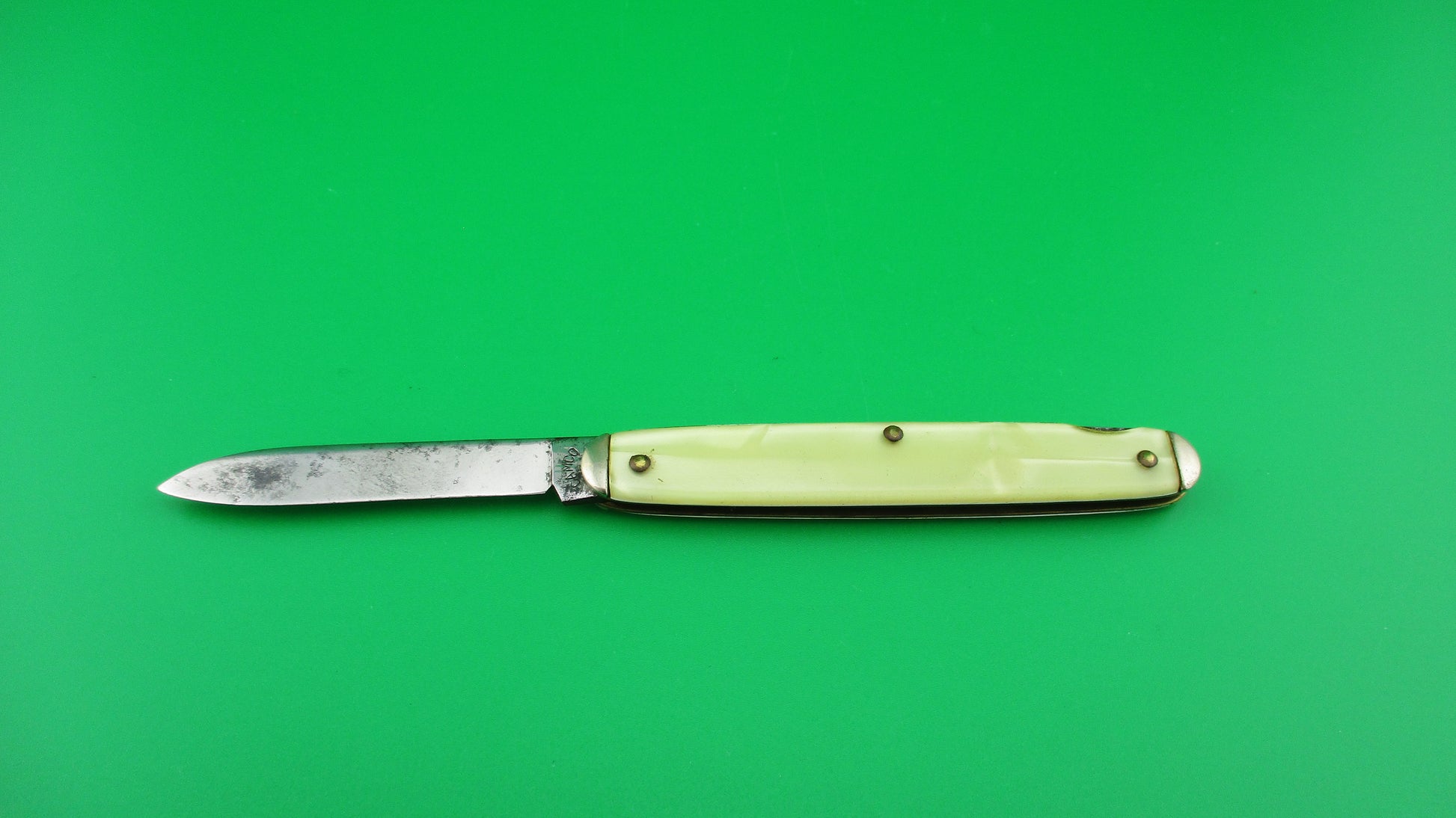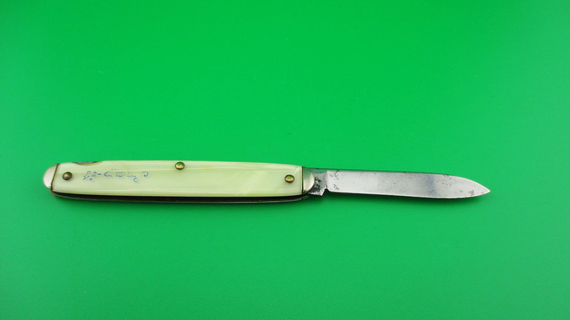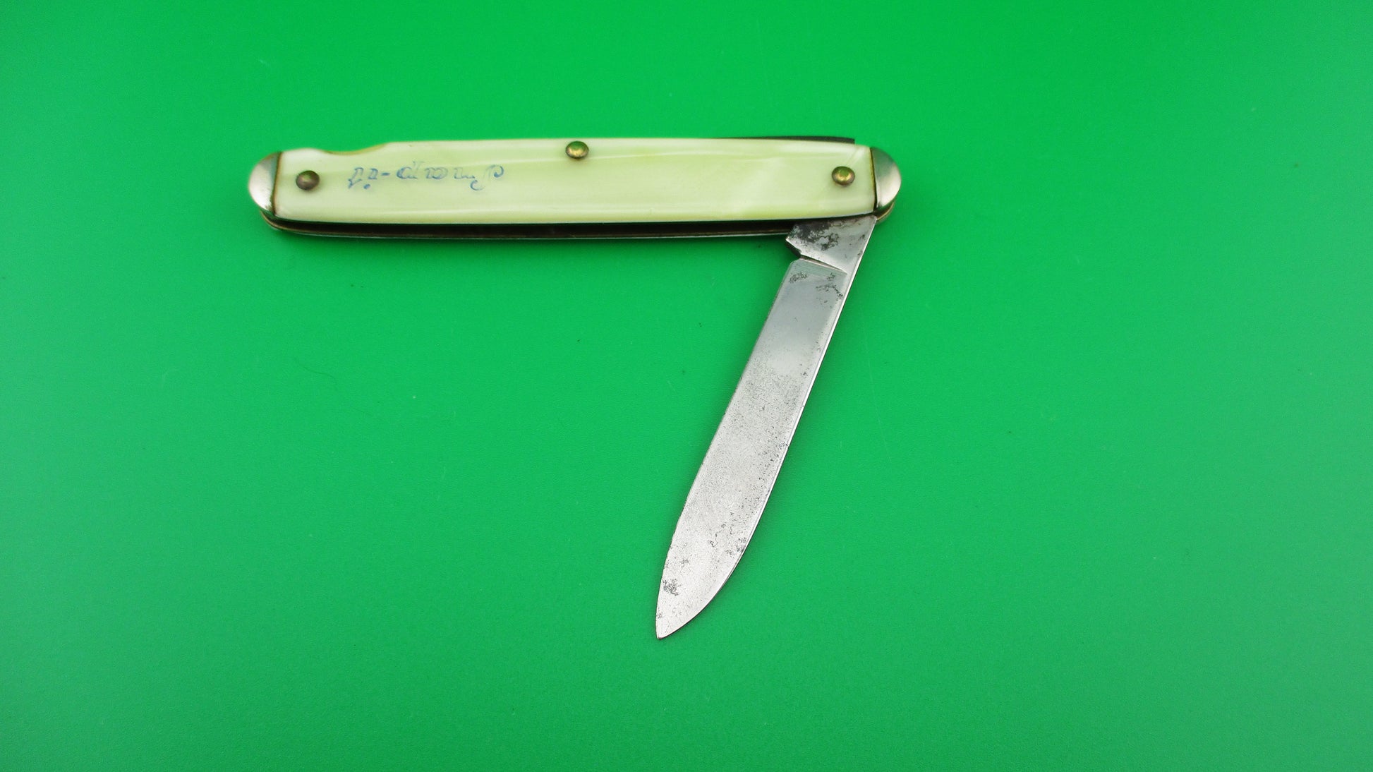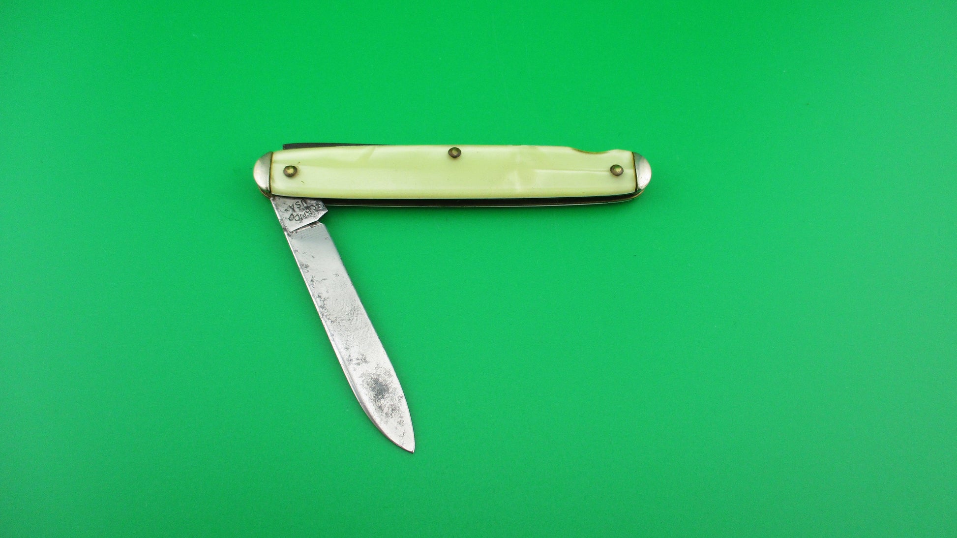 Rare CAMCO Snap-it Vintage Camillus Backspring release automatic knife from 1940s. This is one of two production switchblade knives made by Camillus Cutlery Co of Camillus, NY with the other being the MC1 orange military issue paratrooper knife which they made about 20 years later. This knife was designated the "Flylock 80" and was designed to compete with George Schrade's low cost pull ball advertising knives. Both companies wanted to provide cheap advertising switchblades for their customers and both examples have no button or safety which leaves both sides of the knives open for advertising. These knives were also trademarked "Snap-it", which is printed on the back scale of this knife. It measures 3 1/8" closed and 5 1/4" open with brass liners and nickel silver tip bolsters. The flat grind spear blade is 99% full with much of the original factory finish with light scratches and some peppering and the tang is stamped CAMCO USA. The synthetic imitation pearl scales are very attractive with Snap-it in blue printed on the back scale and are in excellent condition. To open the knife you press on the exposed backspring in the "half moon" cutout near the bottom/back of the knife. It takes two hands to open. To close you press the same release to unlock the blade to be pushed closed. The knife works well with blade tip seating deep in the well closed, opens fully and locks up well. Does not rattle if shaken with the blade open. These are pretty hard to find knives. EX condition.