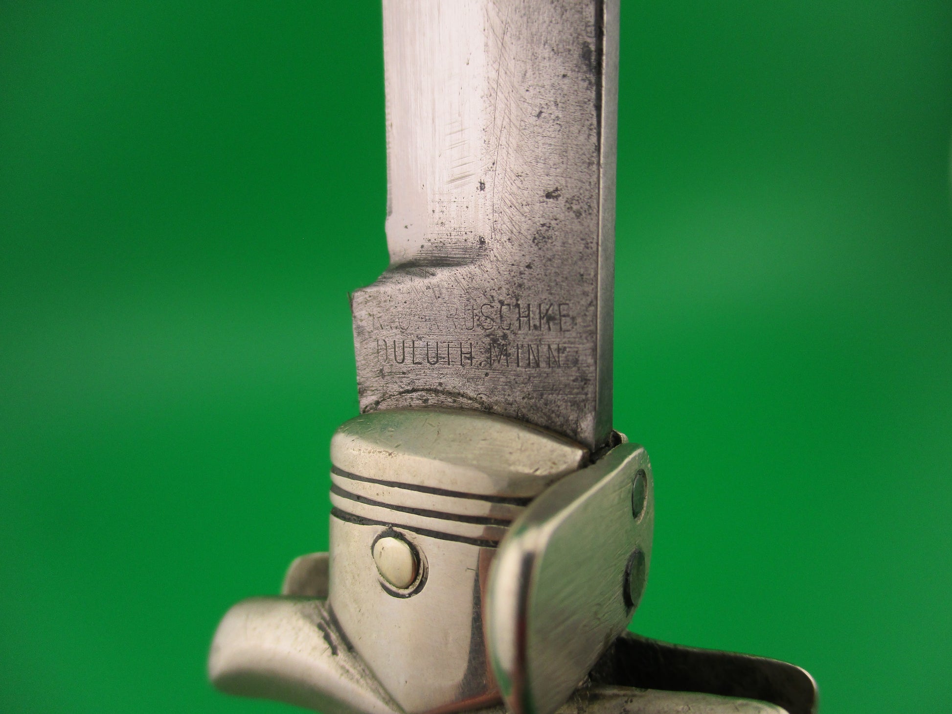 RC KRUSCHKE DULUTH MINN 23cm German Lift Tab Stag Antique automatic knife made in Germany around 1900 by Robert Klaas Co. The knife measures 23.2cm (9 1/8 inches) open and 5 1/8 inches closed including the lanyard hole at the back (bottom) of the knife. The knife has brass liners and nickel silver bolsters and lift tab. The saber grind clip blade is 94% full, or better with light scratches, spotting and a little pitting and tang is stamped RC KRUSCHKE DULUTH MINN. It was likely originally etched The NORTHWESTERN on the face of the blade. The genuine stag handles (scales) are in excellent condition with no cracks. To open you lift the tab above the finger guards with your thumb and same to close. The knife works well with blade tip deep & centered closed, opens fully, but spring is a little weak and locks open with about 1/8" movement each way at the tip. Rattles if shaken with blade open as most of these 100+ year old tab release knives do. VG+ condition.