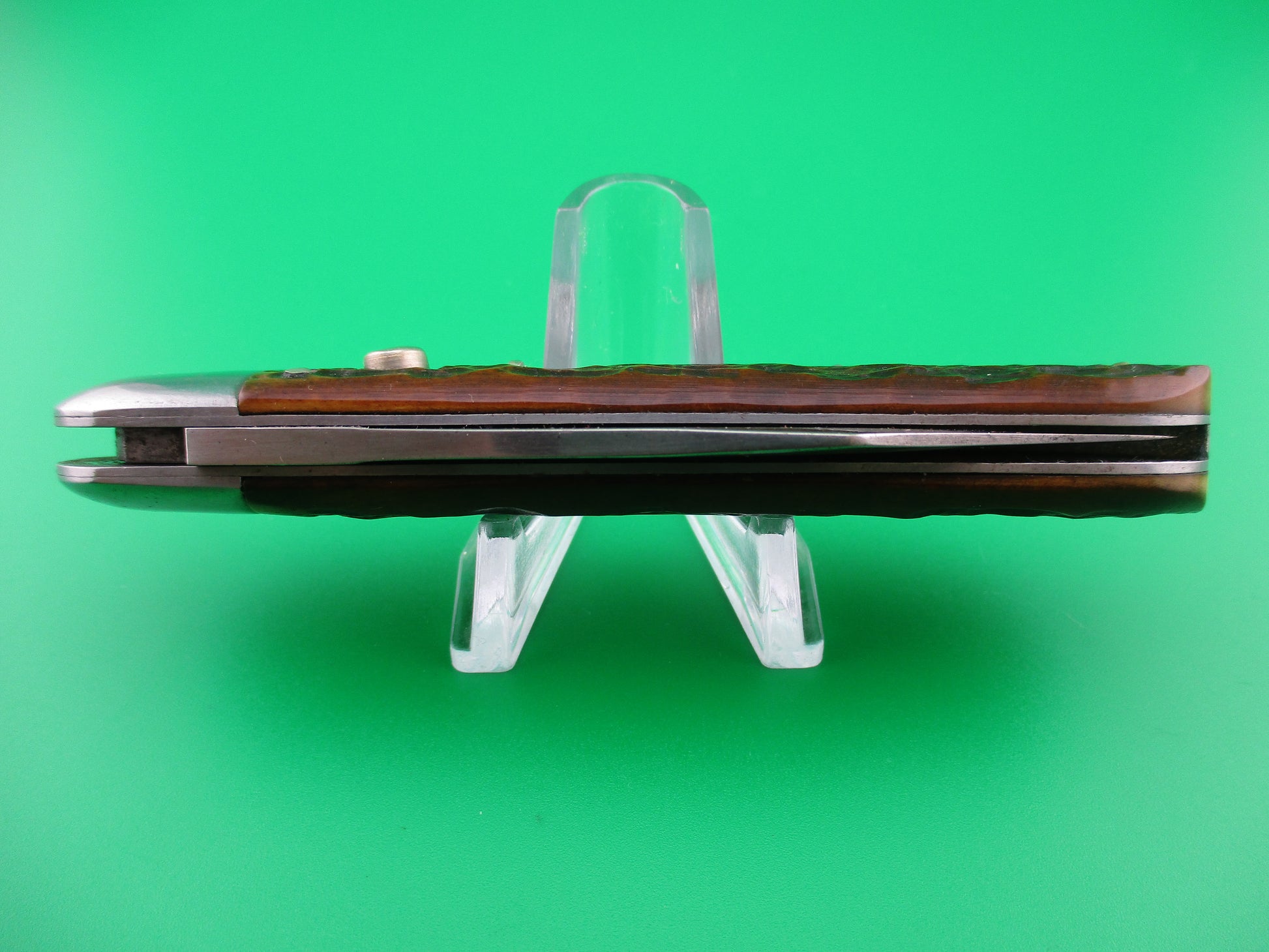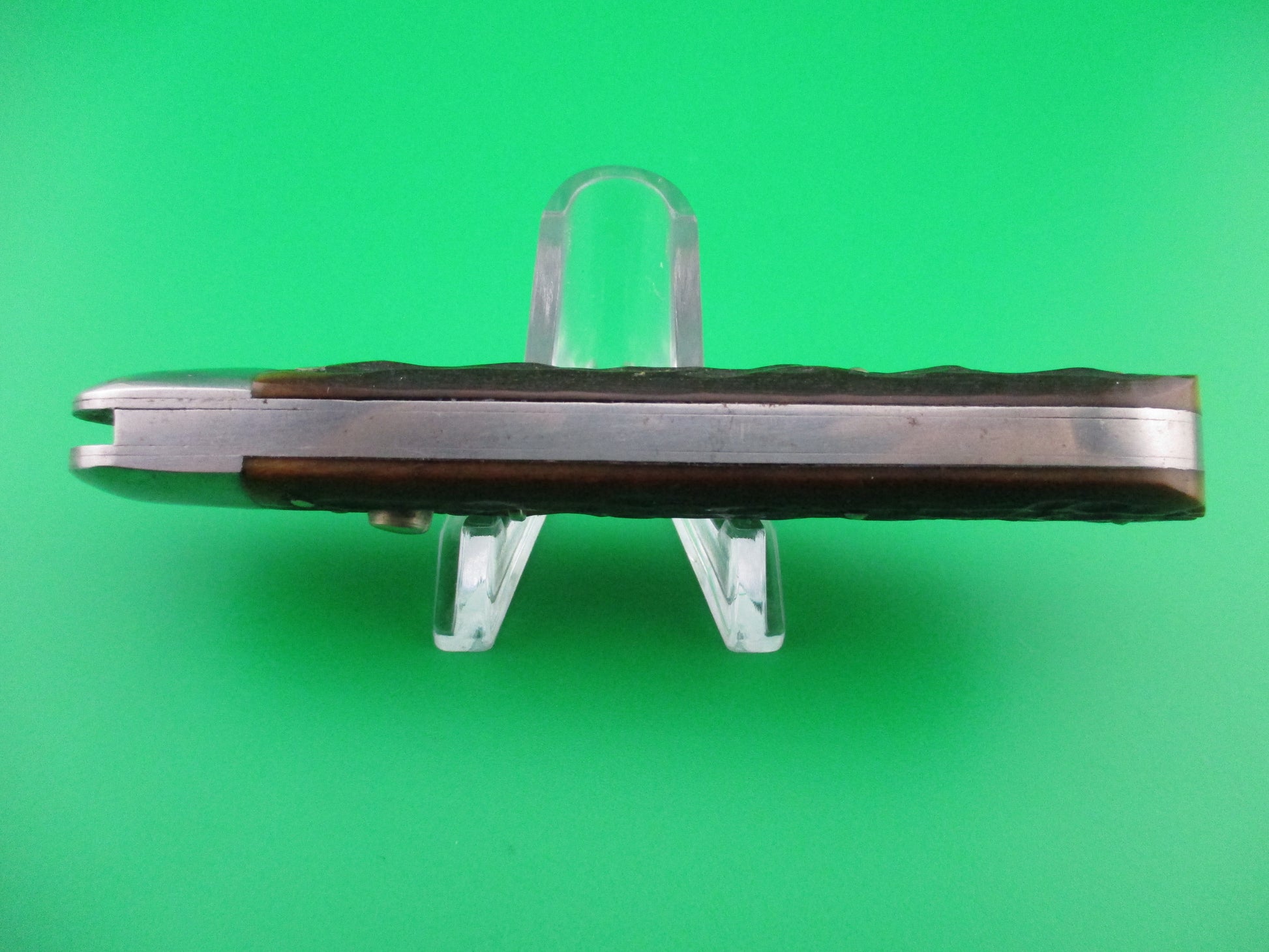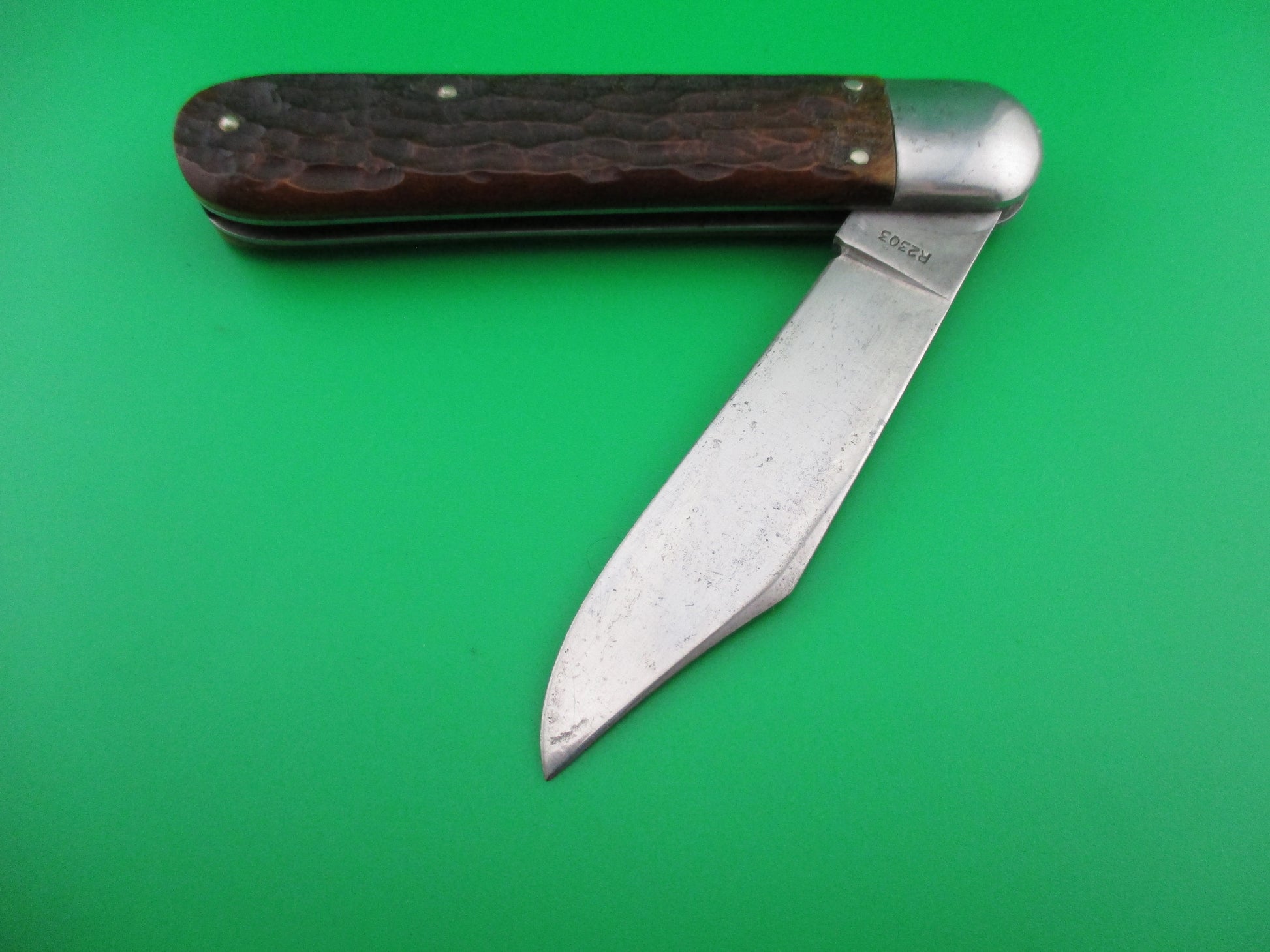Vintage Remington R2303 switchblade knife. This knife was made under contract by the George Schrade Knife Co of Bridgeport, CT sometime between 1938 and 1944. Pretty much the same knife as the Presto model 1000, but the bone jig pattern is different, they used copper beryllium springs and of course the tang is stamped Remington and the backside is stamped R2303. The knife measures 4 1/8 inches closed and 7 1/8 inches open and it has steel liners and bolsters with nickel silver button and safety cap. The blade appears to be nearly full and shiny with some light scratches and a little light spotting. The jigged bone scales are in perfect condition. The knife works properly with the blade tip seating below the liners when closed, opens fully and good lockup when open. Safety works. EX condition.