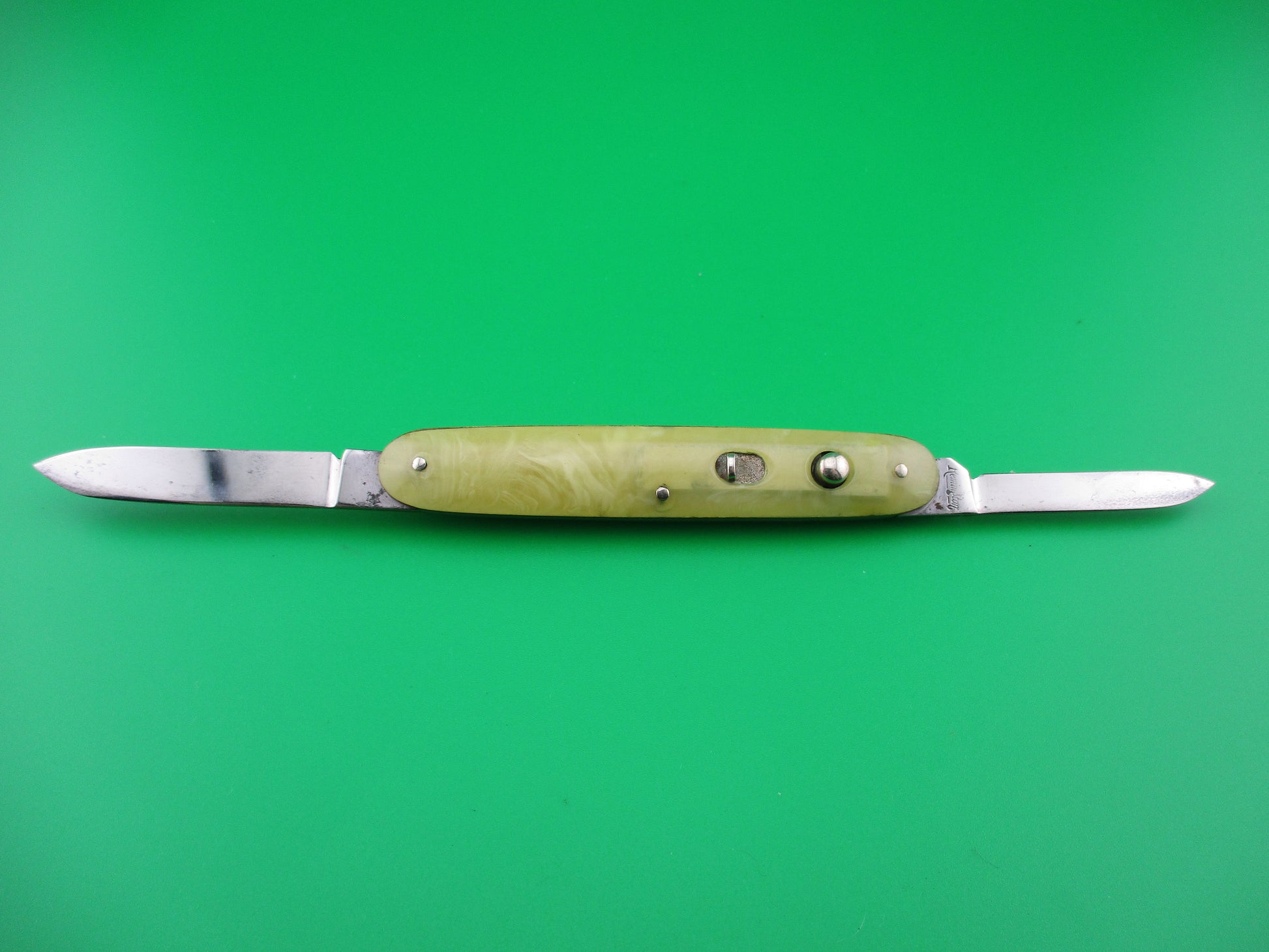 Vintage Remington double switchblade made by the George Schrade Knife Co of Bridgeport, CT in the late 1930s, early 40s under contract by Remington. It was designated the model R8065 MW and still has the original Copper Beryllium spring. The knife measures 3 3/8 inches closed and 7 1/8 inches with both blades open and has brass liners and nickel silver buttons and safeties. The blades are both full and retain all of the original factory finish including an acid etch on the face of the main blade that reads Remington Master Knife with a small pitted area near the tip of the blade. Both blades are stamped Remington on the front. The large blade would normally be stamped R8065 on the back of the tang , but this one does not have that. Pretty sure they just missed it in production. The knife works well with both blade tips seating below the liners closed, both open strong. Large blade has tight lockup open, small blade has slight up and down and a little kickback. Safeties both work. EX+ condition overall.