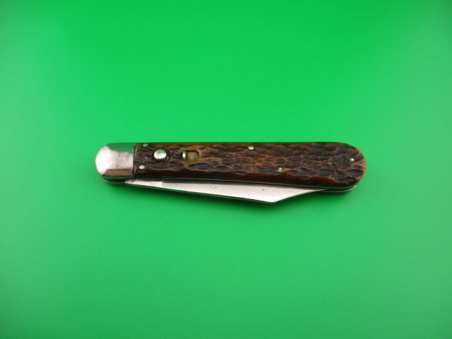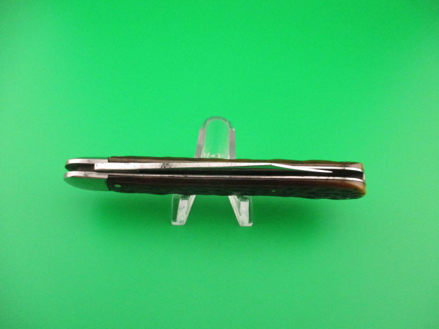 Vintage Remington R2403 Hunter switchblade made under contract by the Geo Schrade Knife Co of Bridgeport, CT between 1937 and 1944. The knife measures 5 inches closed and 8 3/8" open with steel liners and bolsters and nickel silver button and safety. The clip blade is 92% full and shiny with some scratches and some tiny pits and the tang is stamped Remington, underlined, but hard to read because of pitting. Backside is stamped R2403. The bone scales are in excellent condition with no cracks or chips. The knife works well with the blade tip below liners, good snap and locks open kinda loose with about 1/4 inch up and down at the tip and a little side to side. Rattles if shaken with blade open. Safety works. EX condition.