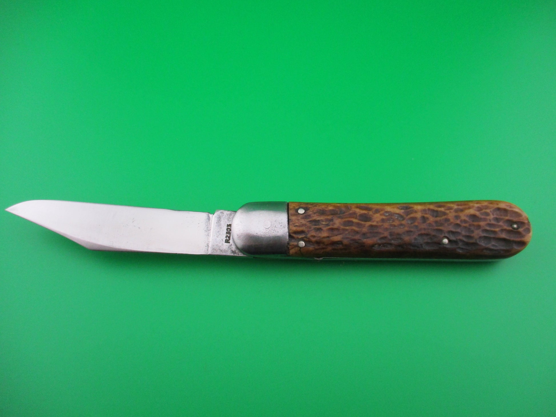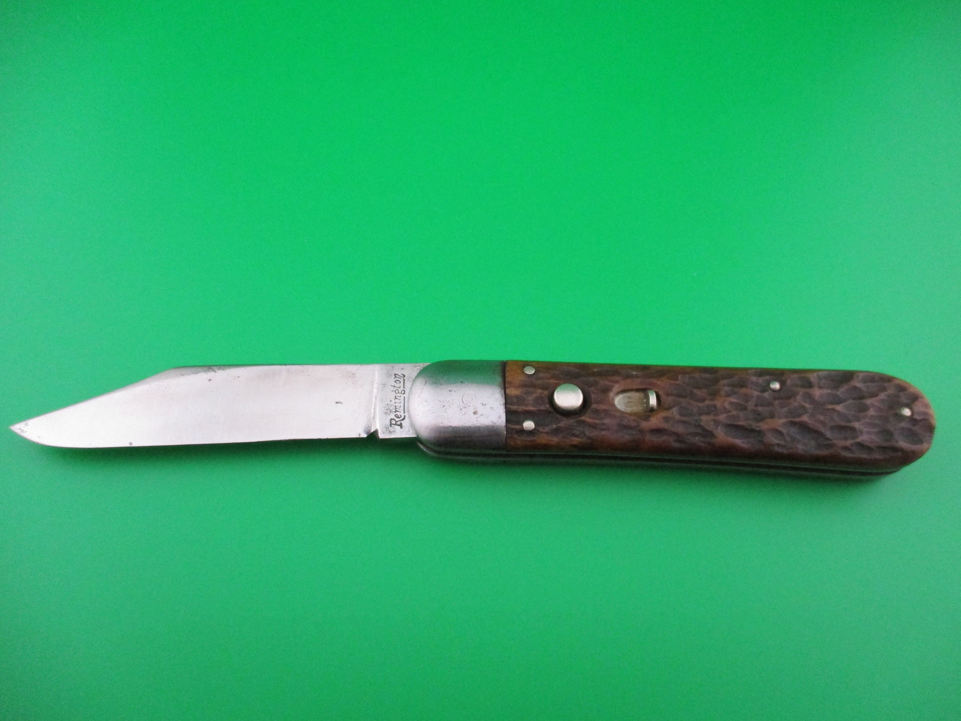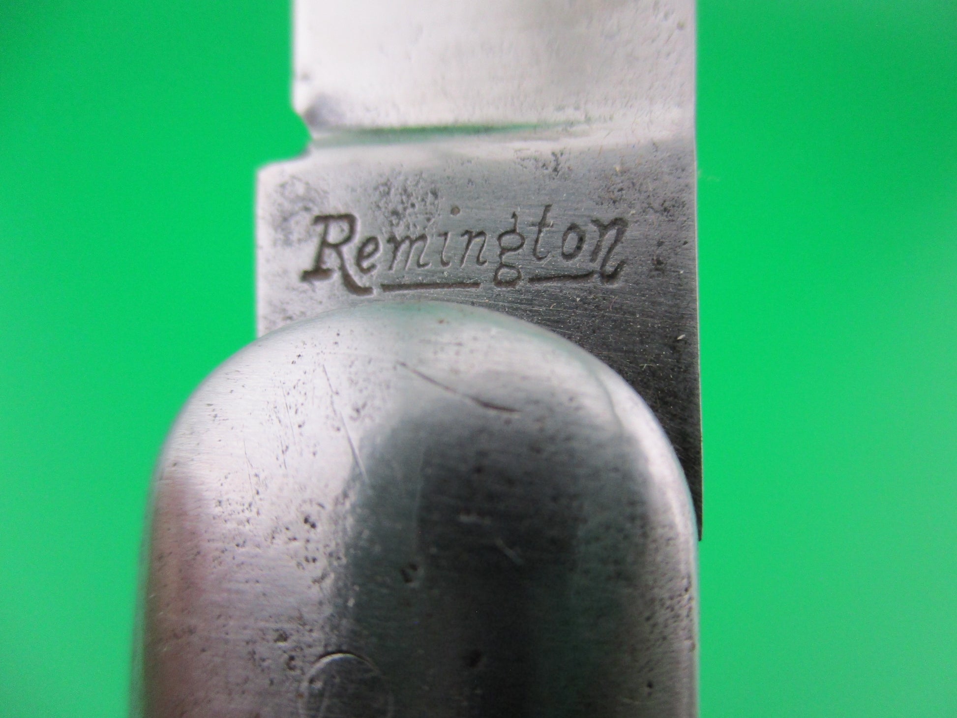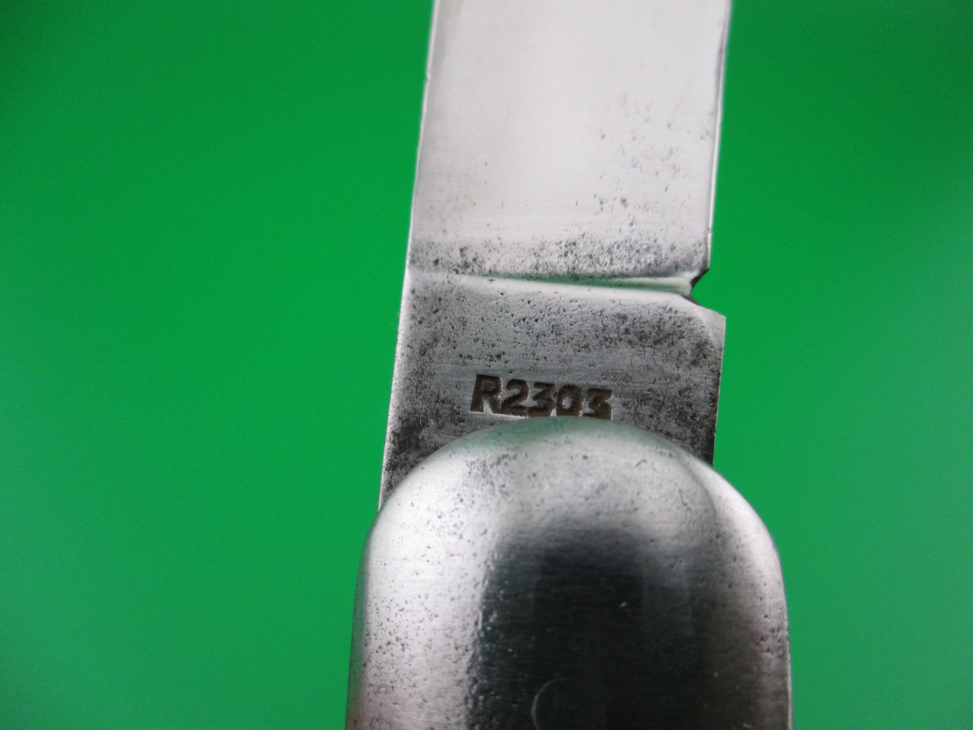 Here is a nice vintage Remington R2303 switchblade knife. This knife was made under contract by the George Schrade Knife Co of Bridgeport, CT sometime between 1938 and 1944. Pretty much the same knife as the Presto model 1000, but the bone jig pattern is different, they used copper beryllium springs and of course the tang is stamped Remington and the backside is stamped R2303. The knife measures 4 1/8 inches closed and 7 1/8 inches open and it has steel liners and bolsters. The blade appears to be nearly full and has been lightly cleaned so it's shiny, similar to original finish. The jigged bone scales are in great condition. The knife works properly with the blade tip seating below the liners when closed, good snap and good lockup when open. Nice old Remington switchblade knife.