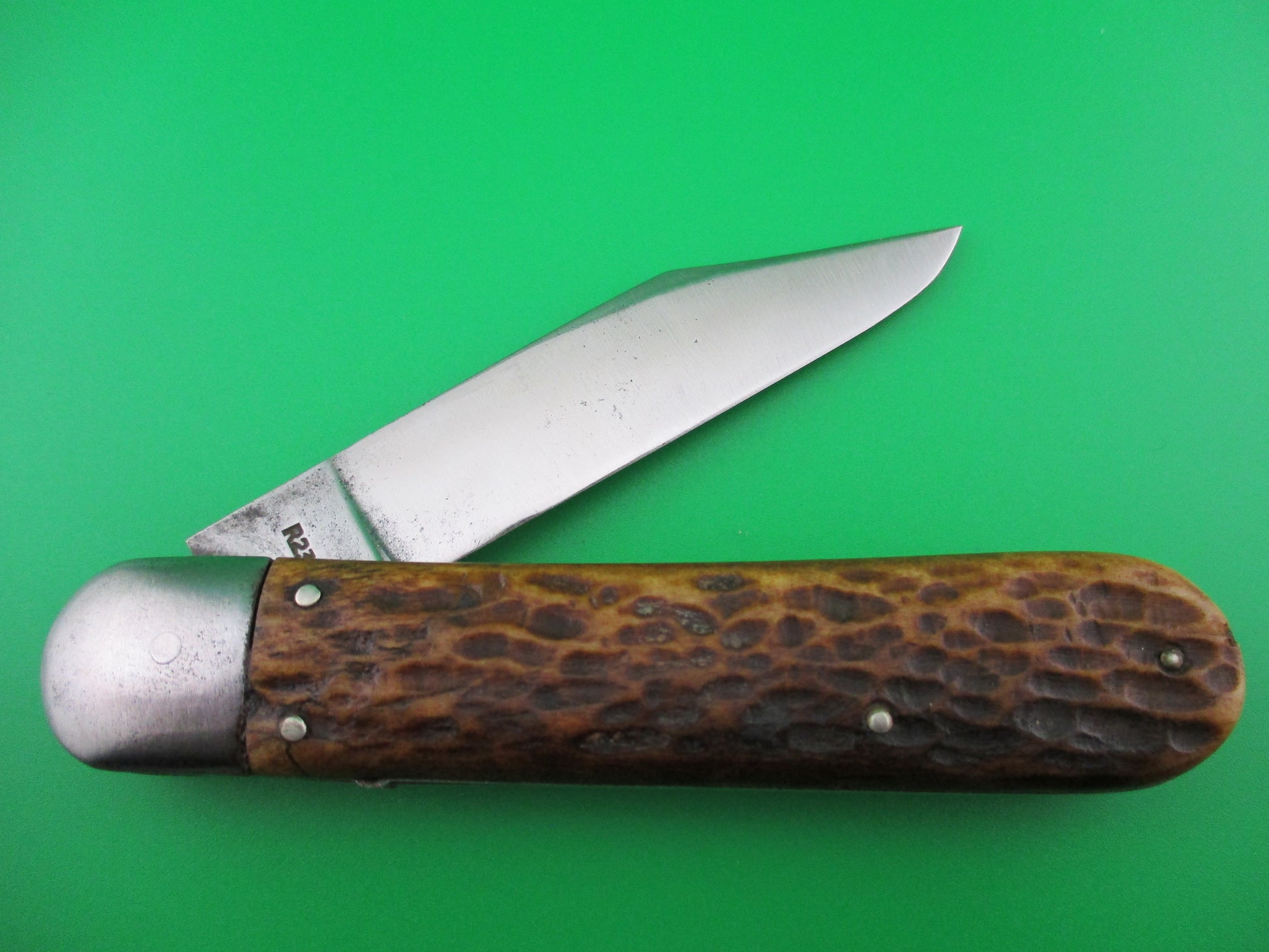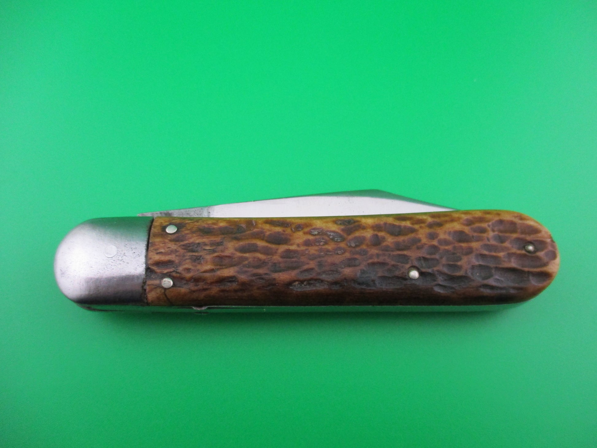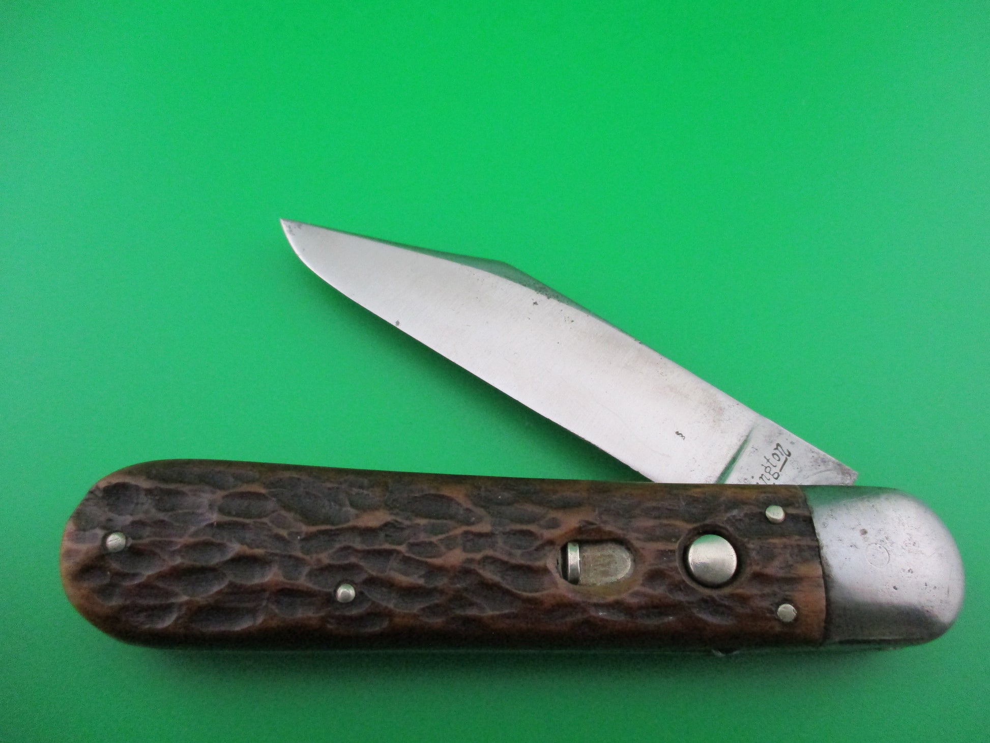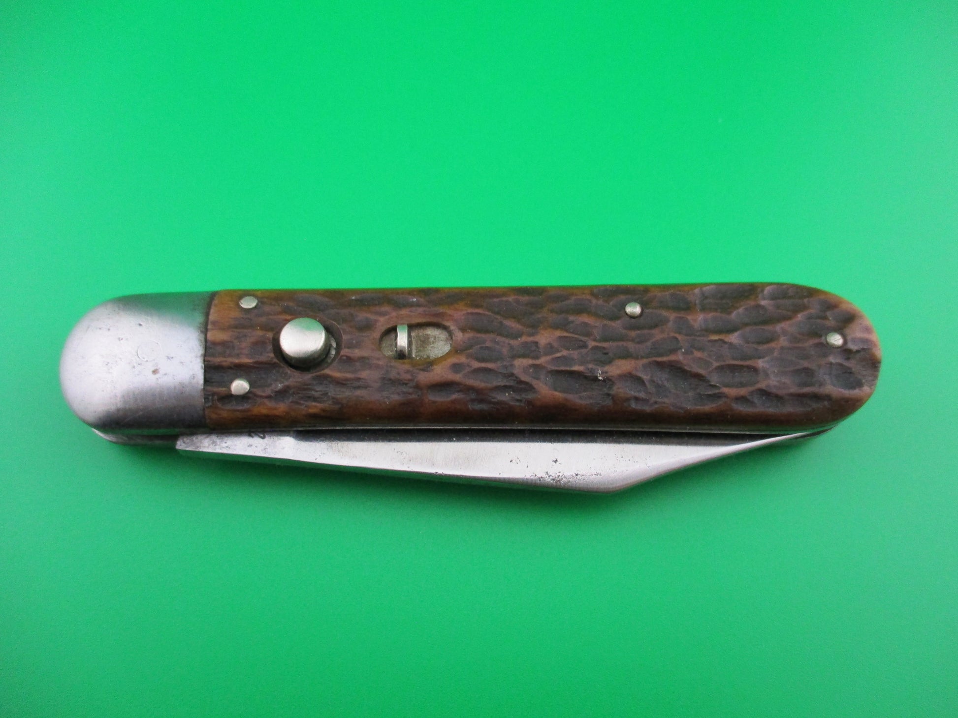 Here is a nice vintage Remington R2303 switchblade knife. This knife was made under contract by the George Schrade Knife Co of Bridgeport, CT sometime between 1938 and 1944. Pretty much the same knife as the Presto model 1000, but the bone jig pattern is different, they used copper beryllium springs and of course the tang is stamped Remington and the backside is stamped R2303. The knife measures 4 1/8 inches closed and 7 1/8 inches open and it has steel liners and bolsters. The blade appears to be nearly full and has been lightly cleaned so it's shiny, similar to original finish. The jigged bone scales are in great condition. The knife works properly with the blade tip seating below the liners when closed, good snap and good lockup when open. Nice old Remington switchblade knife.