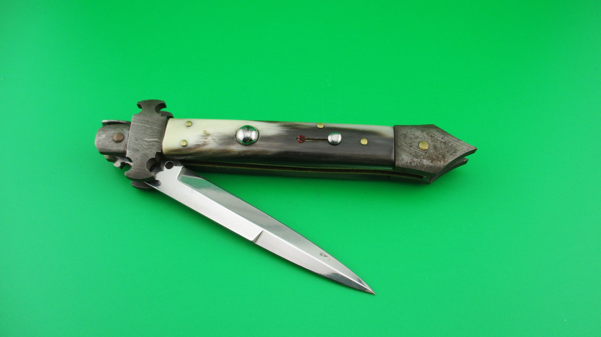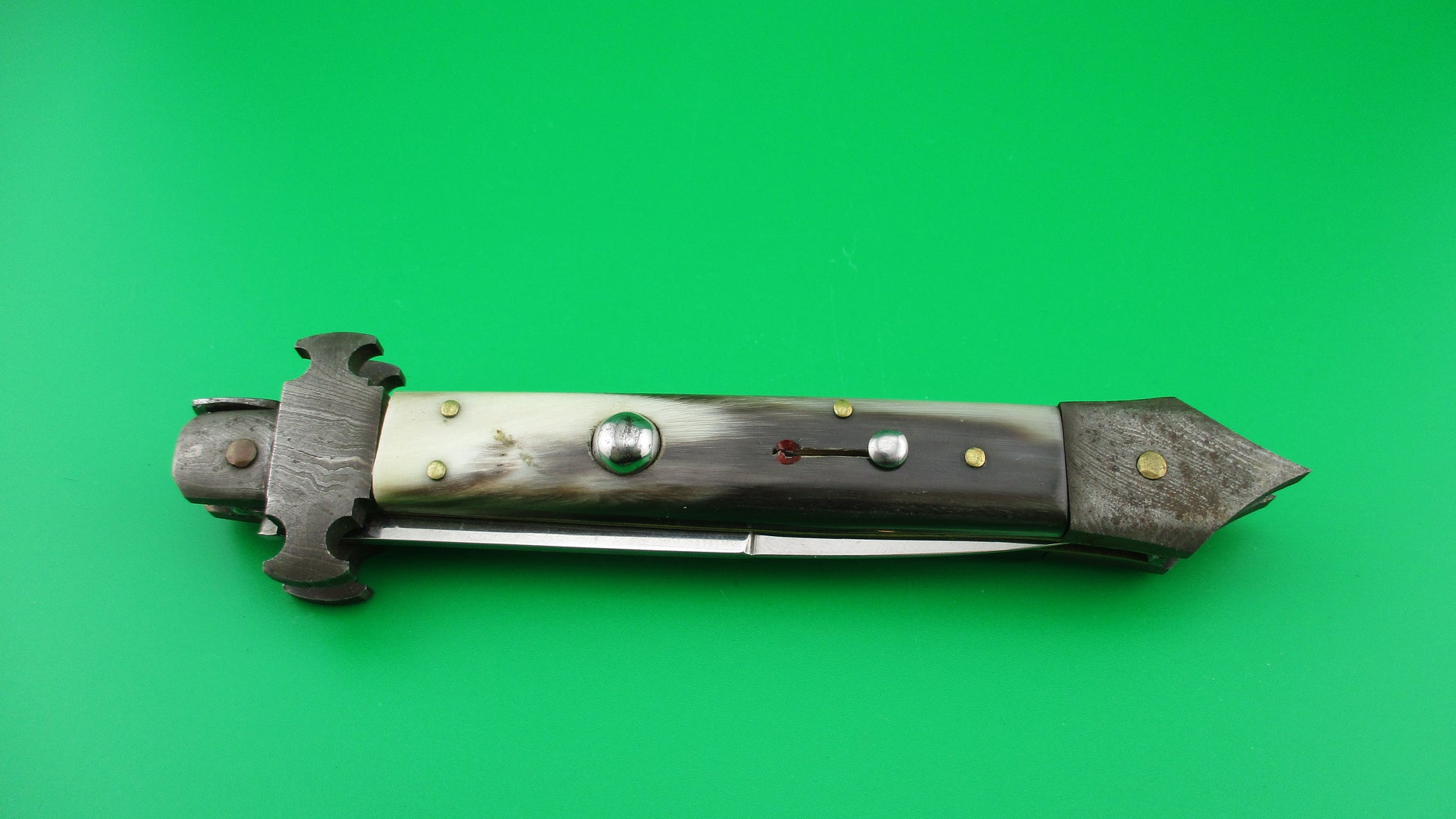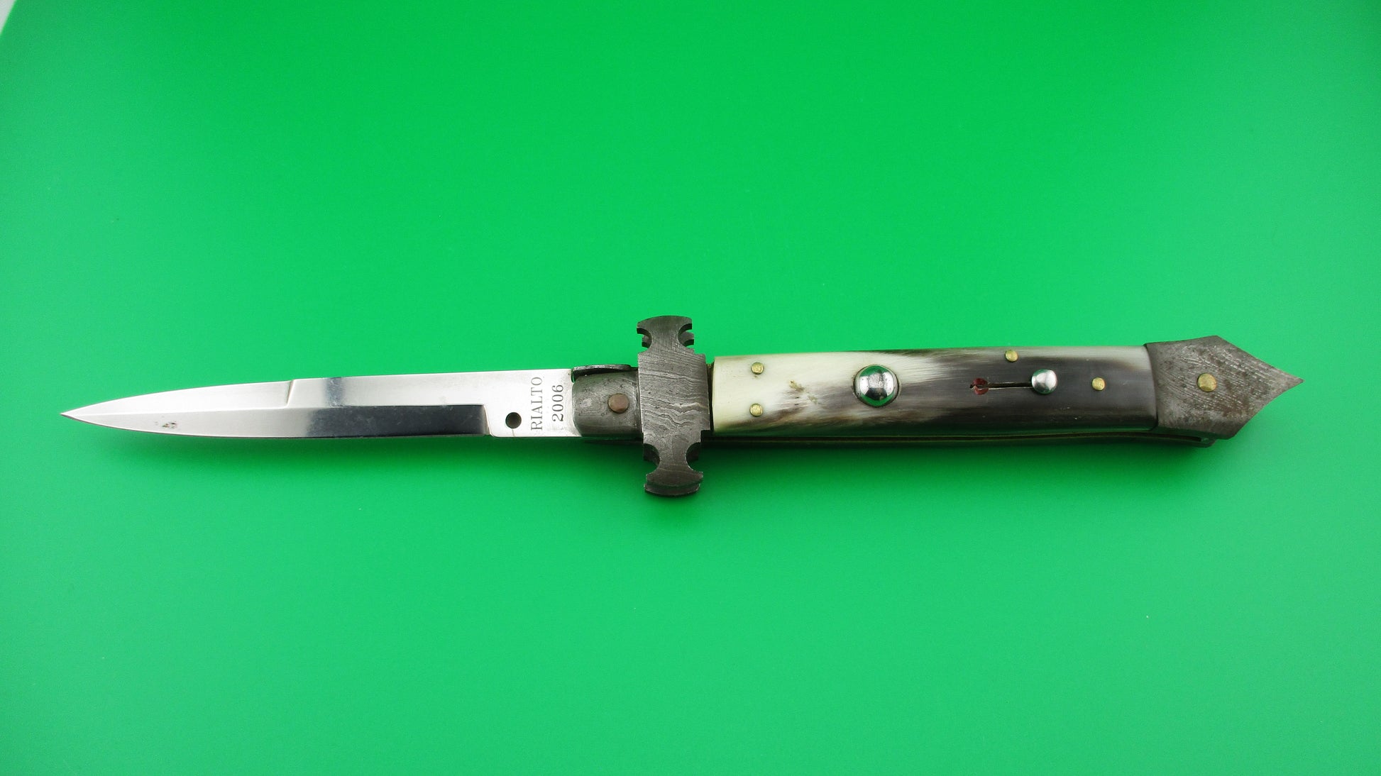 Here's an unusual Custom, or customized vintage Italian 24cm automatic knife with Damascus custom bolsters with spike at the bottom/back. It measures 23.5cm (9 1/4 inches) open with brass liners, Damascus steel bolsters, stainless steel button and safety. The bayonet style blade is 100% full with factory finish and the ricasso is etched RIALTO 2006. The scales are genuine Brazilian horn with front scale black & cream and the rear scale ranging from translucent green, to tan & cream with a little black on the edge and are in very nice condition. Although this was originally a swivel bolster knife and the replacement front bolster does swivel, it doesn't swivel far enough to release the blade to be closed, so works better as a picklock where you lift the locking tab with your thumbnail. The knife works well with blade tip deep and centered in the well closed, strong snap and good lockup with about 1/16" up and down at the tip. Barely rattles if shaken with blade open. I believe that a RIALTO 2006 knife was used in the Crystal Skull Raiders of the Lost Ark movie. Safety works. EX+ condition.
