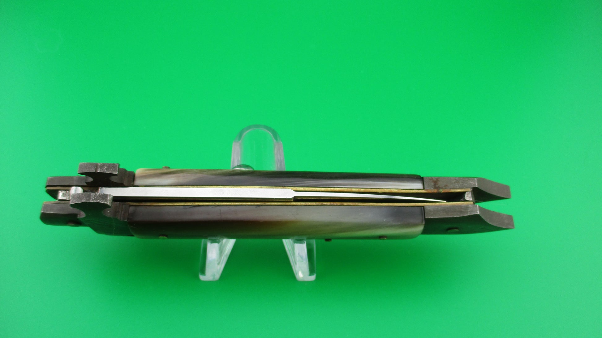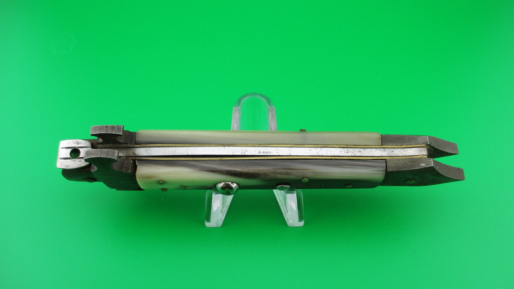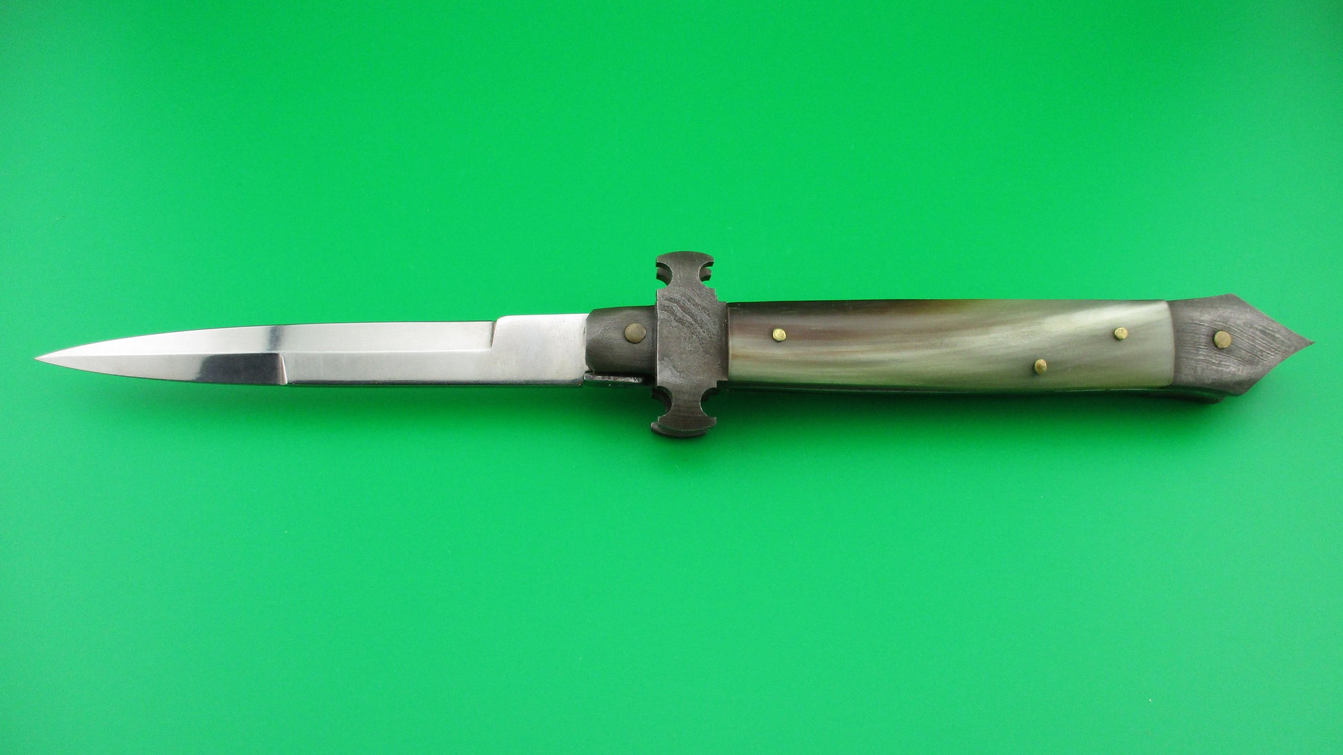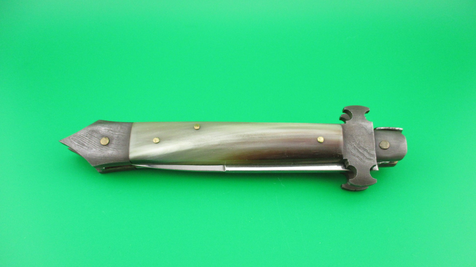 Here's an unusual Custom, or customized vintage Italian 24cm automatic knife with Damascus custom bolsters with spike at the bottom/back. It measures 23.5cm (9 1/4 inches) open with brass liners, Damascus steel bolsters, stainless steel button and safety. The bayonet style blade is 100% full with factory finish and the ricasso is etched RIALTO 2006. The scales are genuine Brazilian horn with front scale black & cream and the rear scale ranging from translucent green, to tan & cream with a little black on the edge and are in very nice condition. Although this was originally a swivel bolster knife and the replacement front bolster does swivel, it doesn't swivel far enough to release the blade to be closed, so works better as a picklock where you lift the locking tab with your thumbnail. The knife works well with blade tip deep and centered in the well closed, strong snap and good lockup with about 1/16" up and down at the tip. Barely rattles if shaken with blade open. I believe that a RIALTO 2006 knife was used in the Crystal Skull Raiders of the Lost Ark movie. Safety works. EX+ condition.